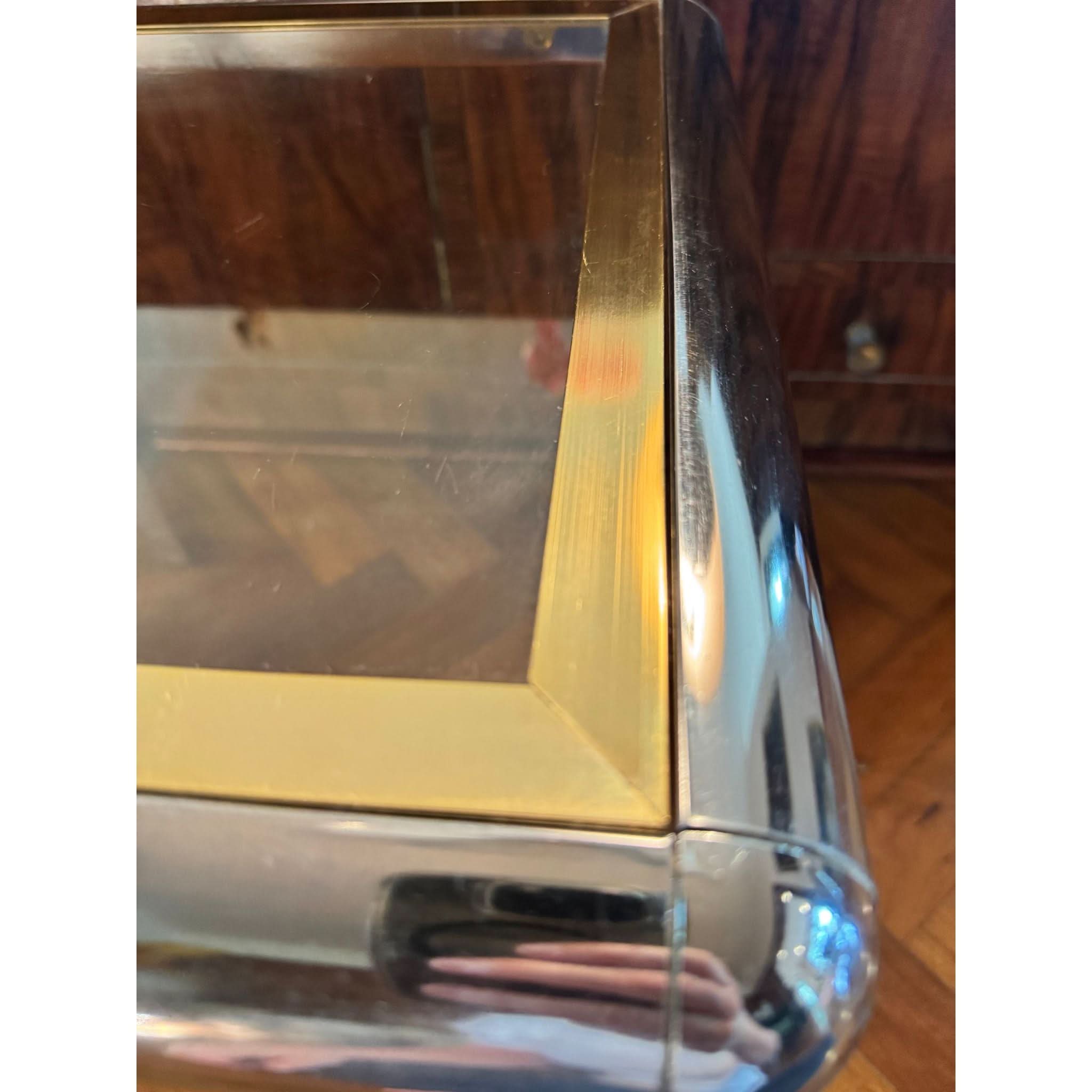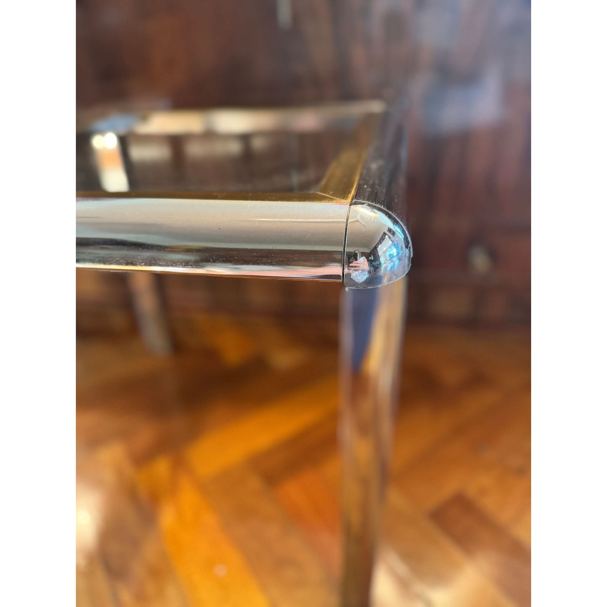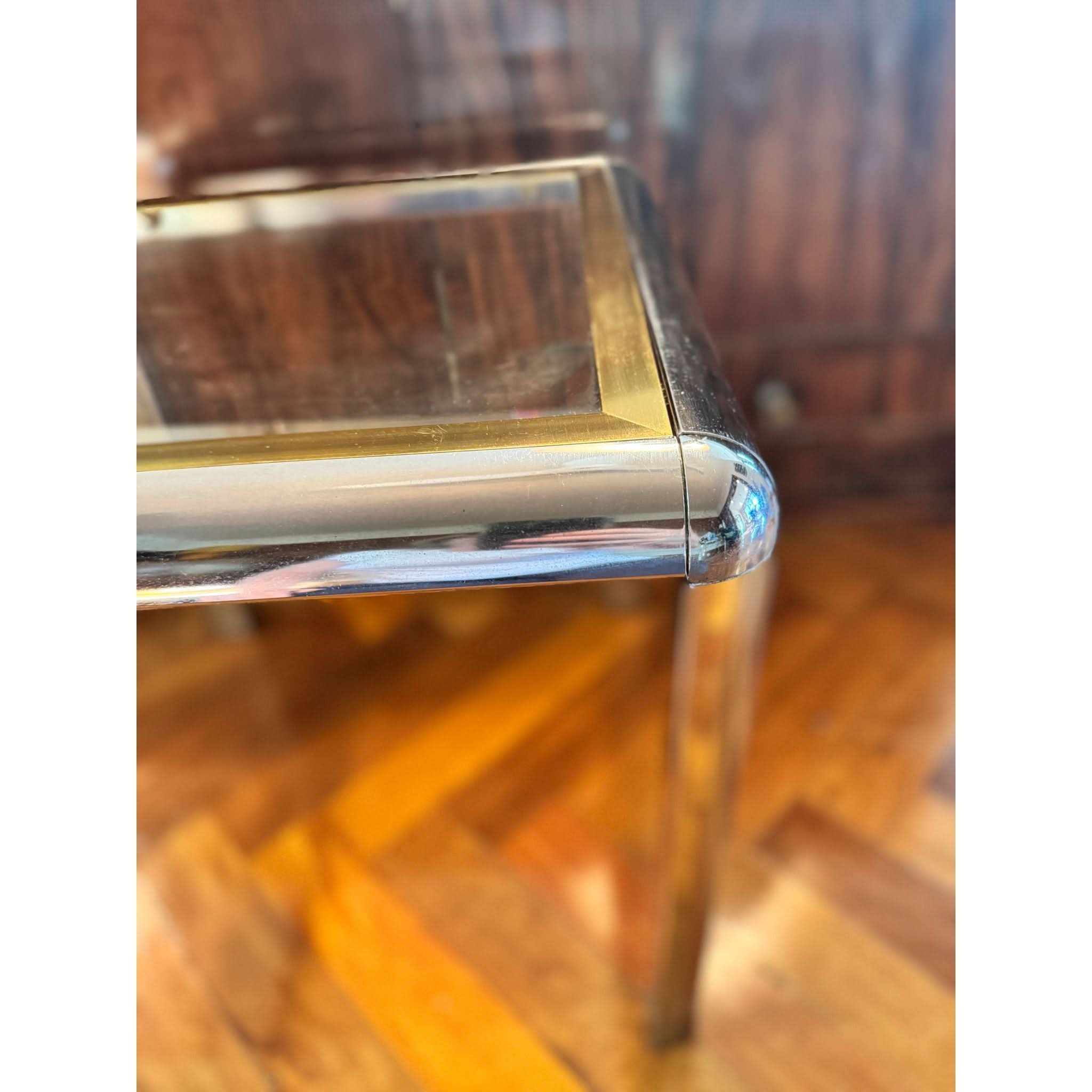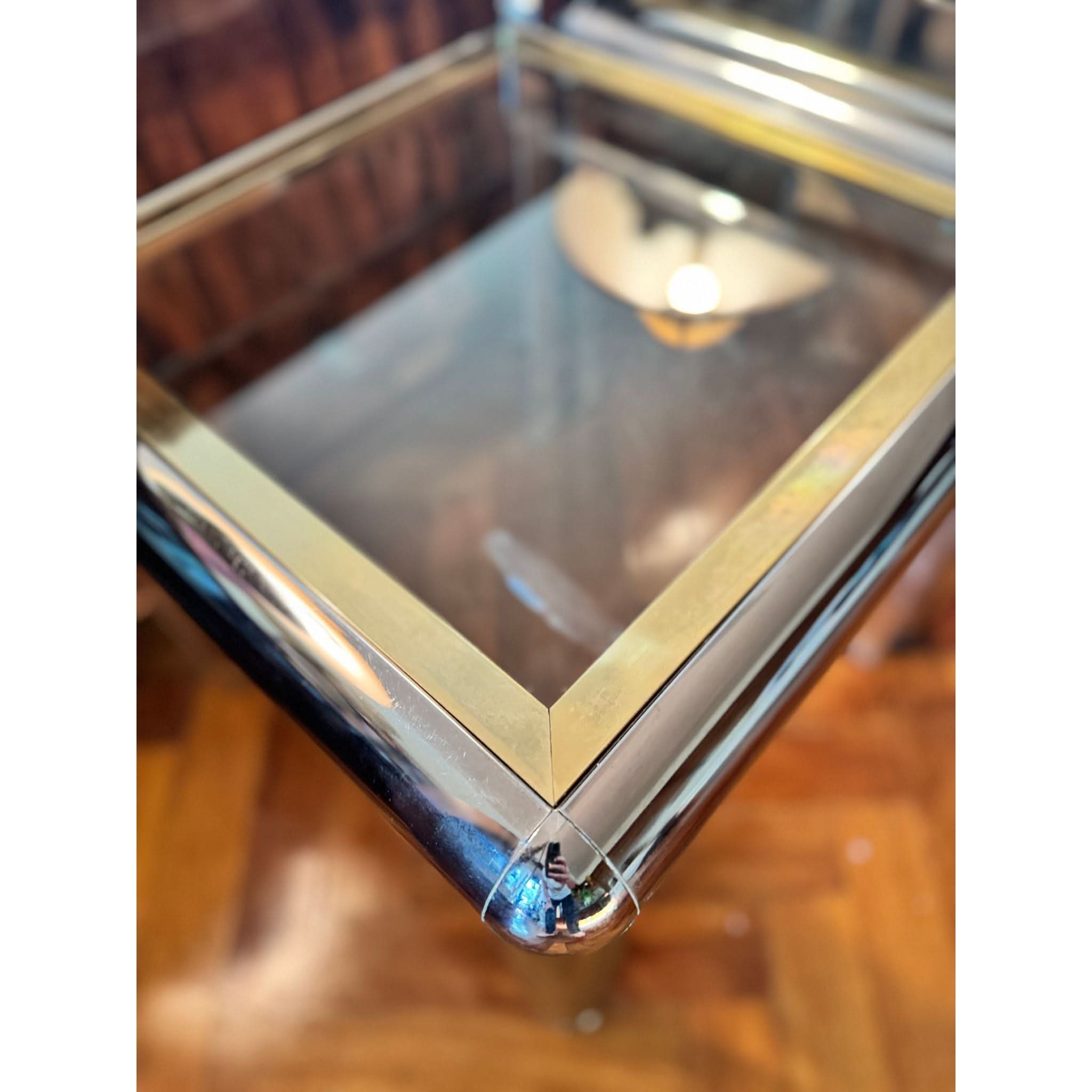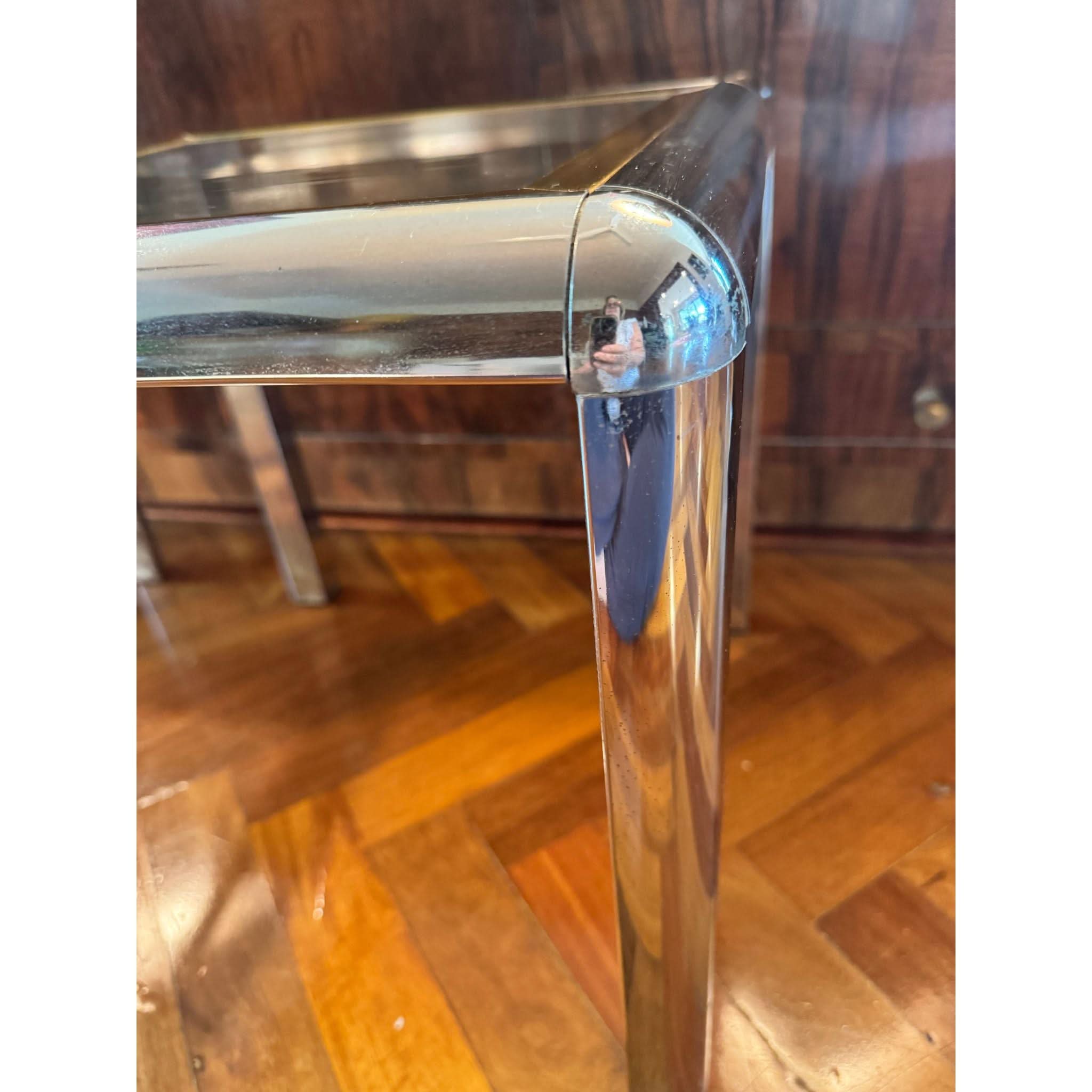 This fabulous set of 1970s tubular tables is made all the more punchy by the addition of a brass trim insert. Maker unknown but very much in the style of DIA (Design Institute of America). Comprising of a pair of side tables and a longer, higher coffee table. 2 x Side tables 42 x 42 x 40 high Coffee table 67.5 x 47 x 49 high
