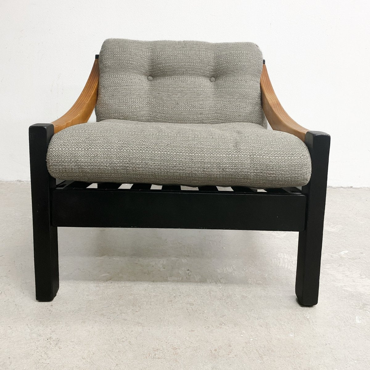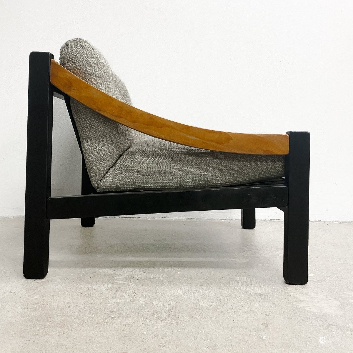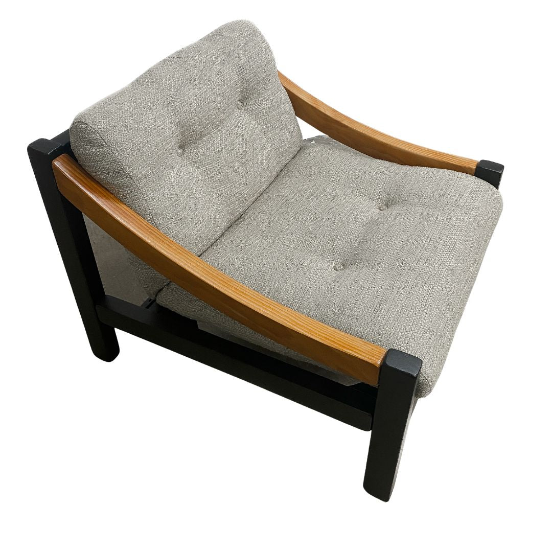 1970's Mid century Australian armchair made in the style of Vico Magistretti, The frame fully restored with new high grade upholstery straps added. The cushions are the original wool upholstery.