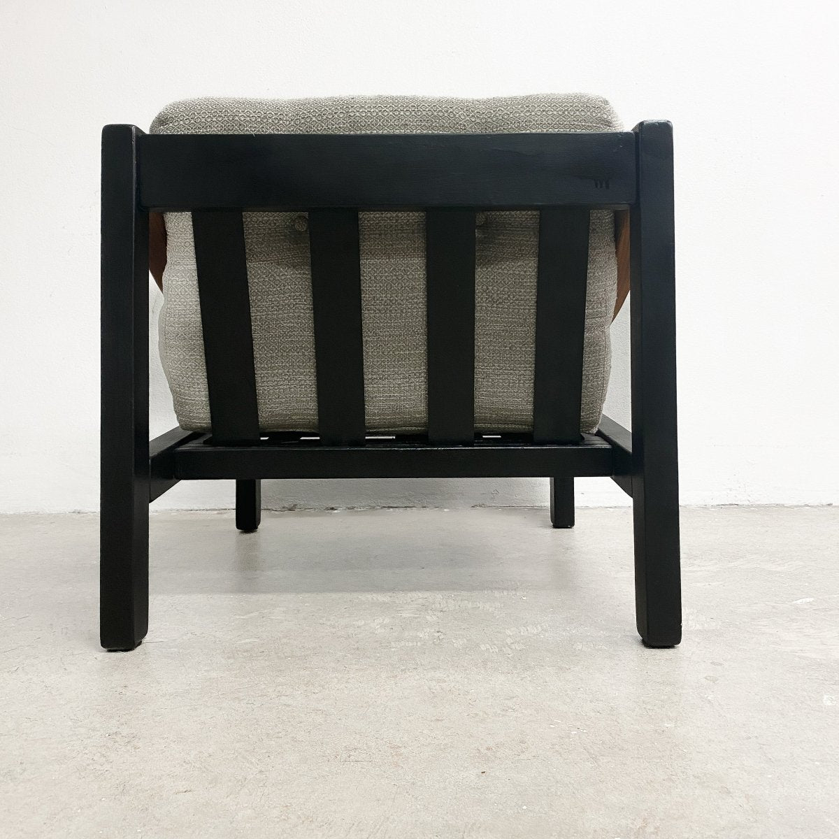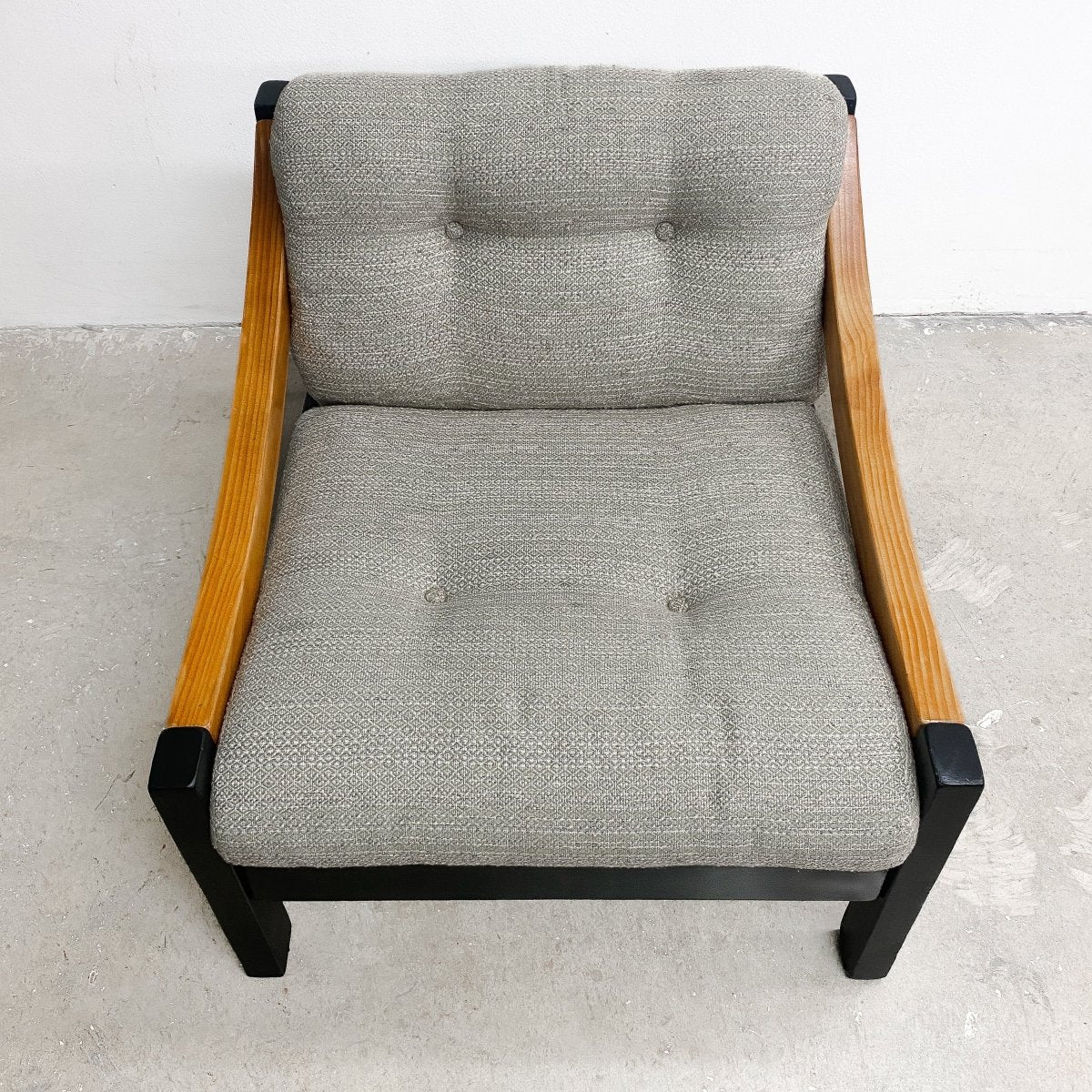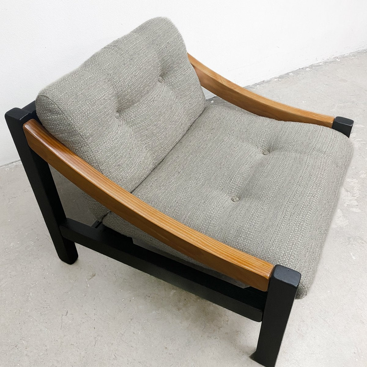 1970's Mid century Australian armchair made in the style of Vico Magistretti, The frame fully restored with new high grade upholstery straps added. The cushions are the original wool upholstery.