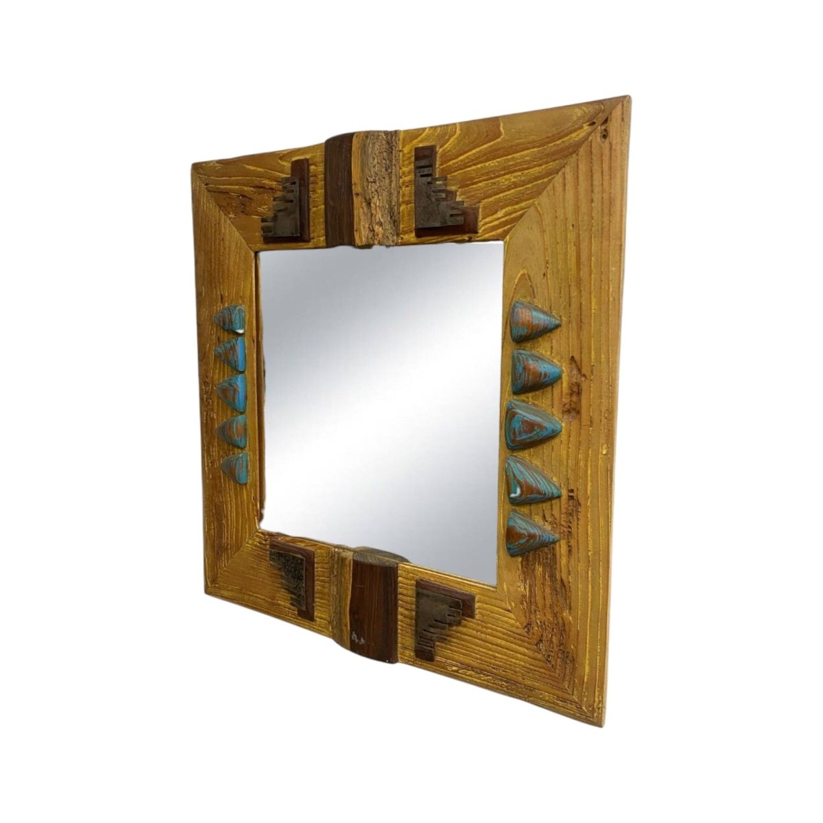 1980s postmodern mirror features a handcrafted wooden frame with Southwestern and brutalist design elements. With sculptural inlays and striking geometric accents, it’s both a functional mirror and a conversation-starting wall piece