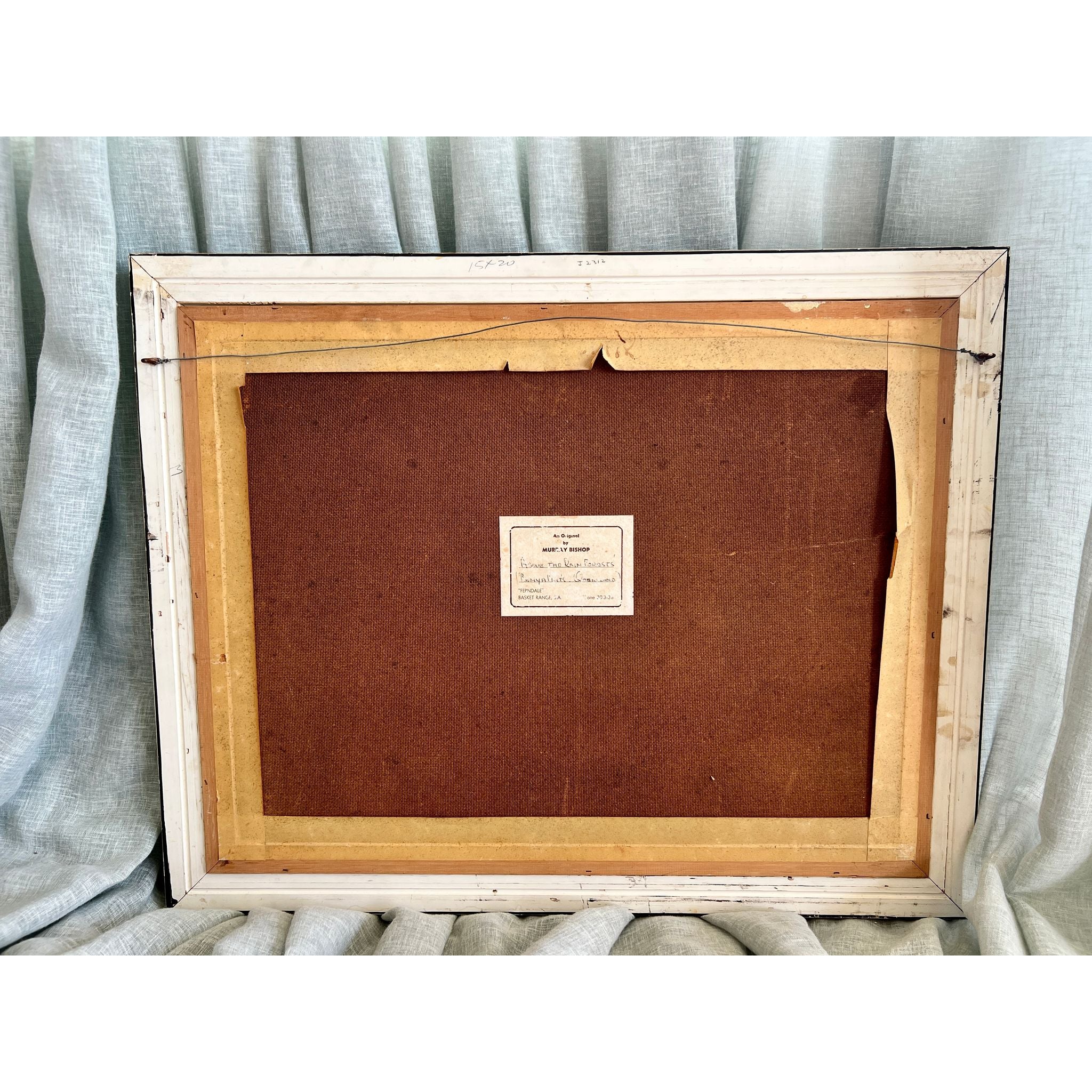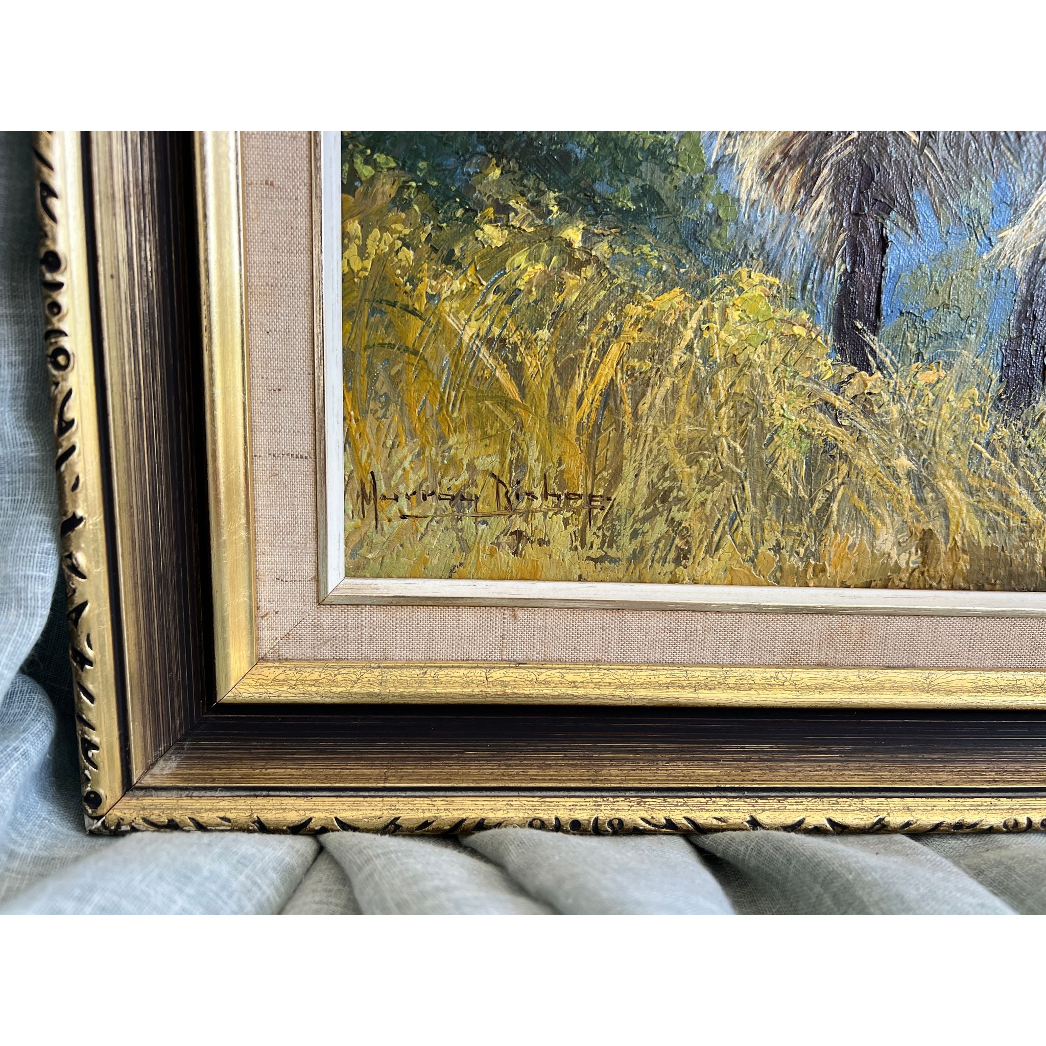 The painting is an original oil on board, presented in a classic gilt and timber frame that complements the natural palette and enhances its traditional Australian character.