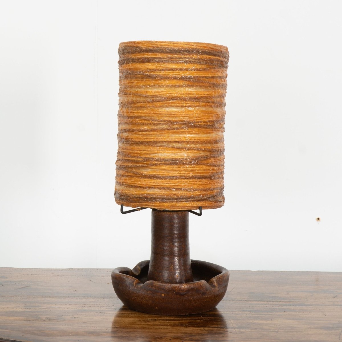 Beautiful piece of mid century modern design, with a brown ceramic base with a rope shade set in resin