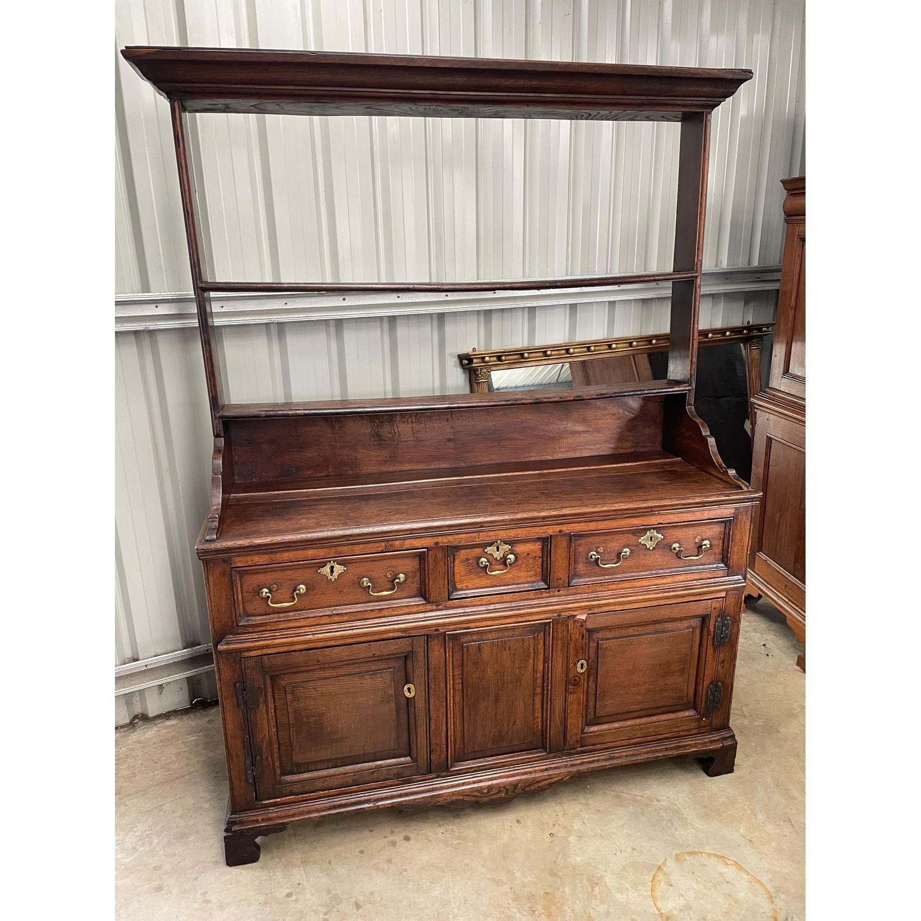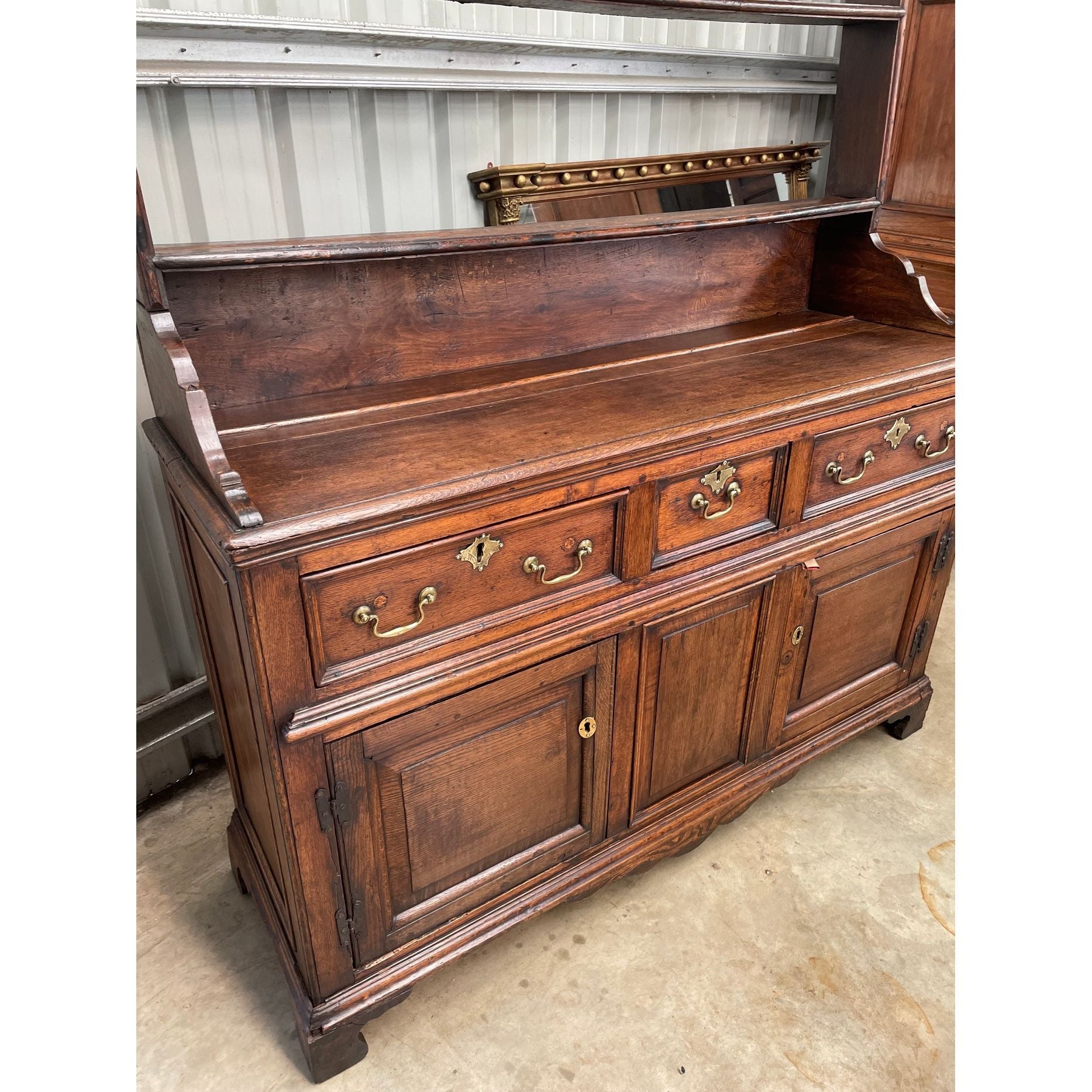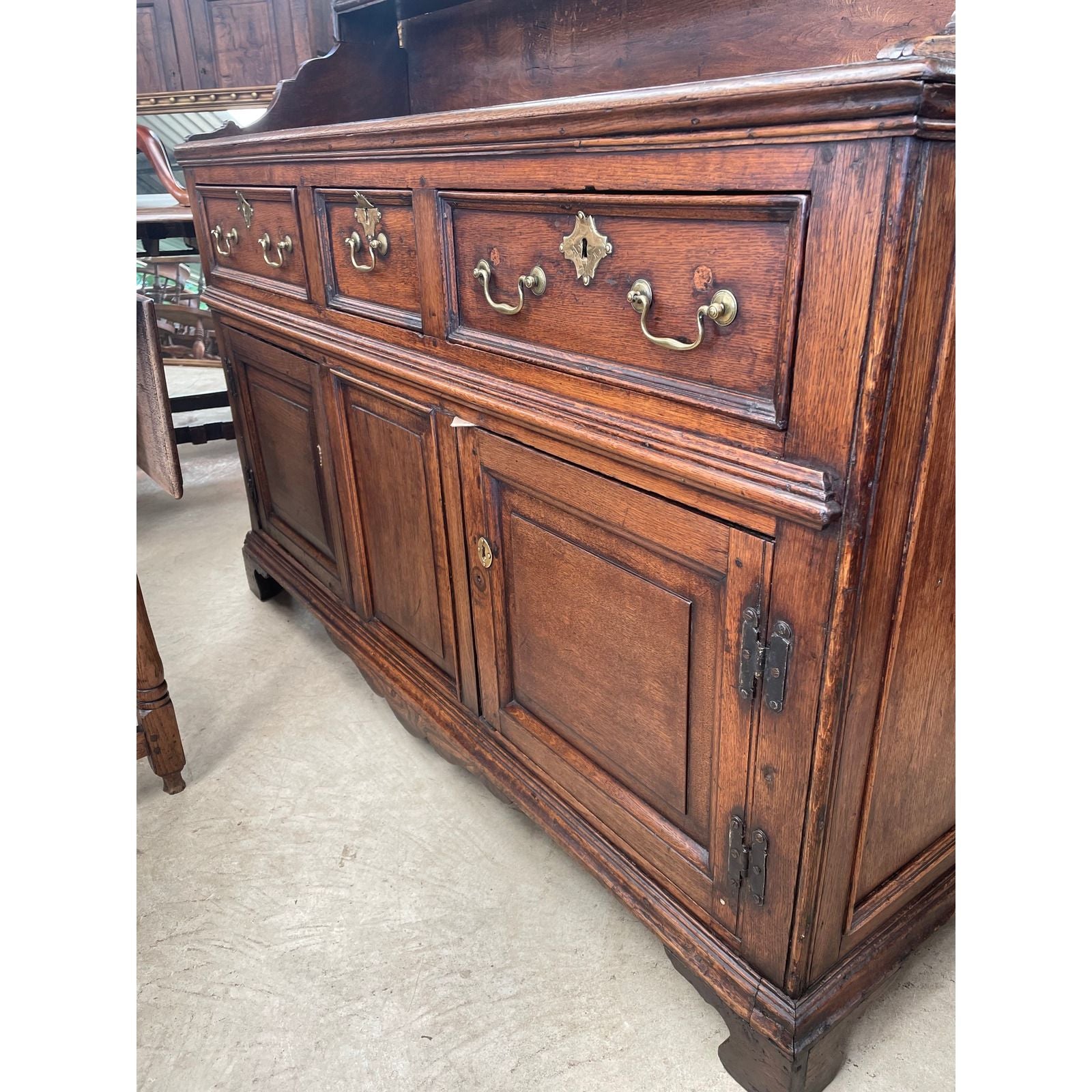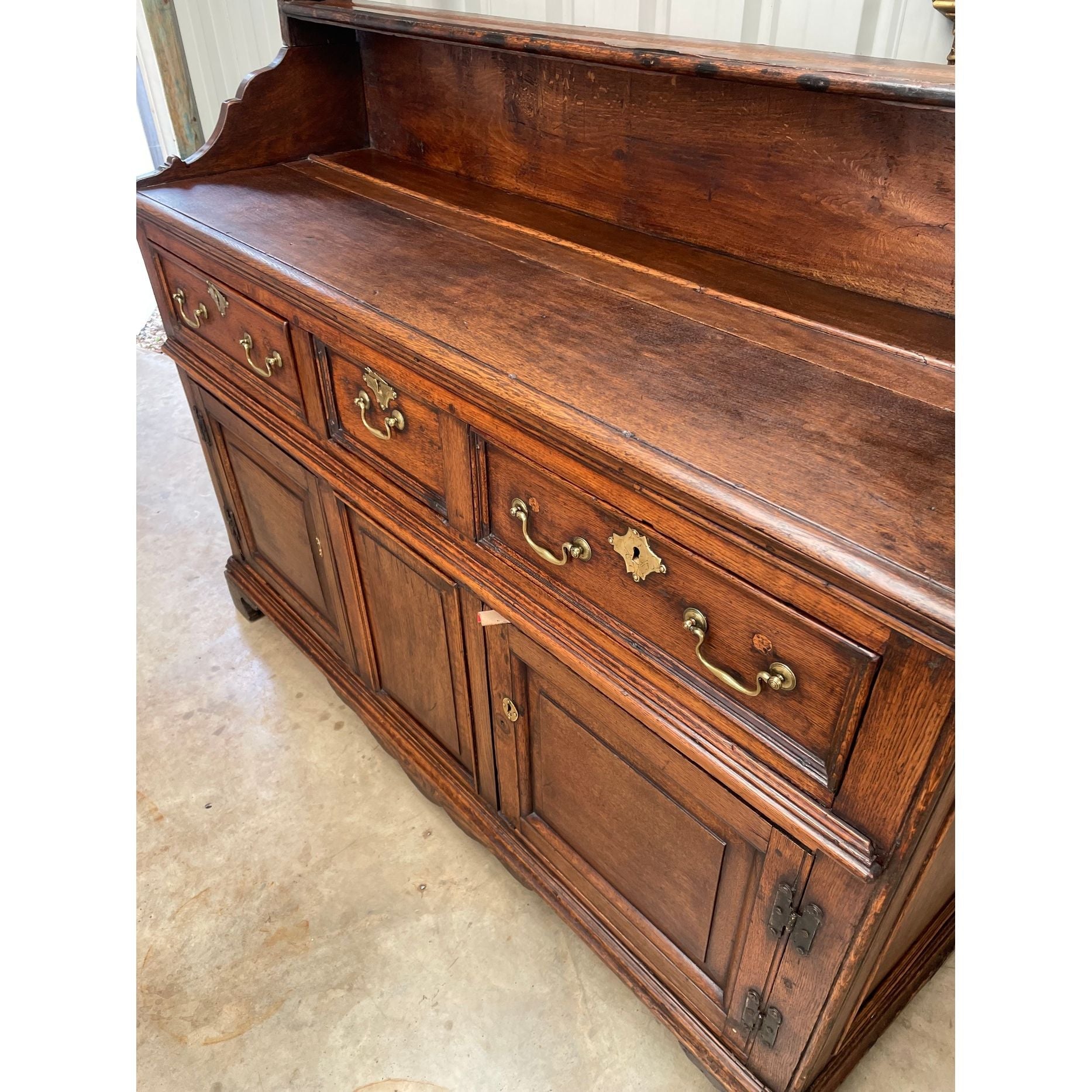 An 18th century Oak Cupboard base dresser with open shelf back. A quality antique oak country farmhouse cabinet likely constructed in the North of Wales & dating from the 1750's. Original oak planks to back & base. Later brass bale handles to drawers, but antique from the period. Original iron hinges to base doors. Open rack backs were used flush to the stone walls to allow the display of large plates/platters.