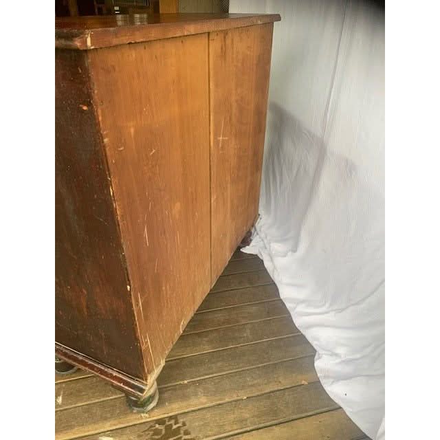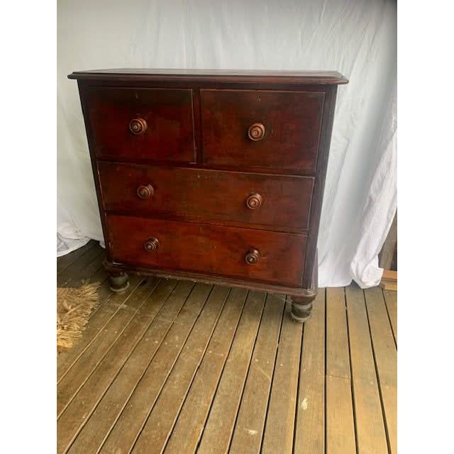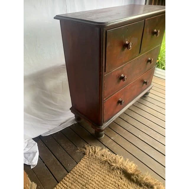 A good quality Colonial handmade kauri chest of 4 drawers with original finish on turned bun feet (we believe from Whites Joinery Morpeth NSW) Circa 1860. Original knobs. Original finish has age related wear and patina.