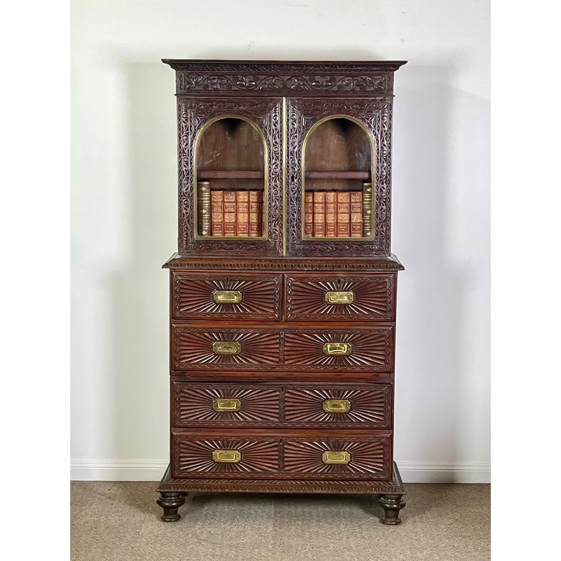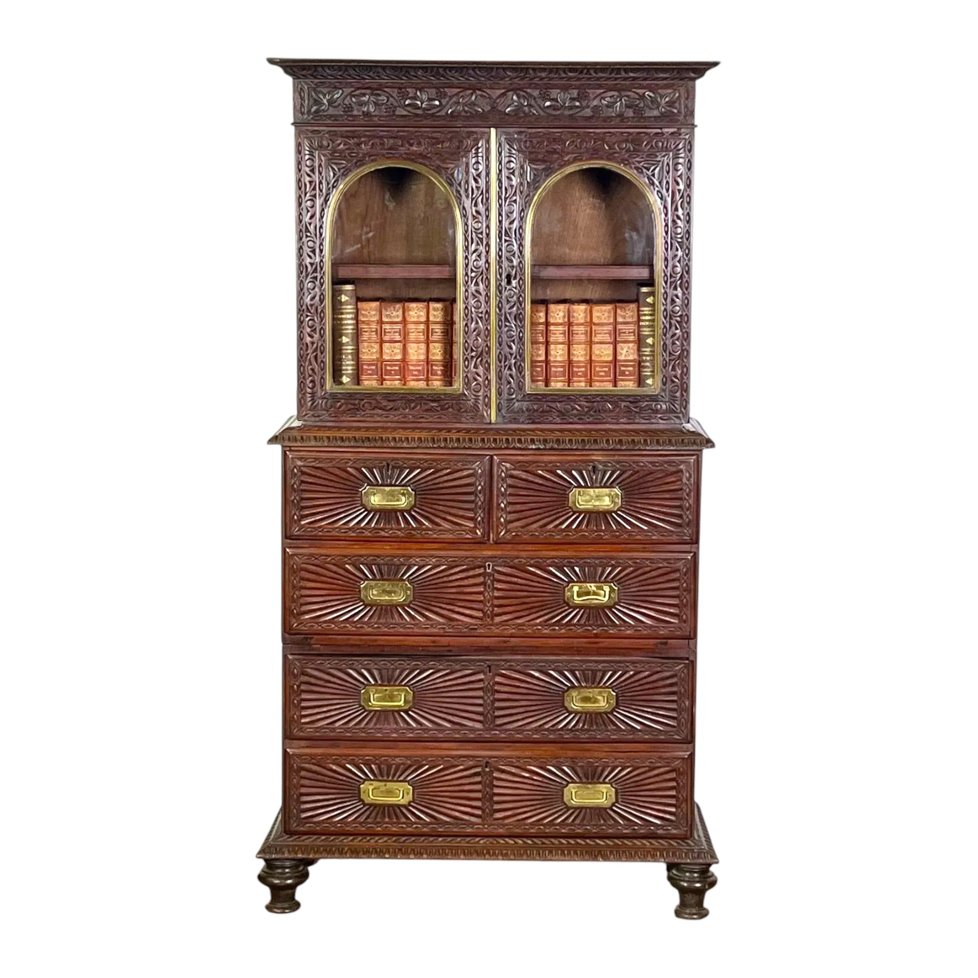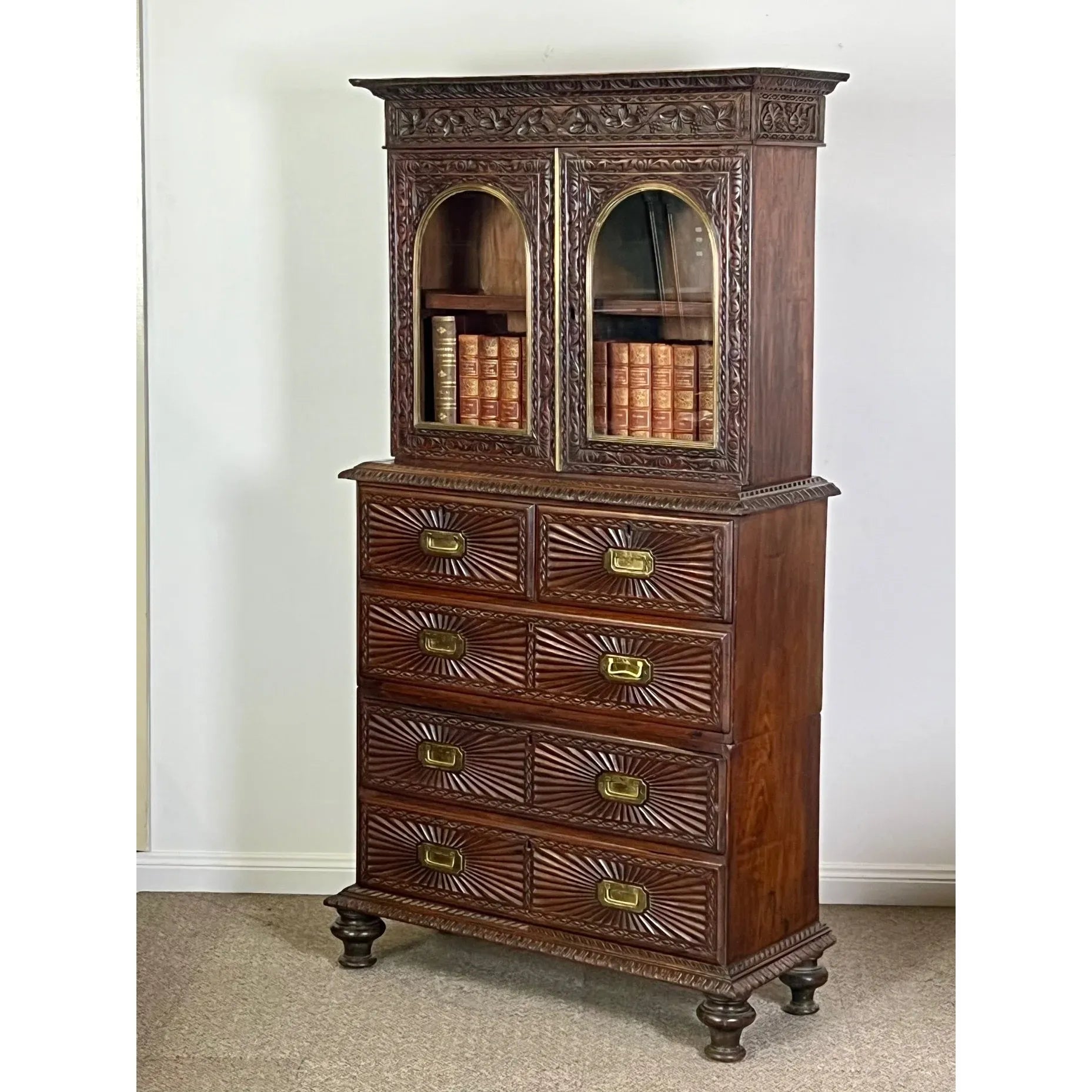 On offer is a fine quality example of compact size genuine antique Anglo Indian 19th century Victorian period combination piece of ‘campaign’ furniture comprising of a lower storage Chest of Drawers with an upper Display Cabinet / Book Case.