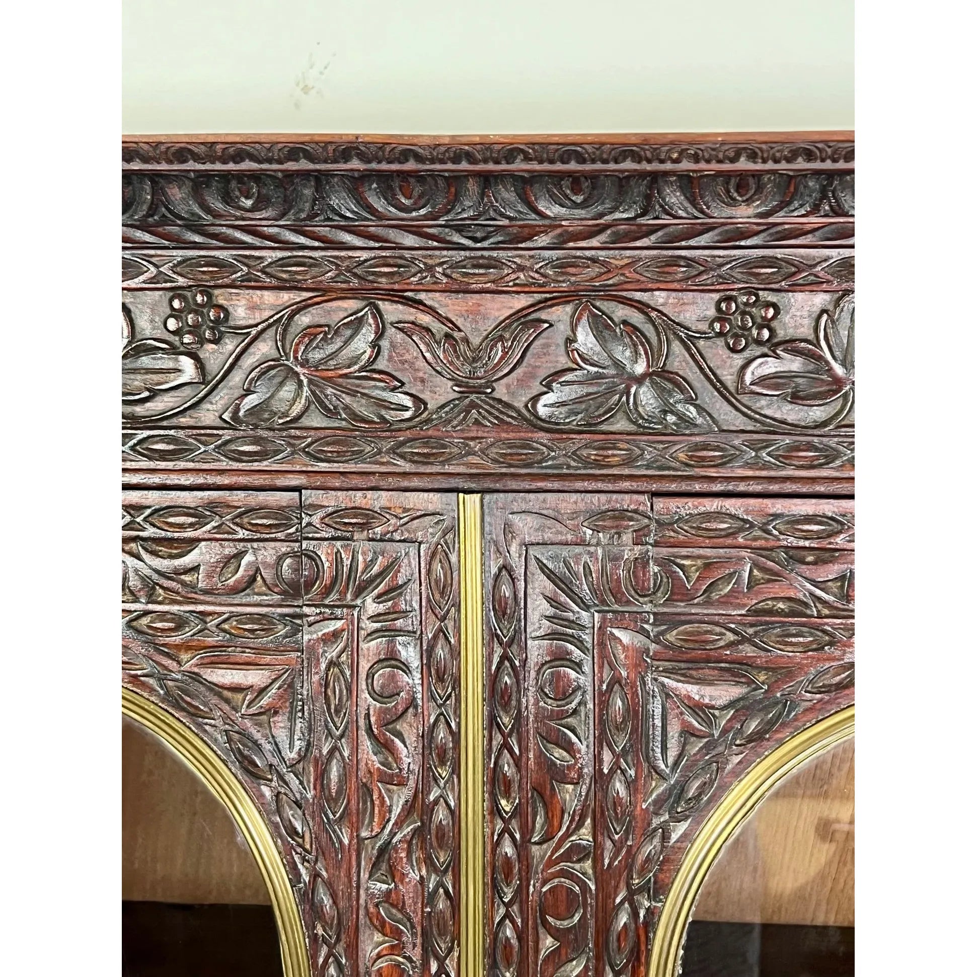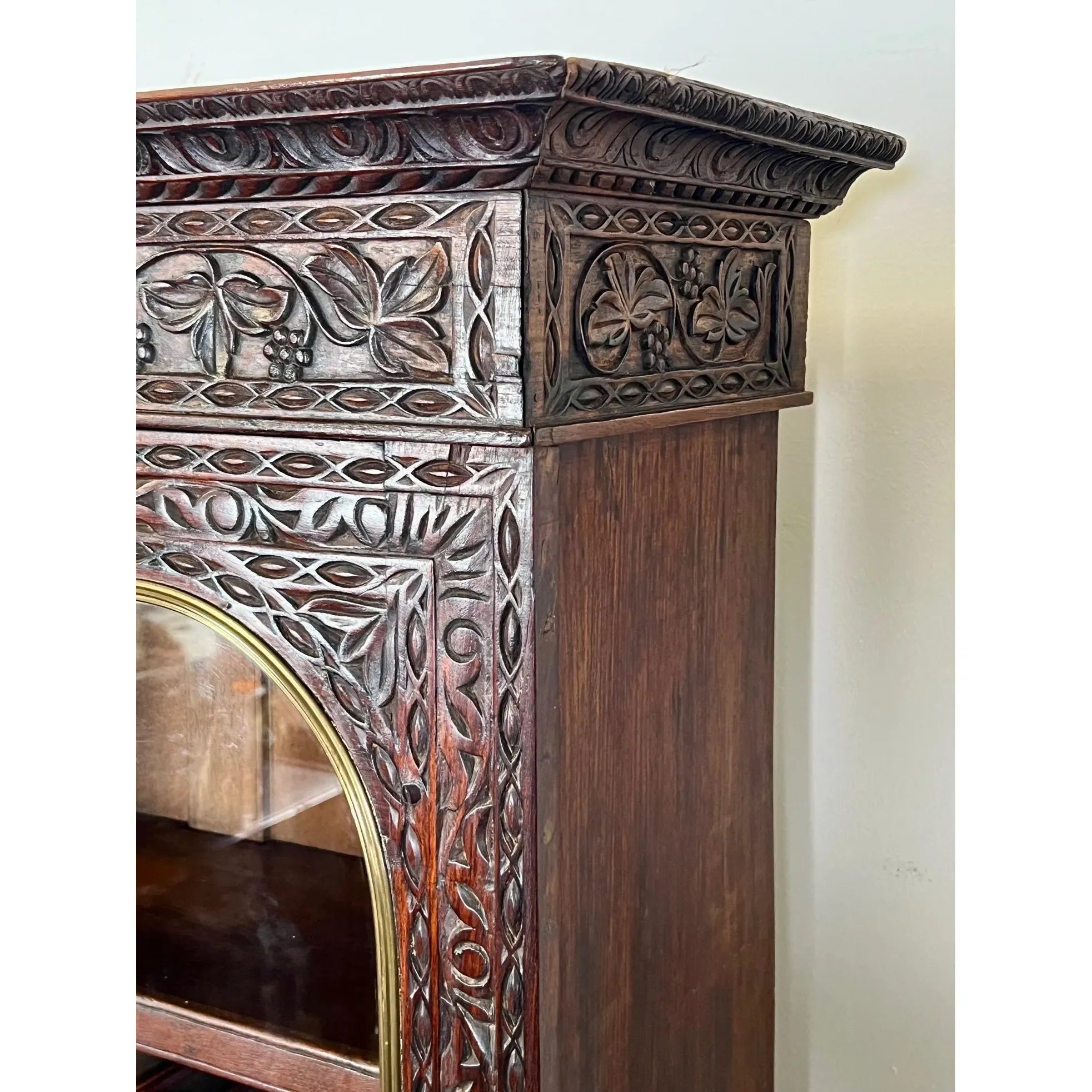 The upper Book Case / Display Cabinet for collectables or books has a cornice and pediment both profusely carved on the front and the sides. The front pair of doors frames are carved to compliment and feature glazed panels arched at the top and with brass moldings around the glass. inside the full width shelf has a raised front edge so as to prevent books etc sliding and impacting with the glass door panels whilst being transported.