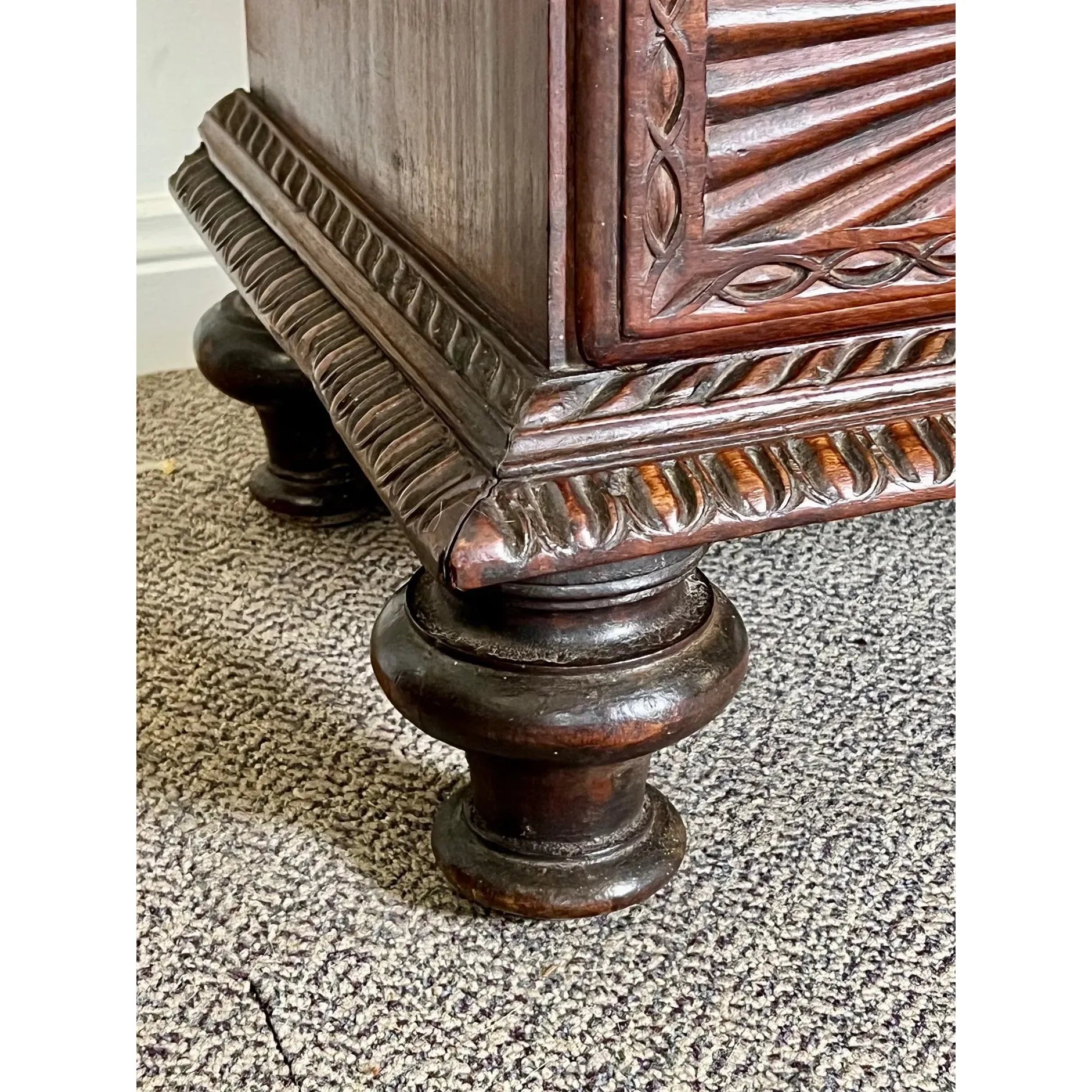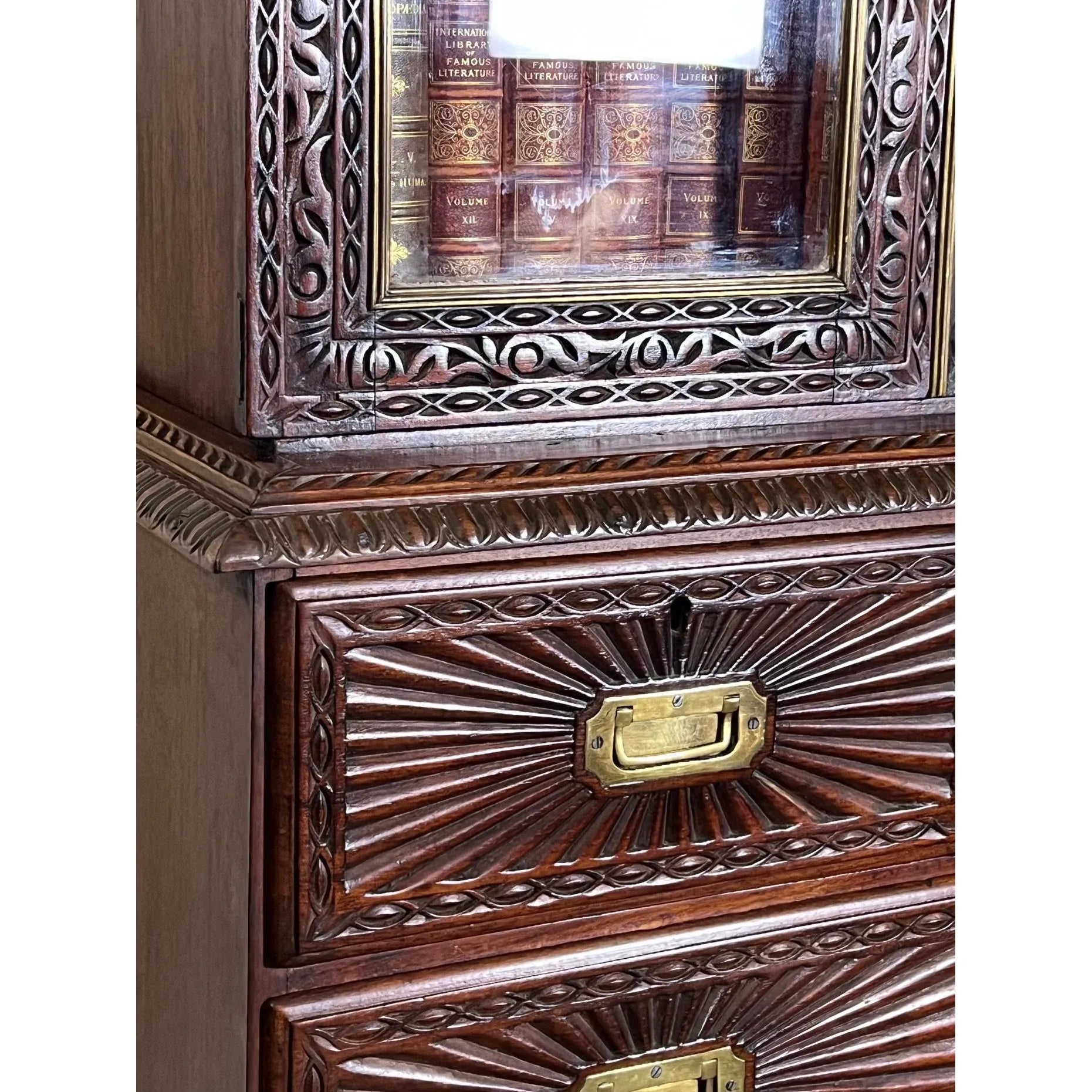The lower Storage Cabinet is a chest of drawers with a pair of top side by side drawers with three full width drawers below. All drawers feature flush fitting all brass campaign drawer pulls which are centred in the middle of raised sun burst carved decorative panels. All drawers are complete with brass locks and brass keyhole escutcheons.