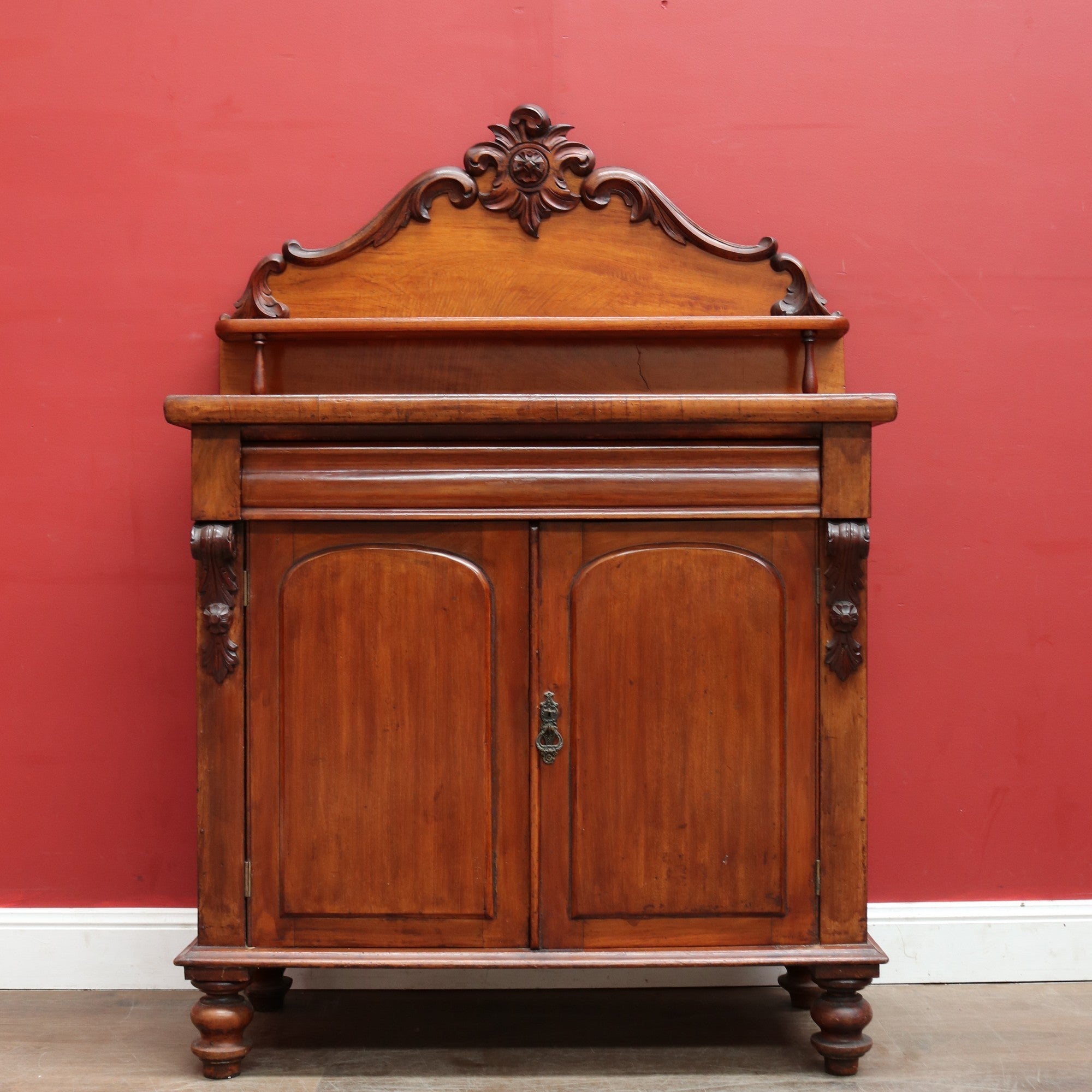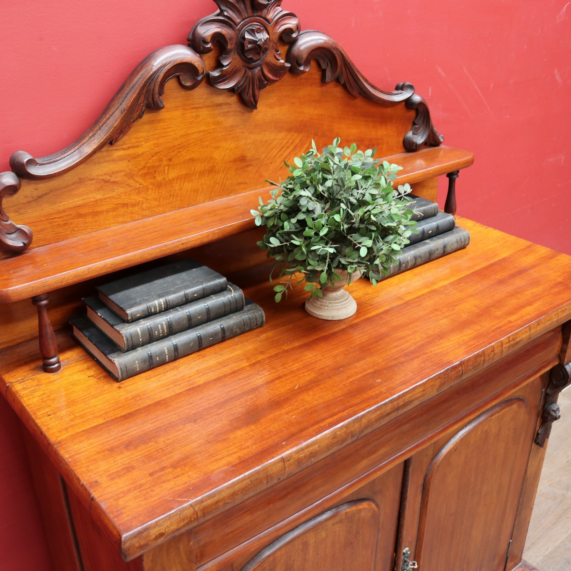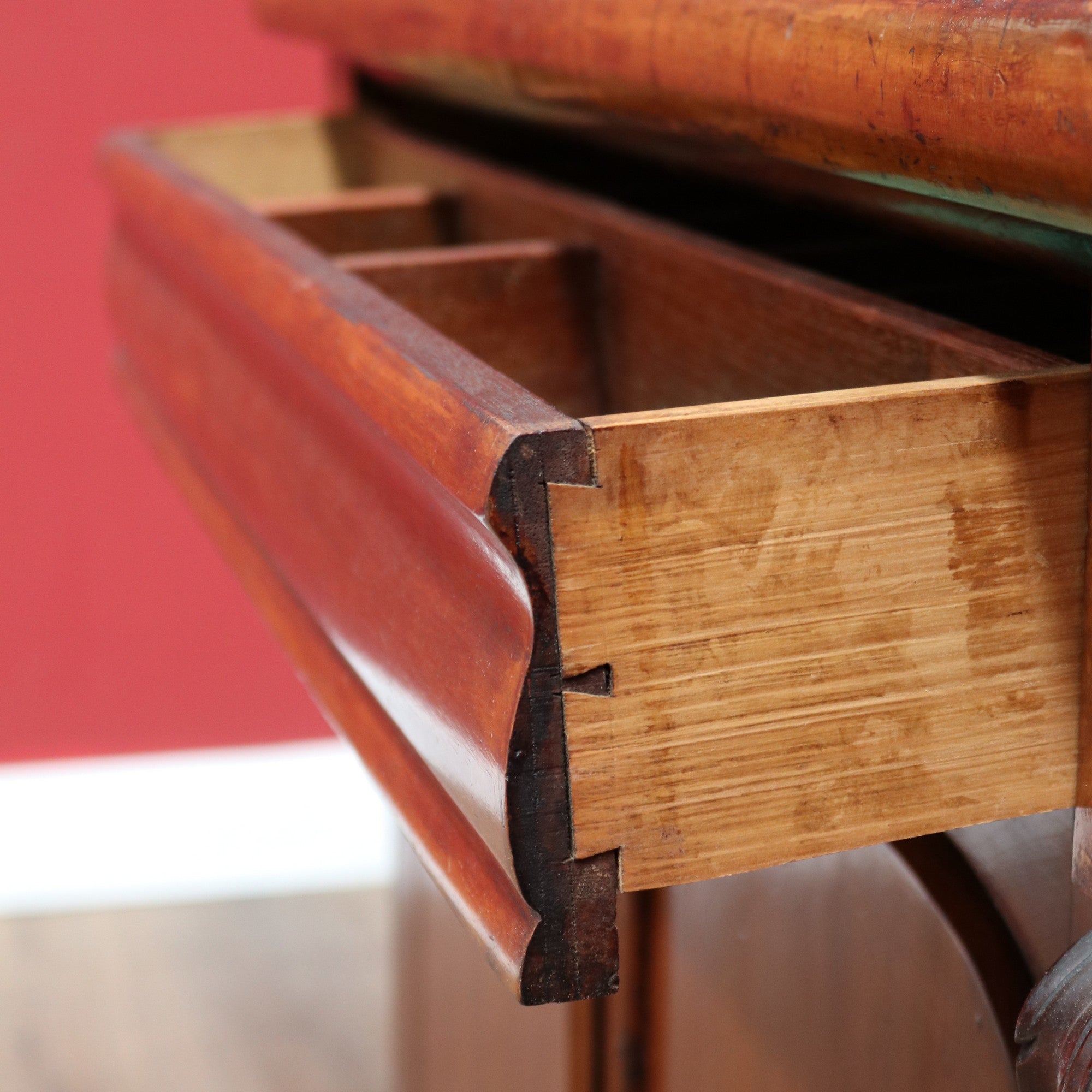 Description: An antique Australian cedar chiffonier with lovely original detail and practical storage. The top drawer has been divided into eleven felt-lined cutlery sections by a previous owner and comes with a key. Below sits a long single drawer over a two door cupboard with a fixed internal shelf. The shelf heights measure approximately 30 cm at the top and 32 cm at the bottom, offering functional space for serving pieces or household items.