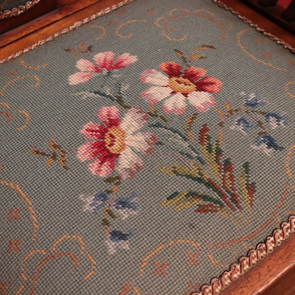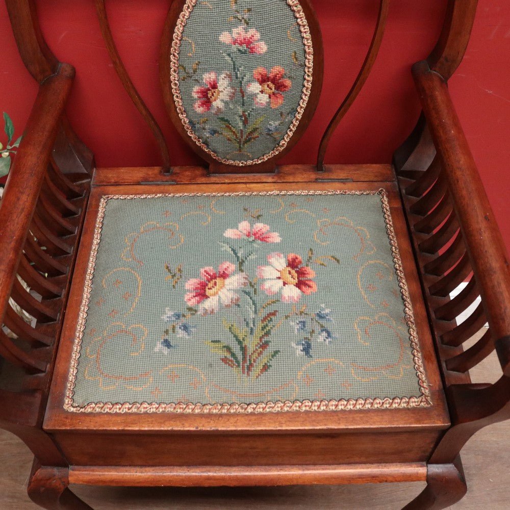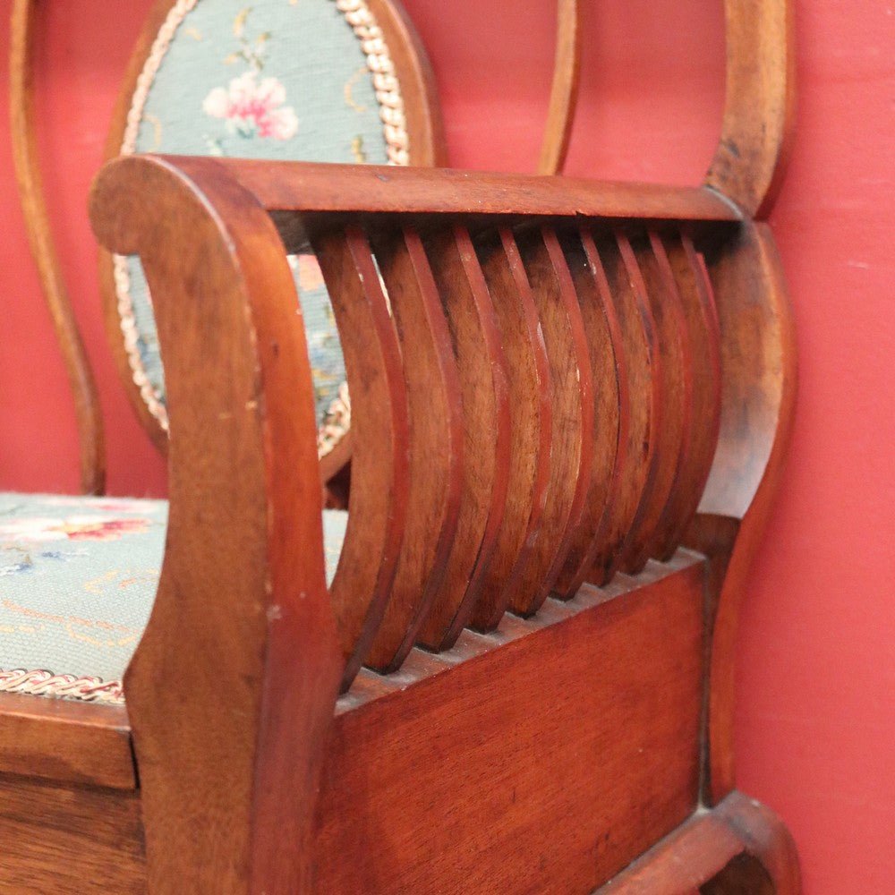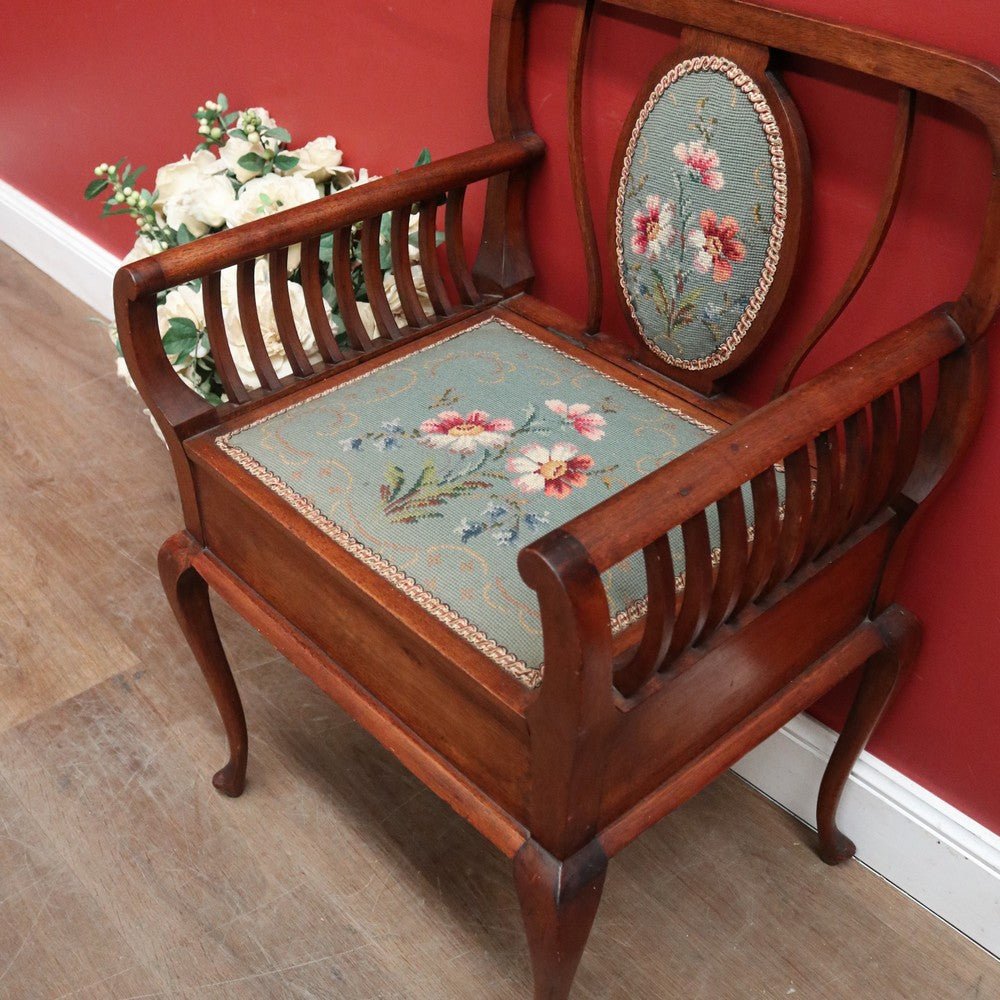 Description: Antique Australian maple high-back piano or music seat showcasing fine local craftsmanship. The seat lifts to reveal storage beneath, complemented by comfortable armrests and a hand-stitched floral tapestry to the back and seat. A beautiful, functional piece that offers both charm and comfort for any room. Suitable as a piano stool or dressing table chair.