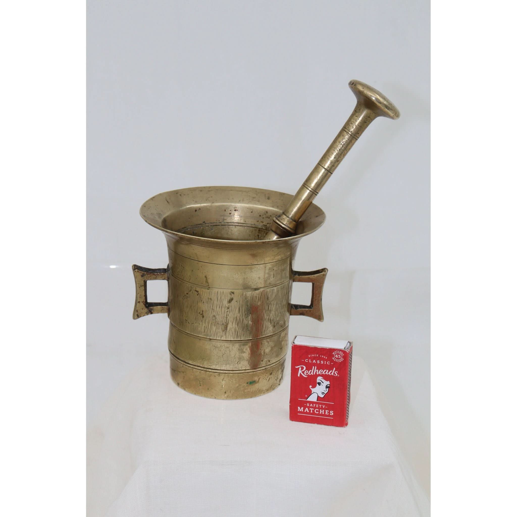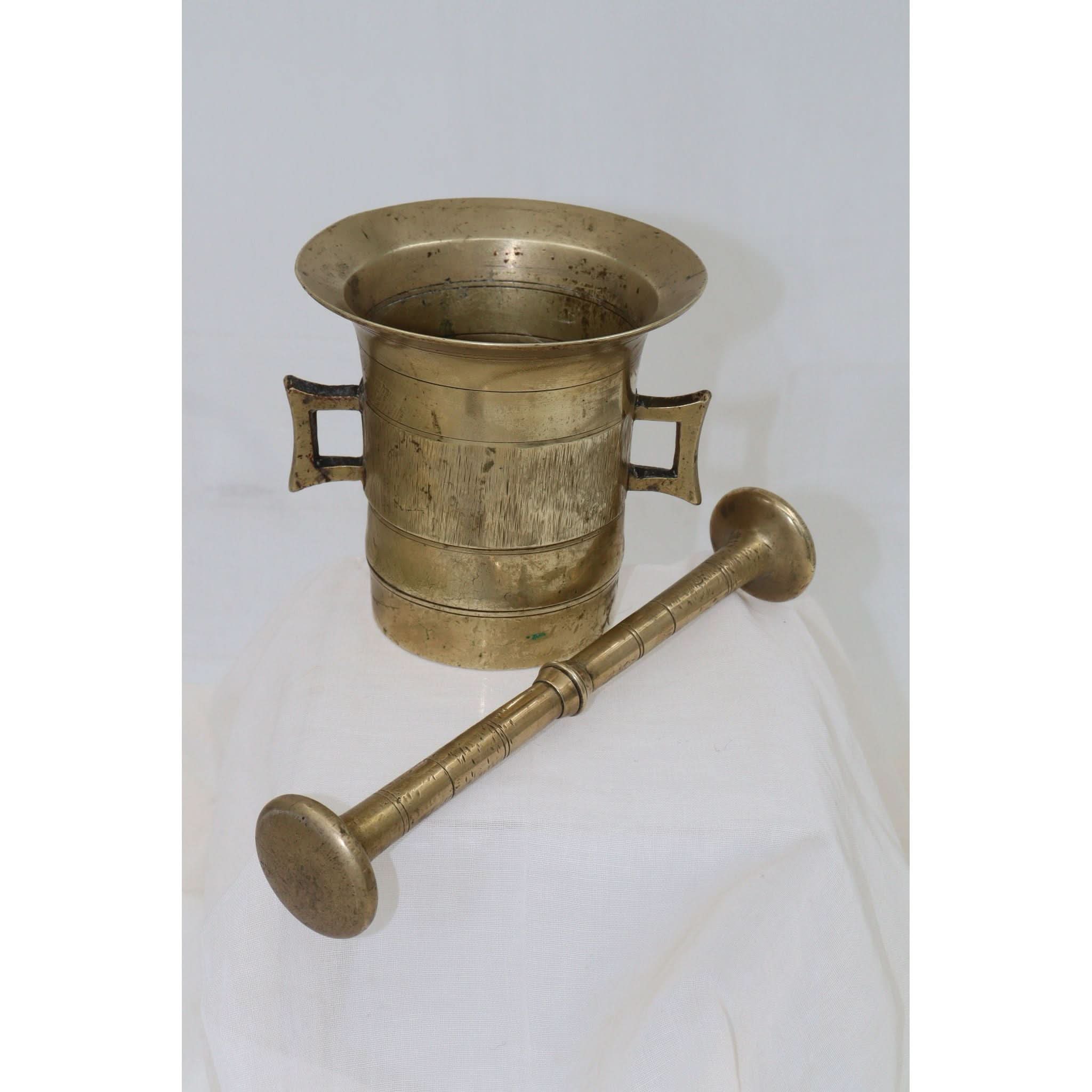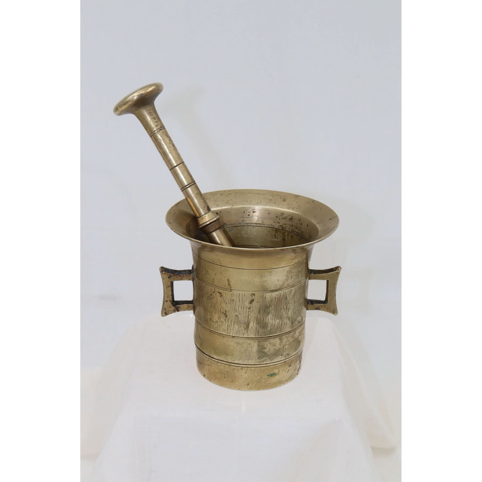 This very decorative antique brass mortar and pestle could also be put to use in the kitchen grinding herbs and spices. The mortar stands 120 mm (4.75 inches) high with a diameter of 120 mm (4.75 inches) at the top. The pestle measures 205 mm (8.5 inches) in length and is 40 mm (1.5 inches) across the rounded ends. The combined weight is 1.4 kgs. It would probably date from the last half of the nineteenth century.