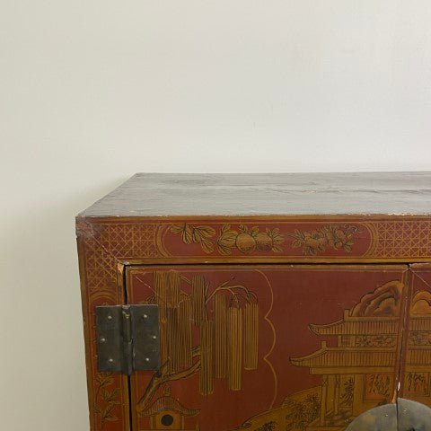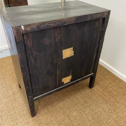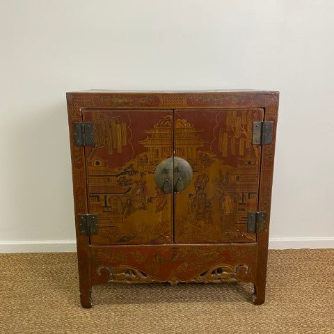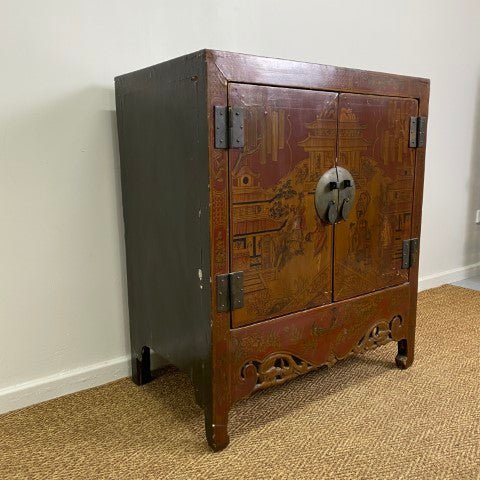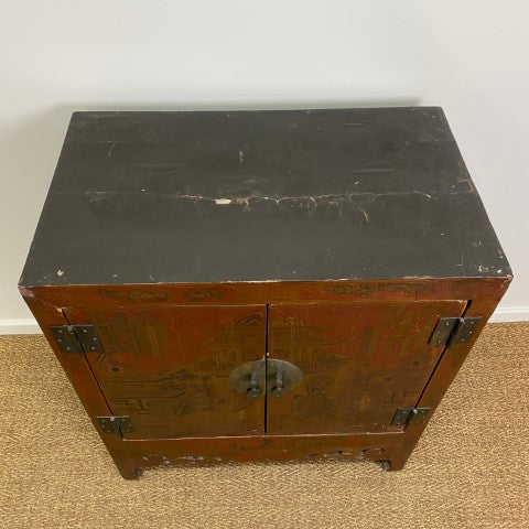 This antique Chinese lacquered cabinet features intricate detailing and a rich, glossy finish that highlights traditional craftsmanship. Its compact form offers storage while serving as a striking decorative piece.