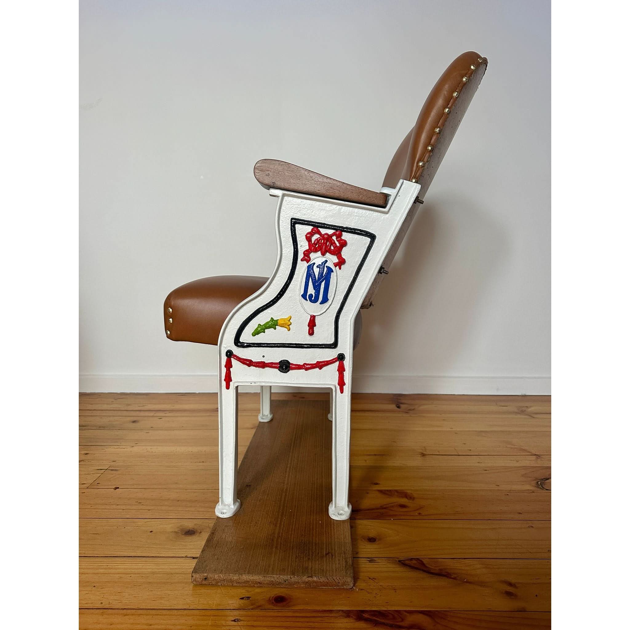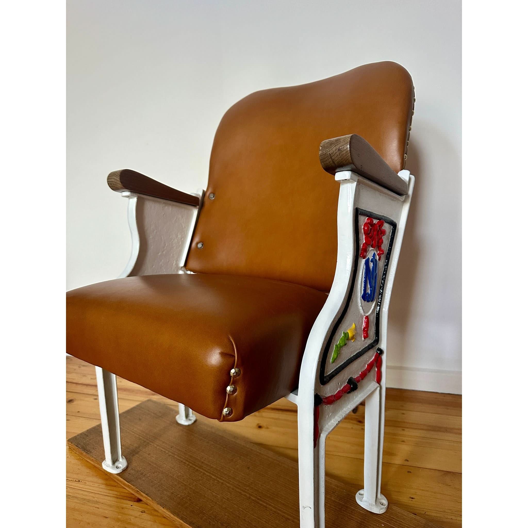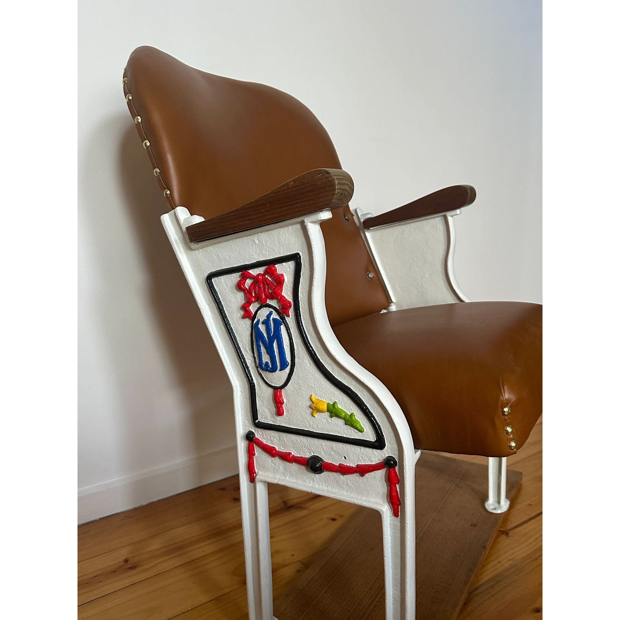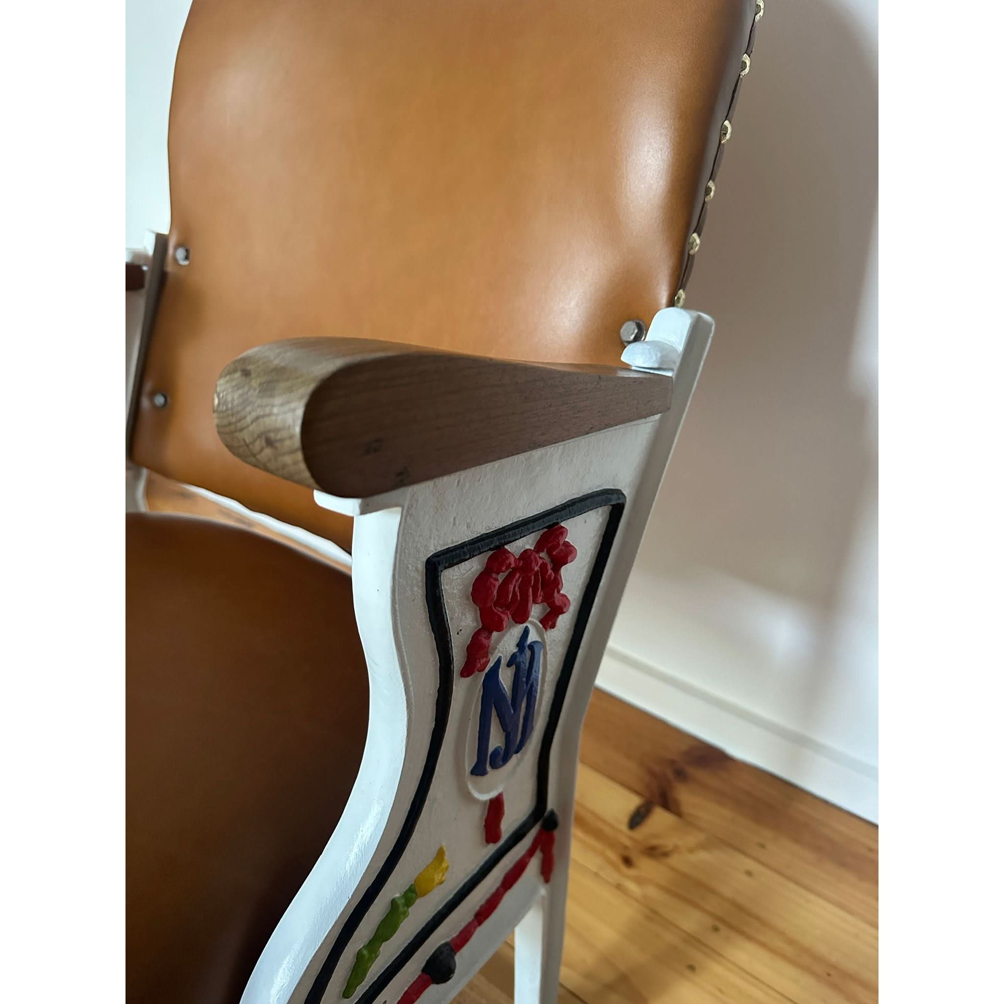 Has been reconditioned- hand painted decorative sides, new leather upholstery with gold studding.