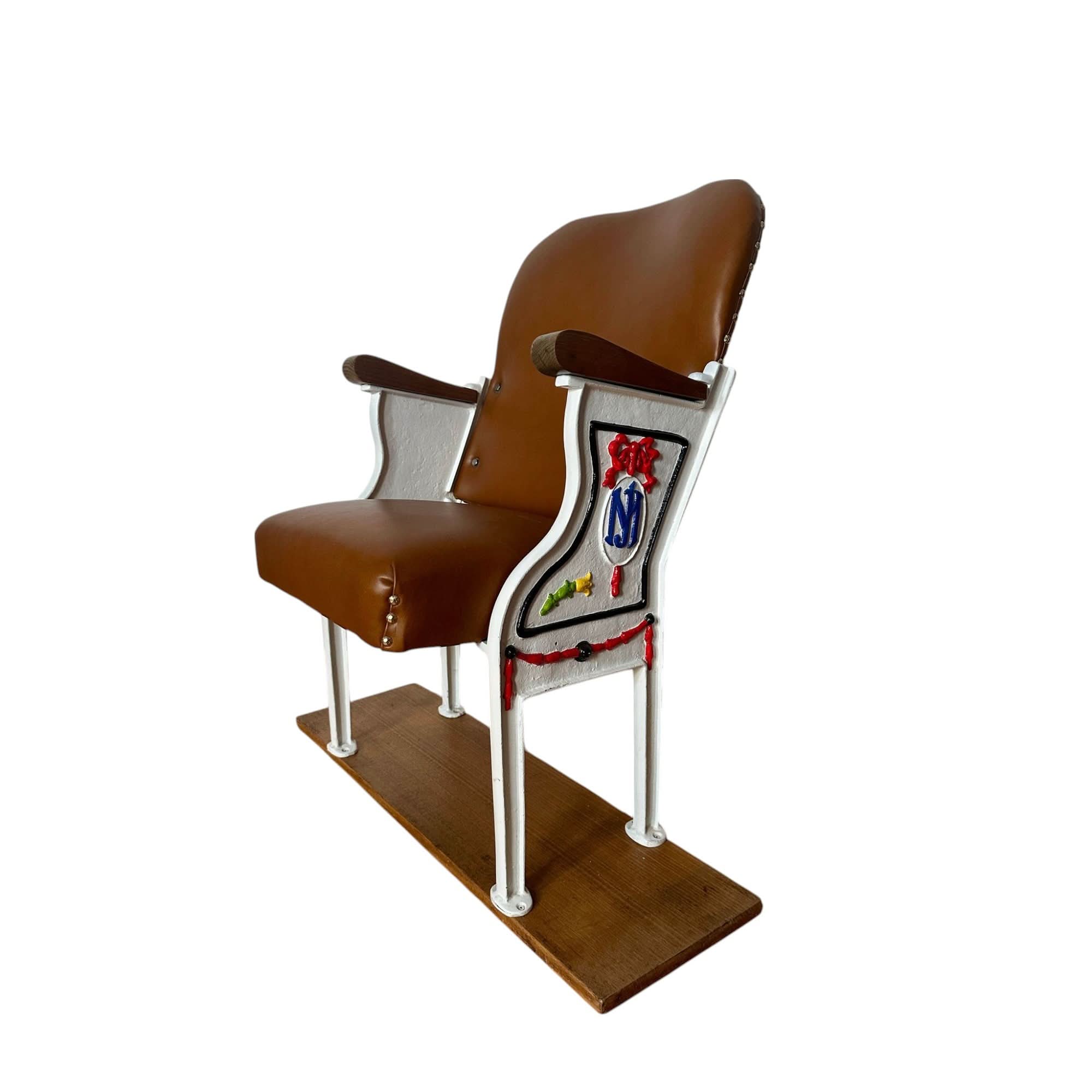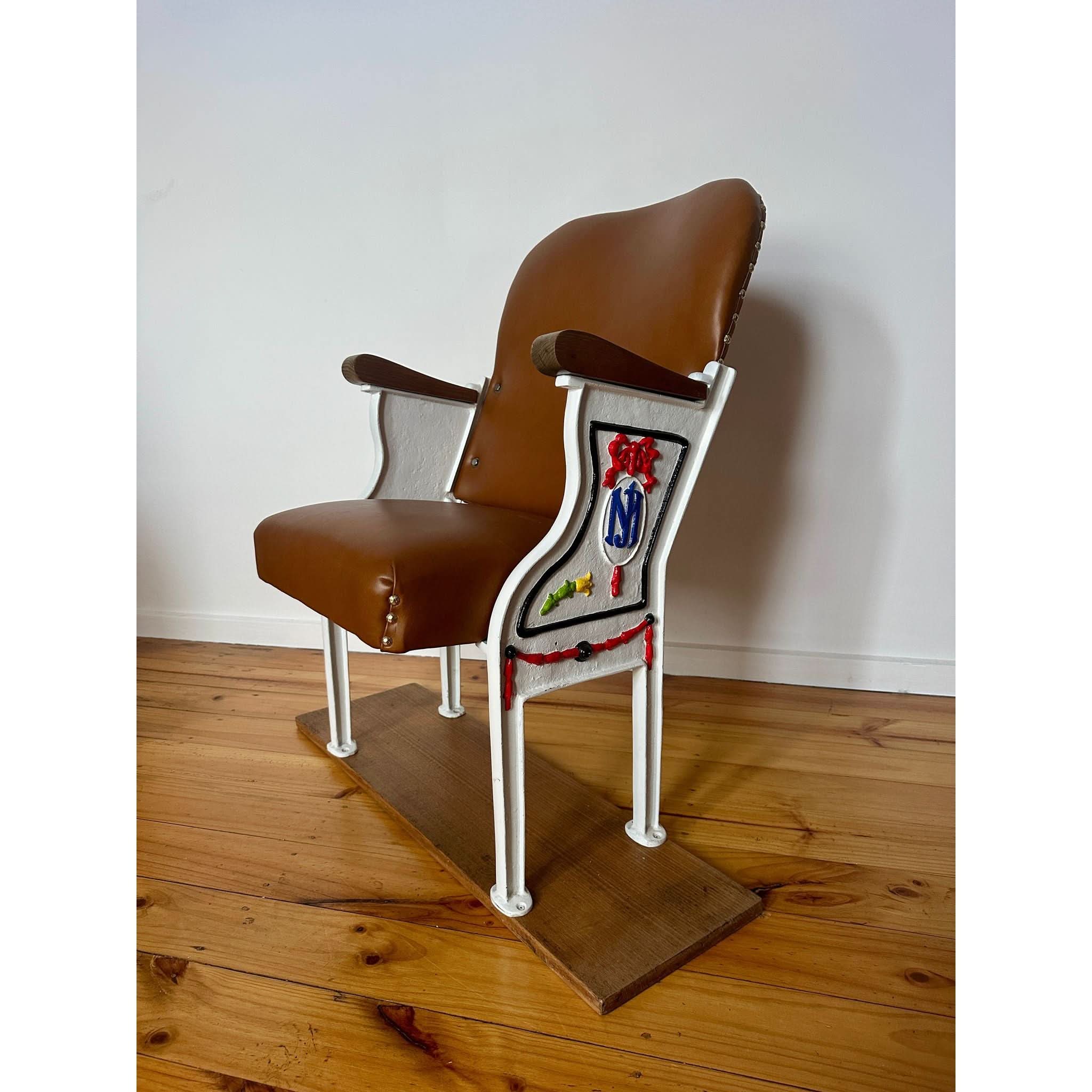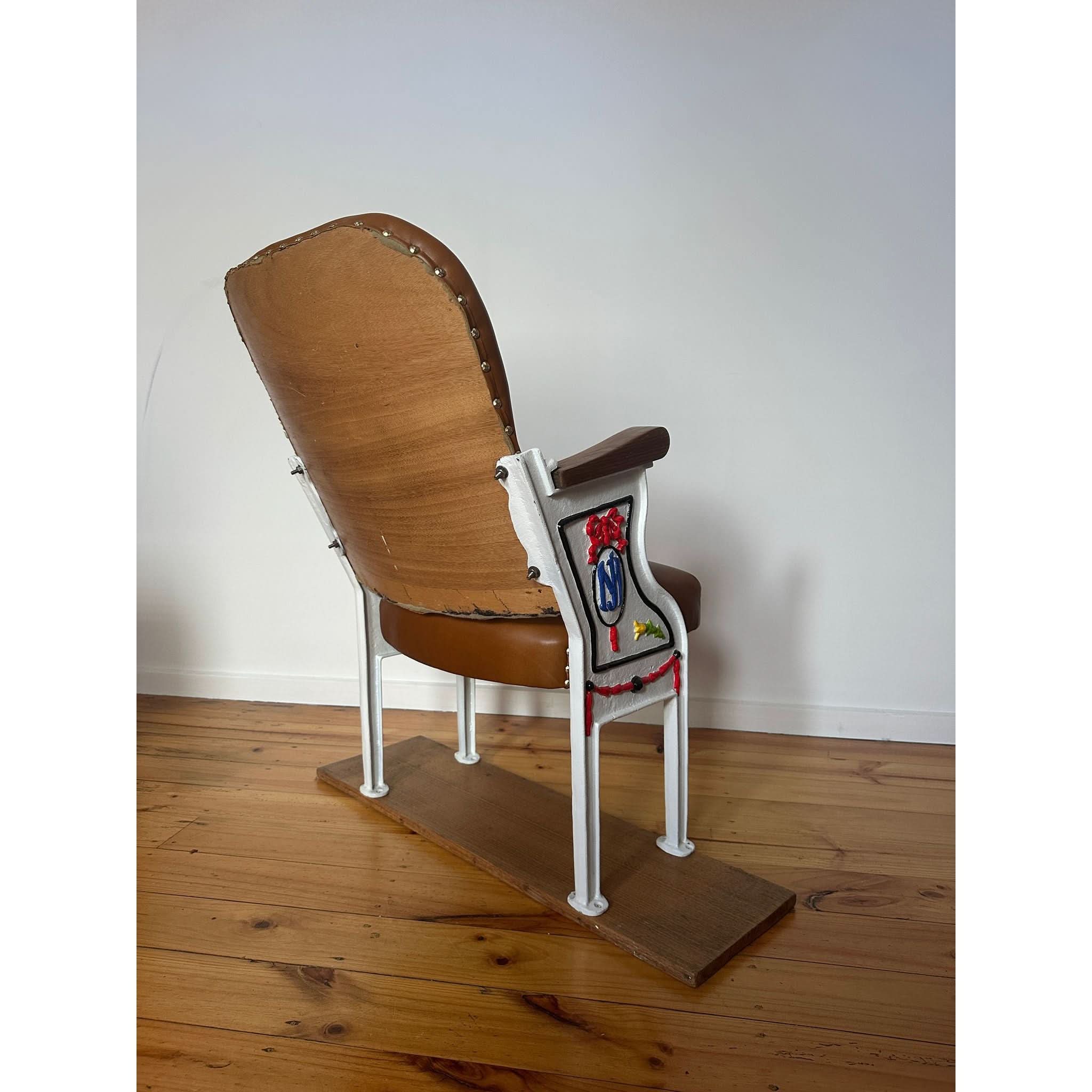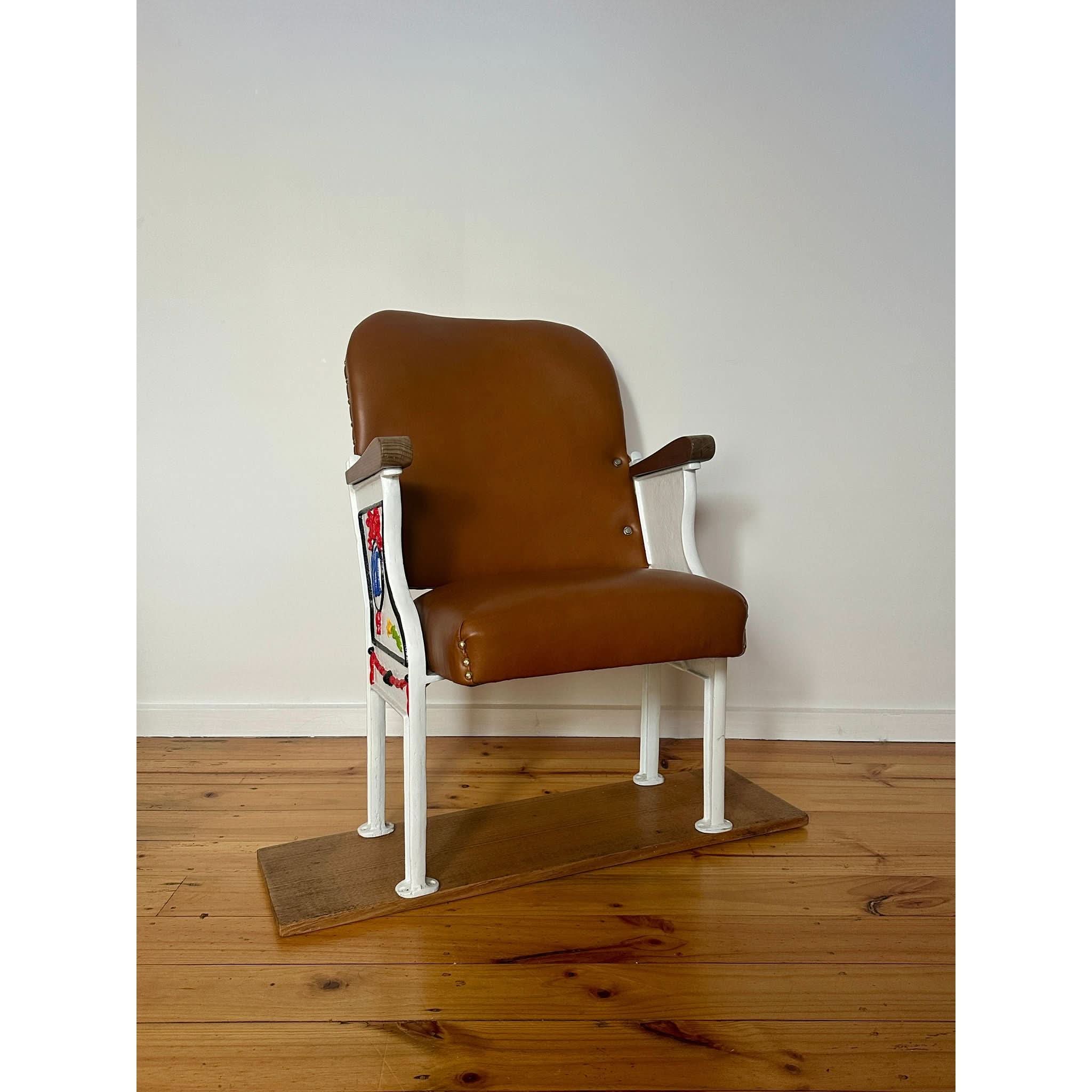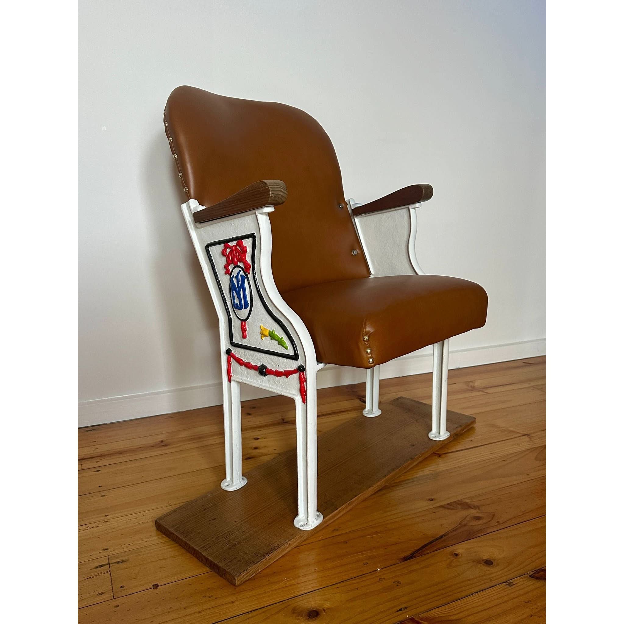 Has been reconditioned- hand painted decorative sides, new leather upholstery with gold studding.