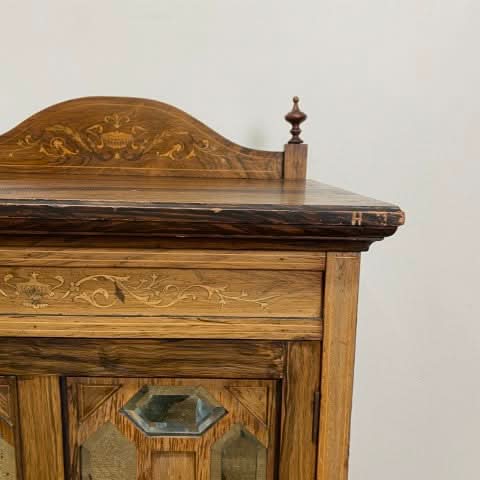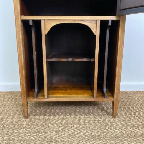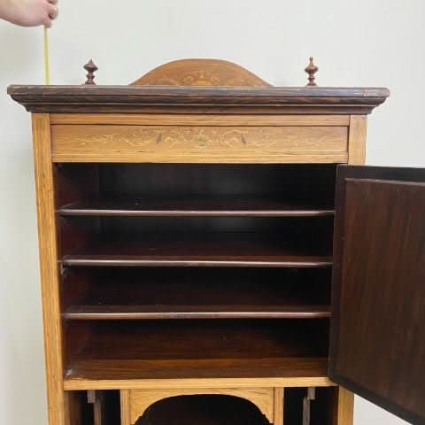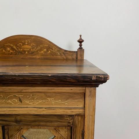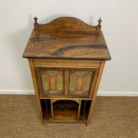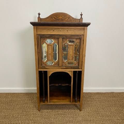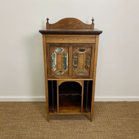 This antique Edwardian rosewood music cabinet features a mirrored door cabinet above and open vertical compartments below, designed for sheet music storage. Fine marquetry decoration highlights its refined craftsmanship and elegant style.
