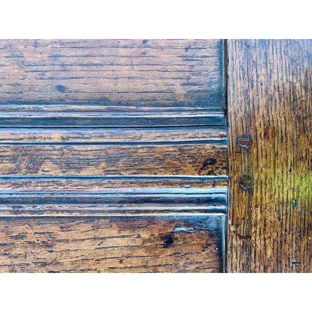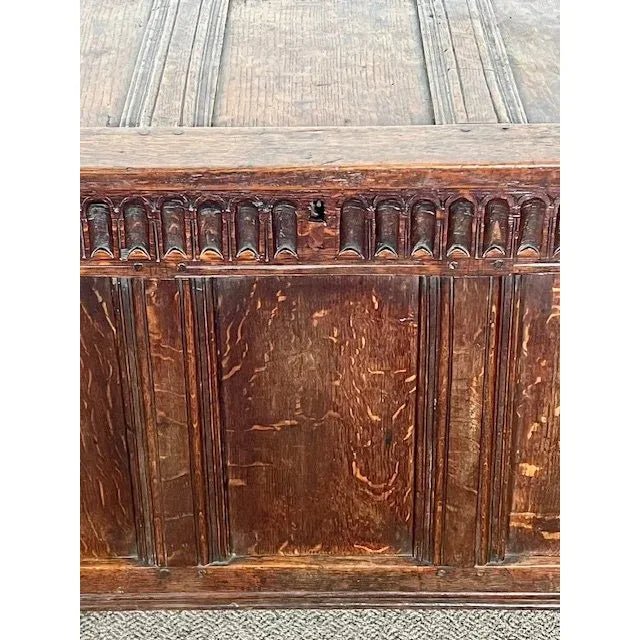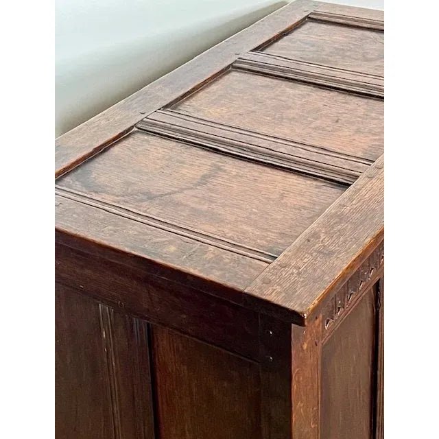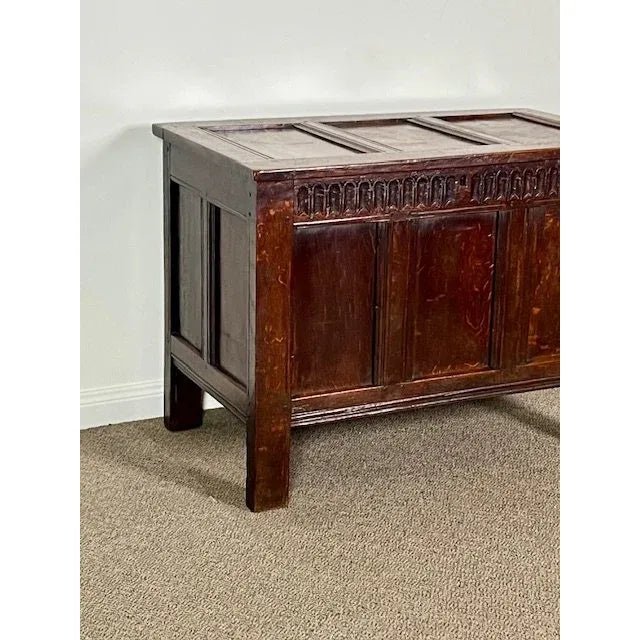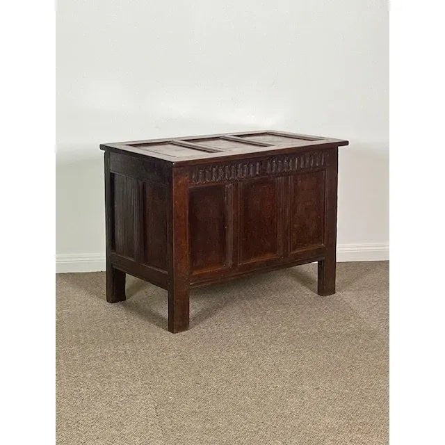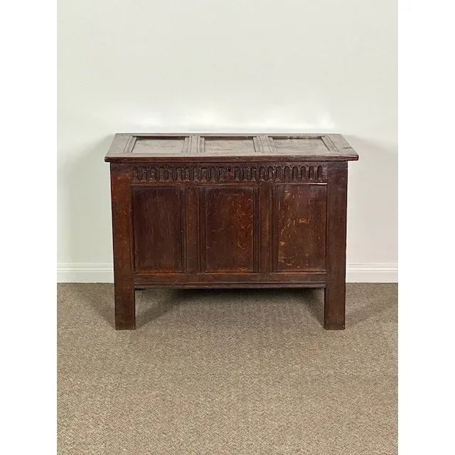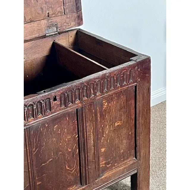 This coffer is of solid Oak frame and panel construction with mortise and tenon joints which are secured by pegs. Both the top and front have three complimentary recessed panels and the top rail features decorative null carving. The whole stands on stile legs / feet