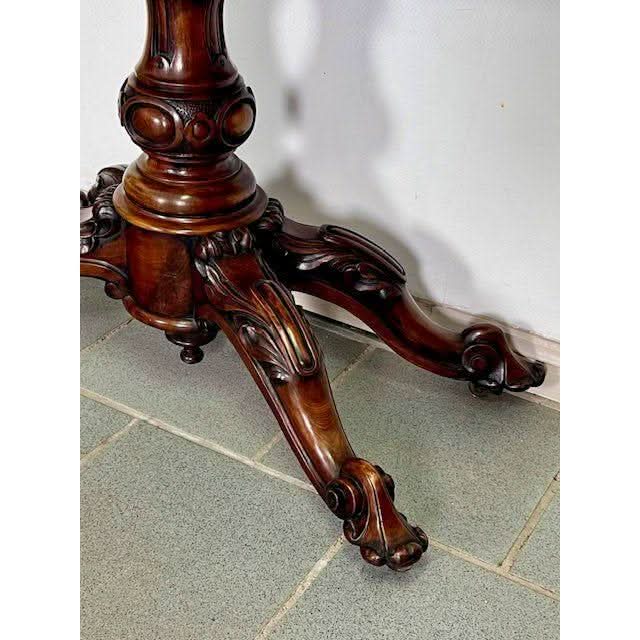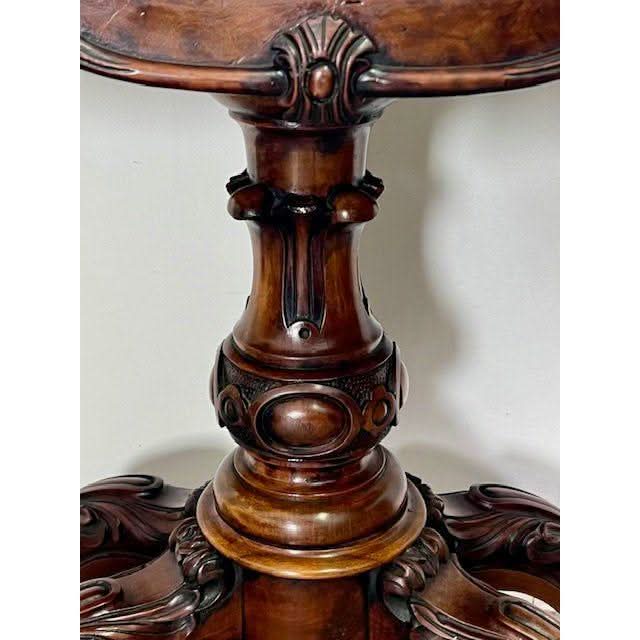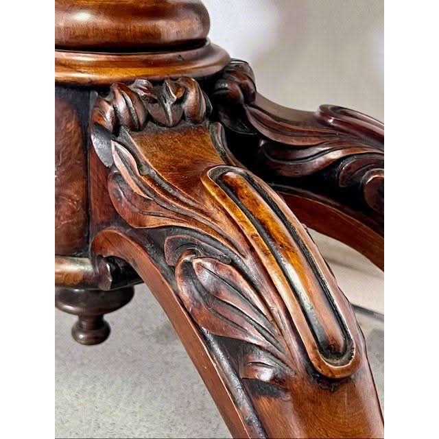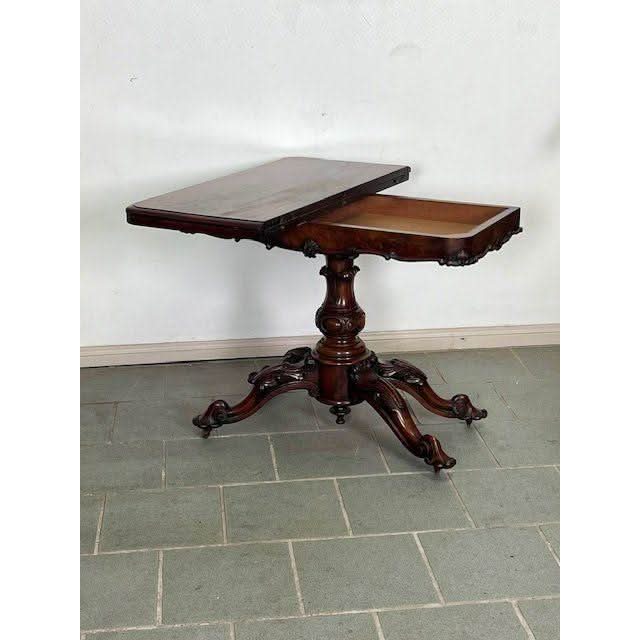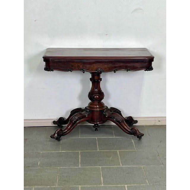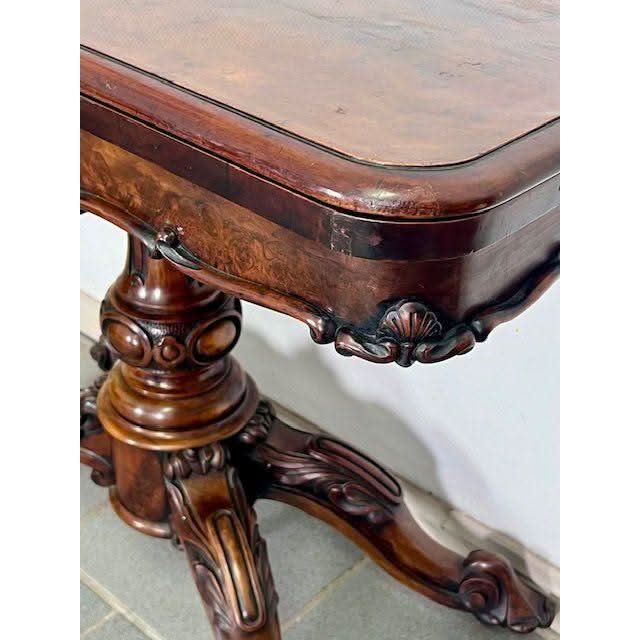 The nicely Figured Walnut table top is basically rectangular in form and swivels then folds over on the rectangular frieze section which is a storage compartment for cards and games pieces. The top has a stepped and curved perimeter molding and opens to reveal a woven fabric circular playing surface. The front and sides of the frieze have a lower complementary raised molding comprising of French influence Louis XV style ‘C’ and ‘S’ shaped scrolls with intermittent stylised ‘shell’ carvings. The bold solid Walnut centre support column is nicely profiled and features an impressive carved Tulip above a large carved bulbous turning. Below is a small upright cylindrical base with raised upper and lower moldings from which flow four very decorative outward and downward swept cabriole legs which feature detailed folage carved knees and carved feet with the original all brass castor assemblies beneath.
