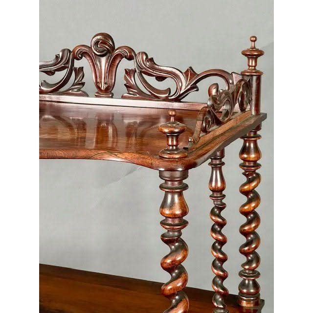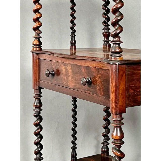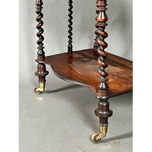 This is a very good example of a high quality genuine antique mid 19th century English early Victorian period four tier serpentine fronted What Not Stand also referred to as an Etagere. The whole is superbly crafted from prestigious imported Brazilian Rosewood of excellent figuring and mellowed deep honey colour.