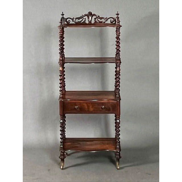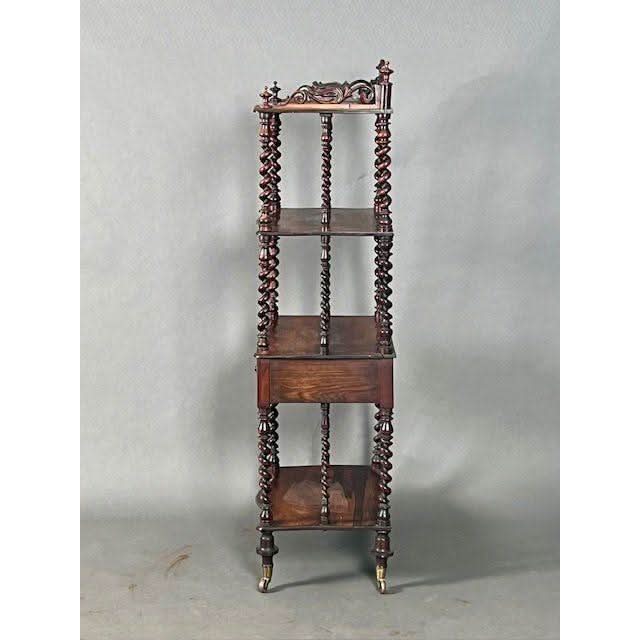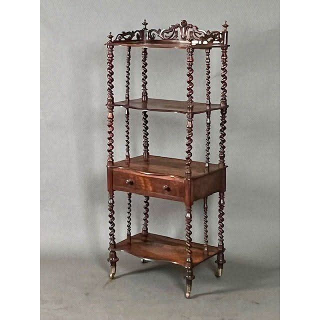 All tiers are separated and supported by corner positioned opposed Barley Twist supports and the whole stands on four short well turned vertical feet which terminate in all brass bucket caster assemblies. The top tier has a three sided saw pierced carved gallery with scrolled foliate motifs and above each corner barley twist column there is an elegant finial. The second lowest tier has a full width serpentine fronted full width drawer which has a pair of well turned and nicely profiled drawer pull knobs.
