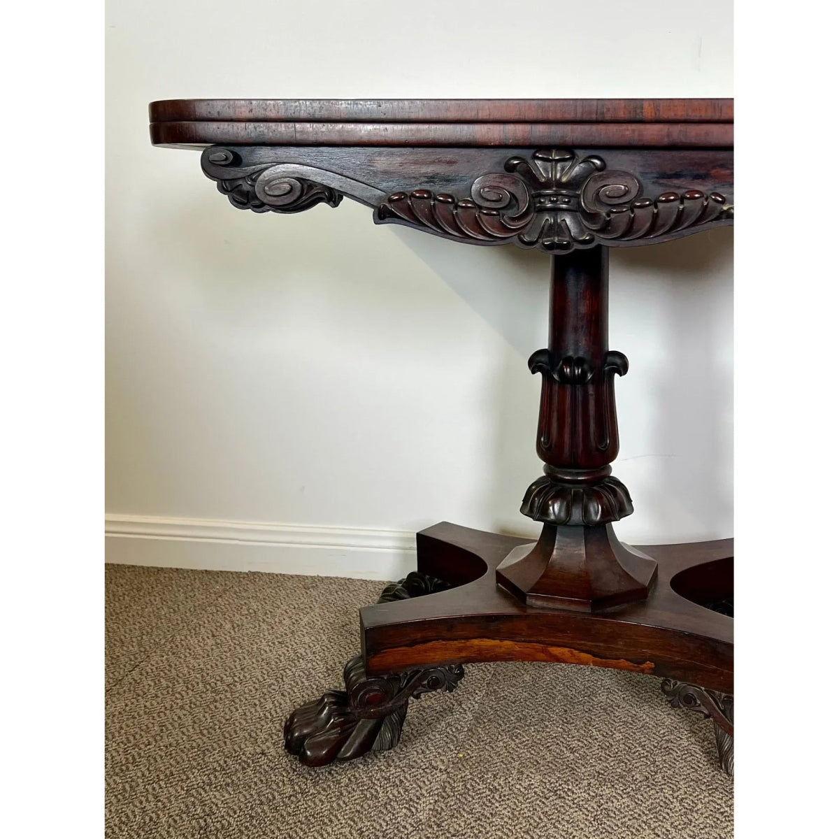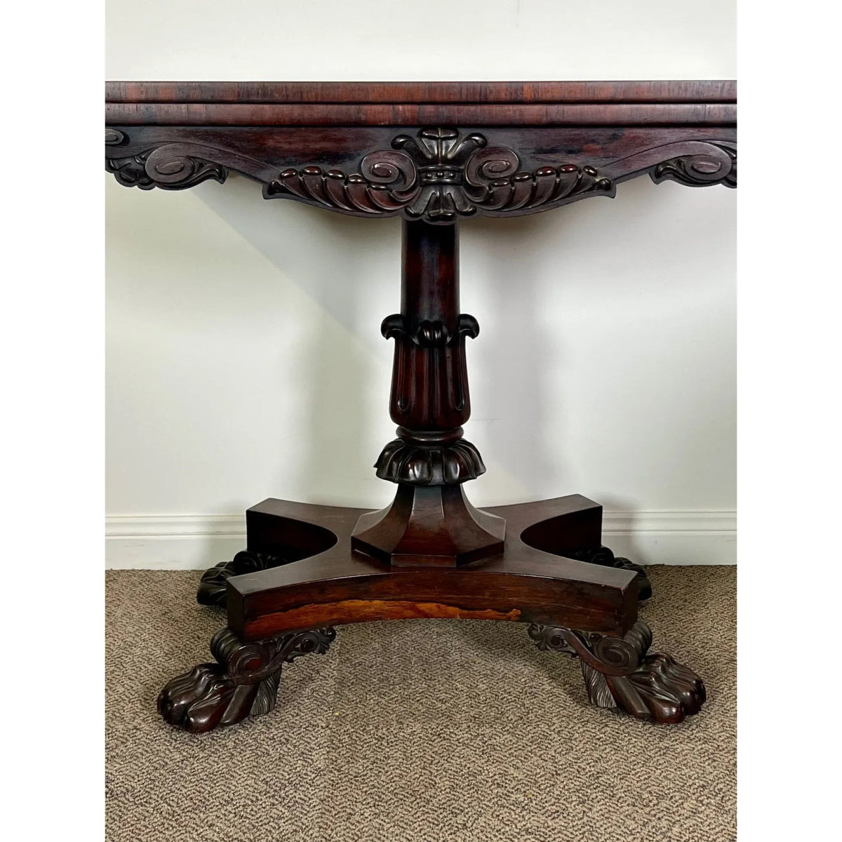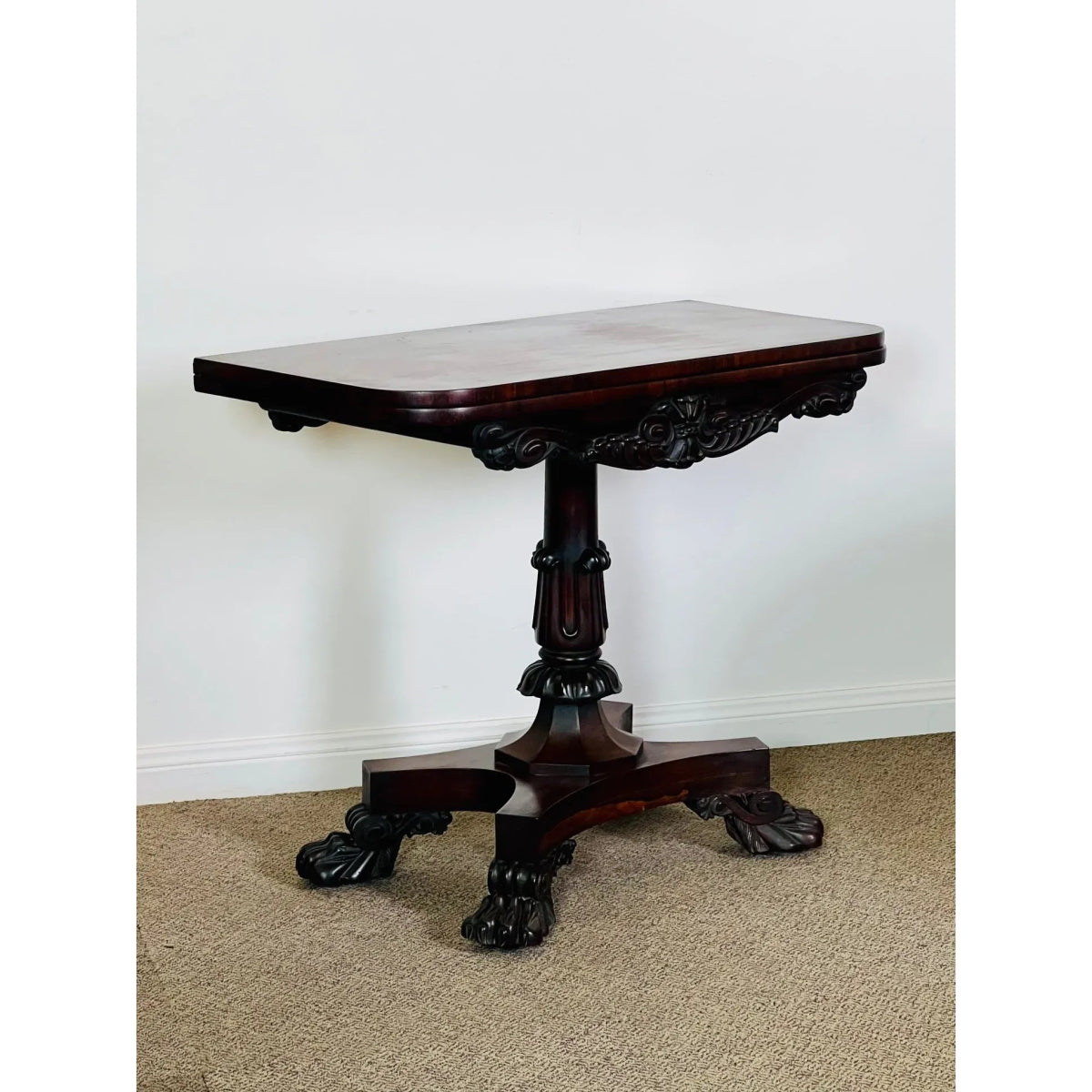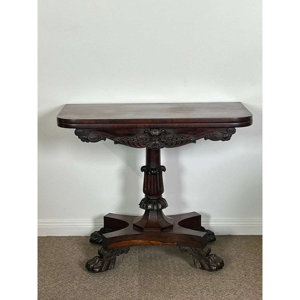 This is a high end quality genuine antique English earlier 1800s early George IV ( 1820 to 1830 ) Card Table beautifully made by craftsmen from prestigious sought after imported Brazilian Rosewood prized for its colour and abstract figuring. These versatile tables are often used as side tables and hall tables.