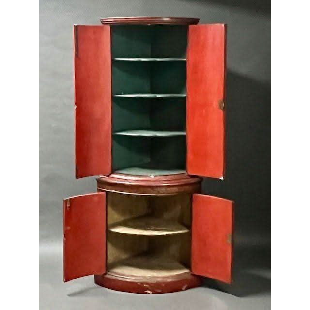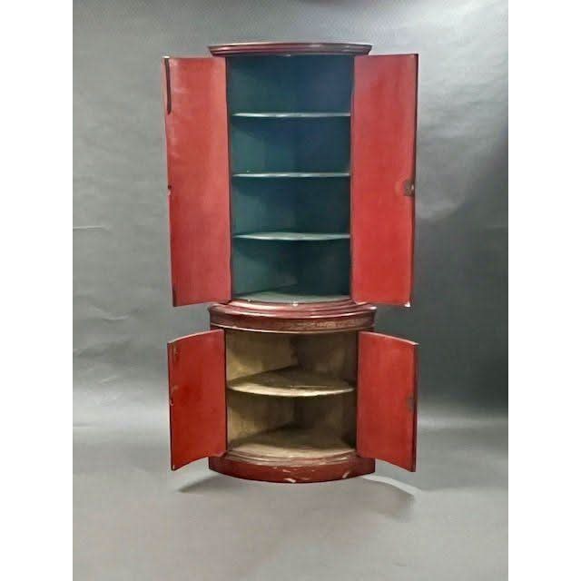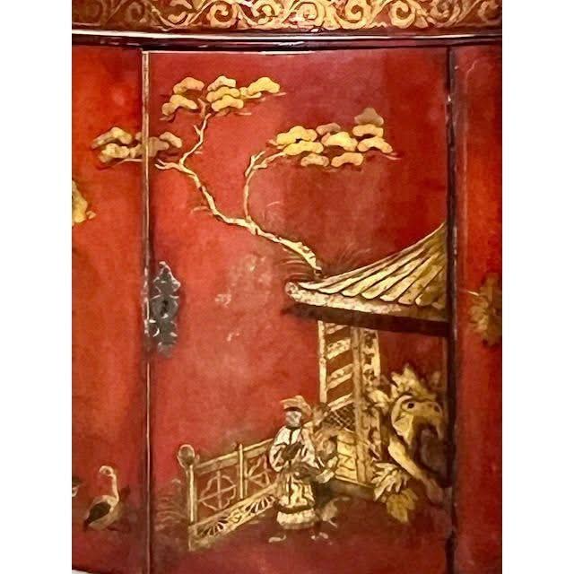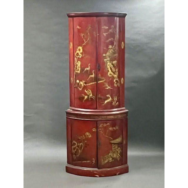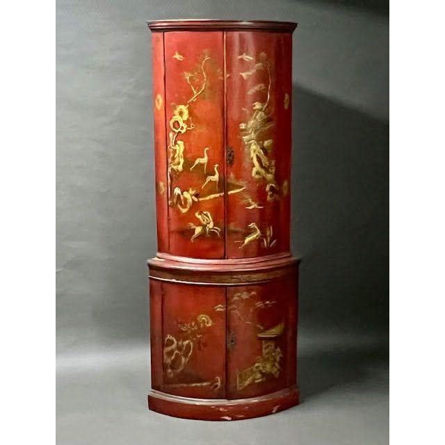 This is a good example of a hard to find genuine antique English Georgian period later 1700s / early 1800s two height bow fronted Corner Cabinet constructed in Pine and then decorated with a red lacquer and gilt Chinese scenes in an art form referred to as Chinoiserie due to the fascination of all things Oriental in the 18th century.