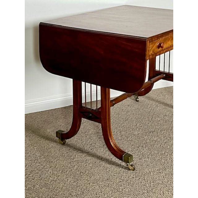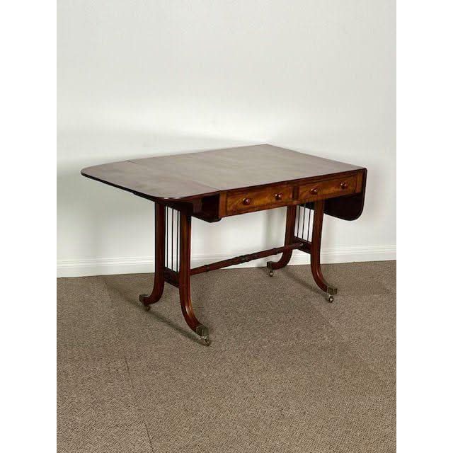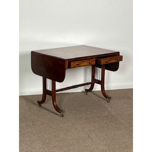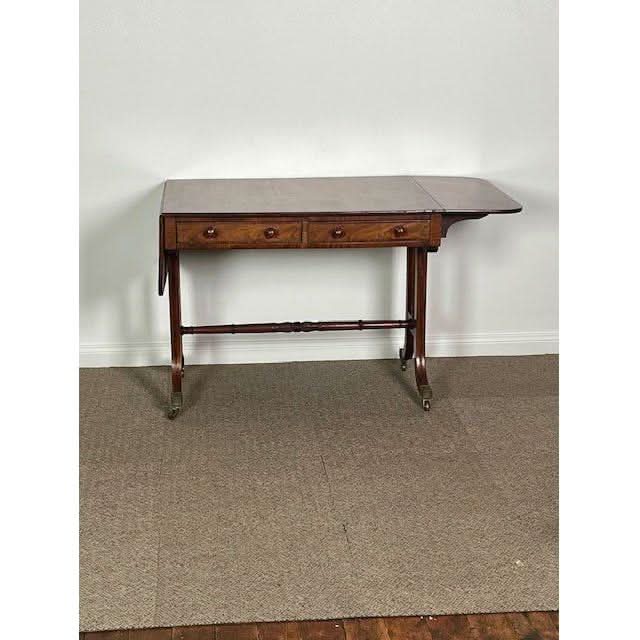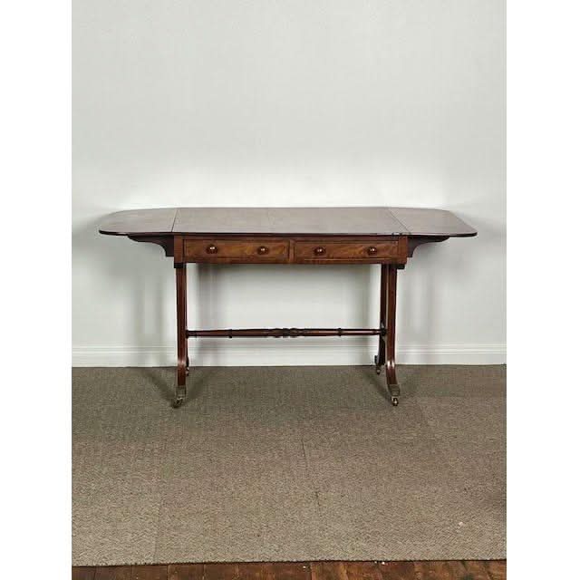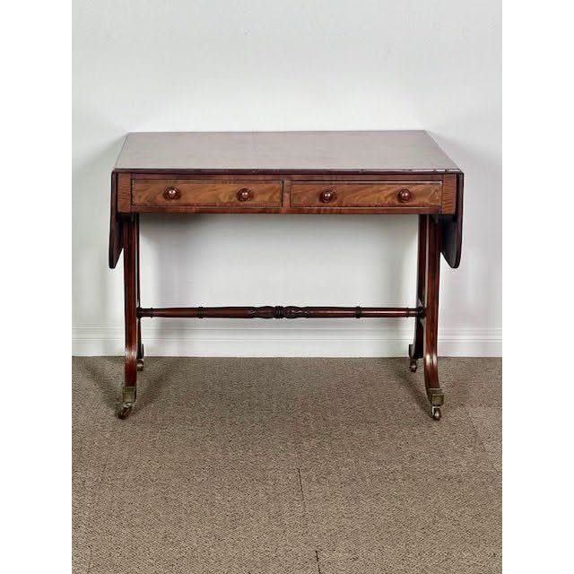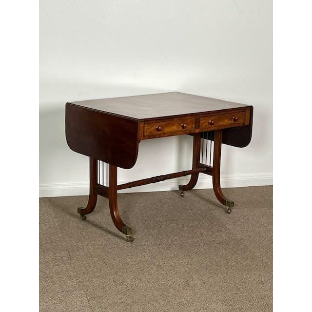 This is a very nice example of a genuine antique English Georgian period Regency period 1811 to 1820 Sofa Table. So named as homes with large rooms with free standing settees / lounges / Sofas often had a Sofa Table behind them to accommodate lamps or candelabras and clocks etc. They also doubled as a writing Table and could also just be used as a Side Table. These tables were finished all round as they often were accessed and viewed from both sides.