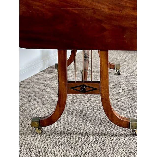 At each end are lovely and unusually shaped trestle supports comprising of a pair of squared uprights with a lowercross member and brass rods forming a stylised classical Lyre. The cross member is further embellished with a raised ebonised diamond shape with a circular patera within.