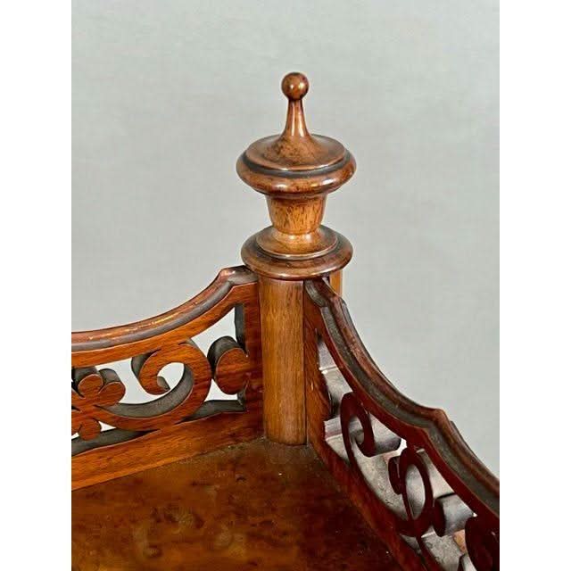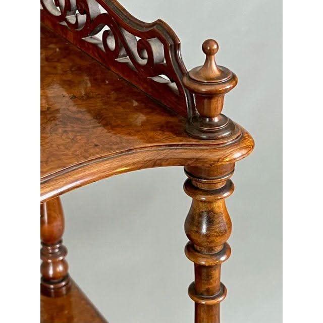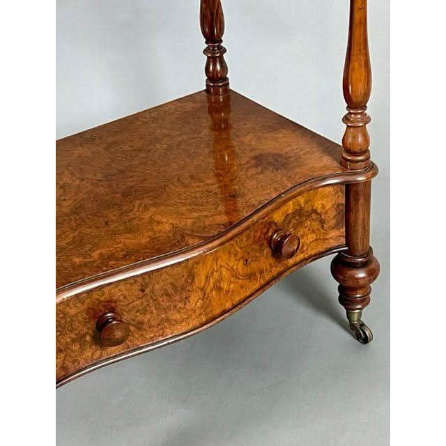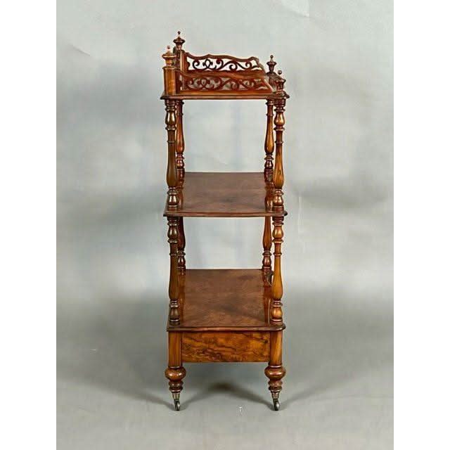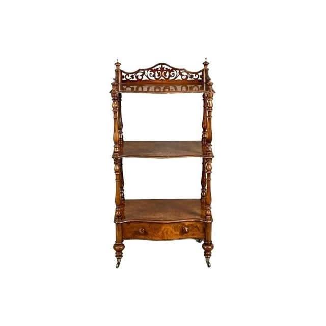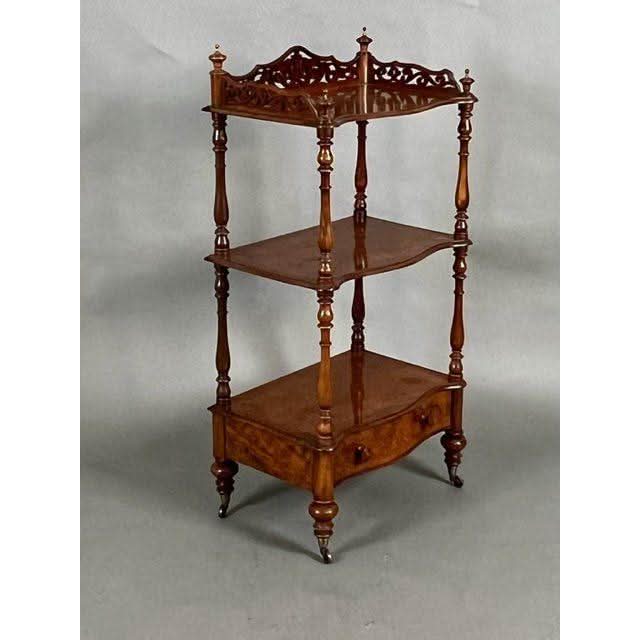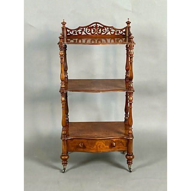 This is a very good example of a mid 19th century genuine antique English three tier Etagere / Display Stand / Whatnot Stand made from lovely honey coloured Walnut. The serpentine fronted shelves and the serpentine lower tier drawer front are all finished in selected decorative Walnut Burl. The top tier has a shaped three sided saw pierced timber gallery and the well turned vertical supports terminate in very nice urn shaped finials. The drawer has a pair of equally well turned knobs. The whole is supported on short turned and tapered legs which have their original all brass castor assemblies.