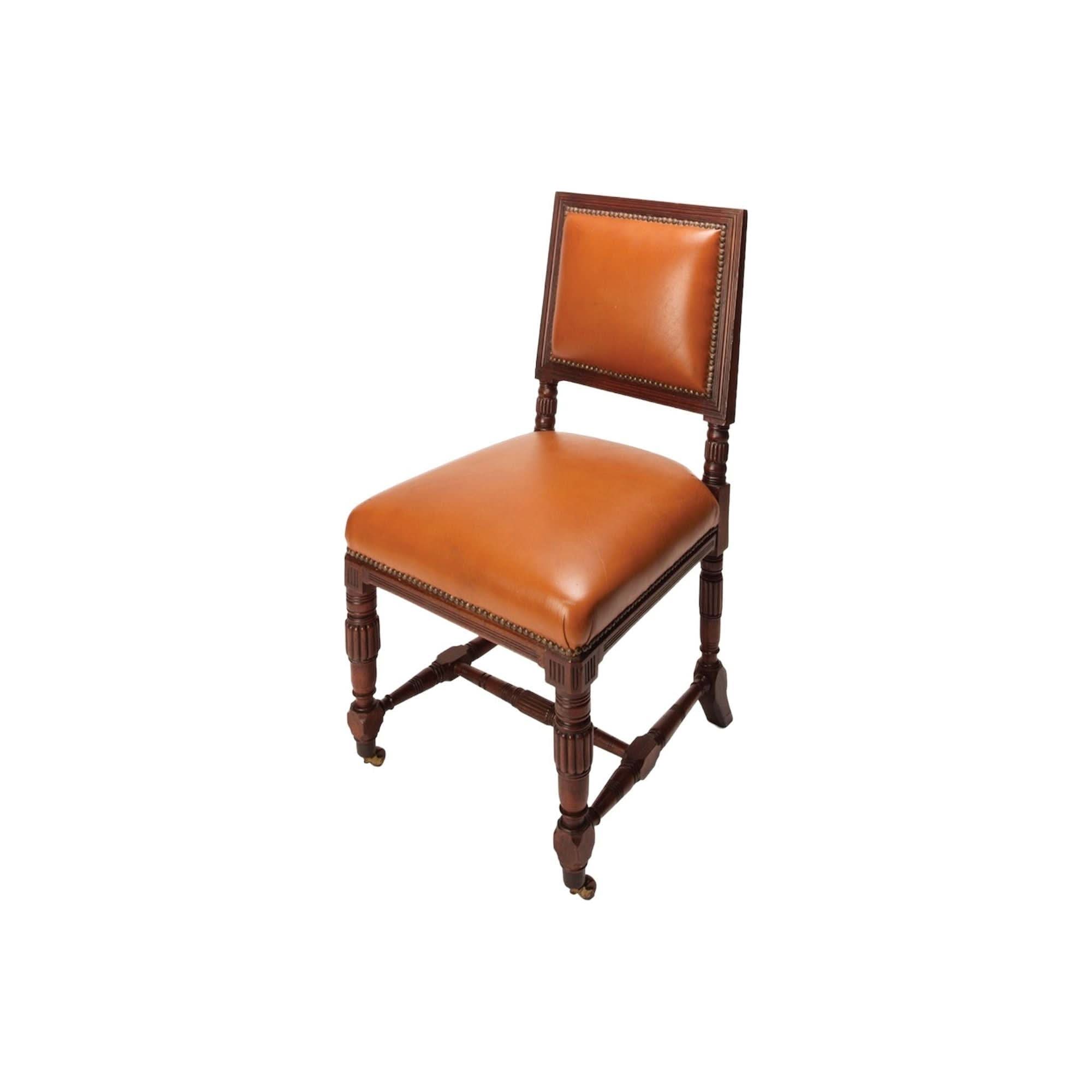 A good and substantial hard to find long set of 12 antique last quarter of the !9th century English Victorian Dining Chairs with Mahogany 'show timber' frames Attributed to Shoolbred, who was a famous English maker at Tottenham Court Road London.. The Mahogany frames have studded leather upholstery to the padded backs and the sprung seats..