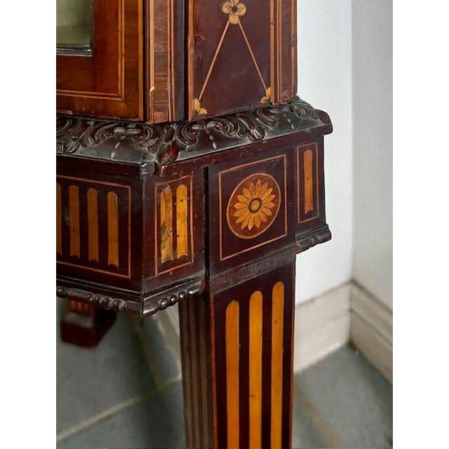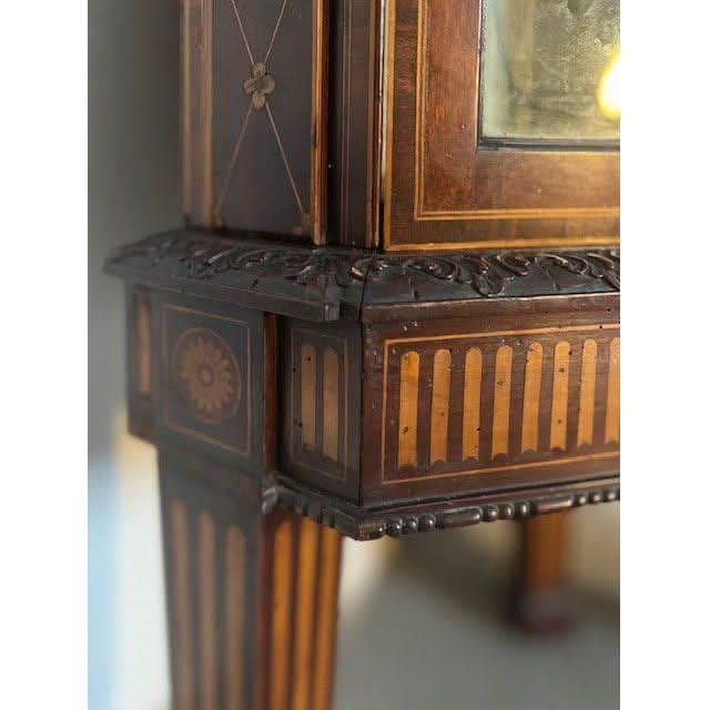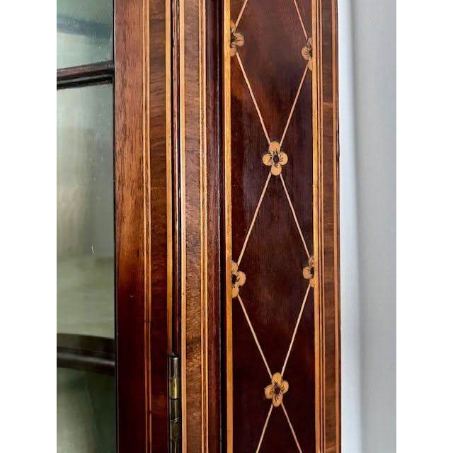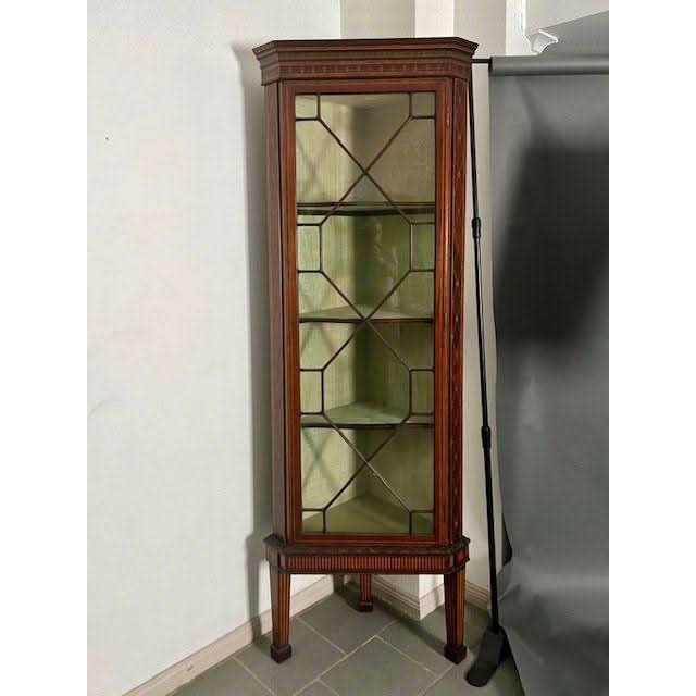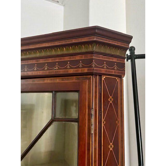 This is a superb quality example of a genuine antique English later Victorian period / early Edwardian period circa 1900 Corner Display Cabinet in the later 1700s George III Sheraton revival style. It is crafted from prestigious Mahogany and is profusely decoratively embellished with inlays, carvings and painting.