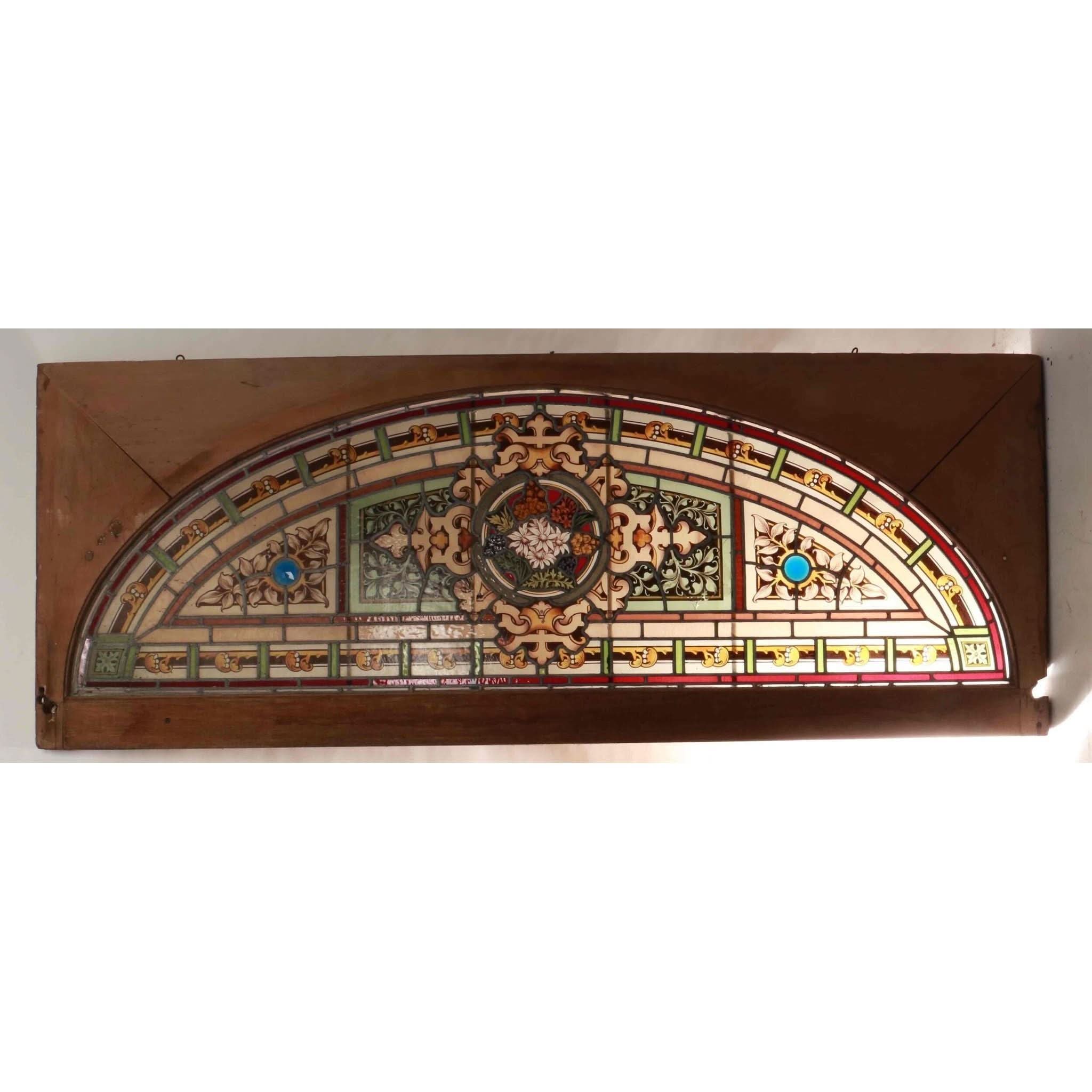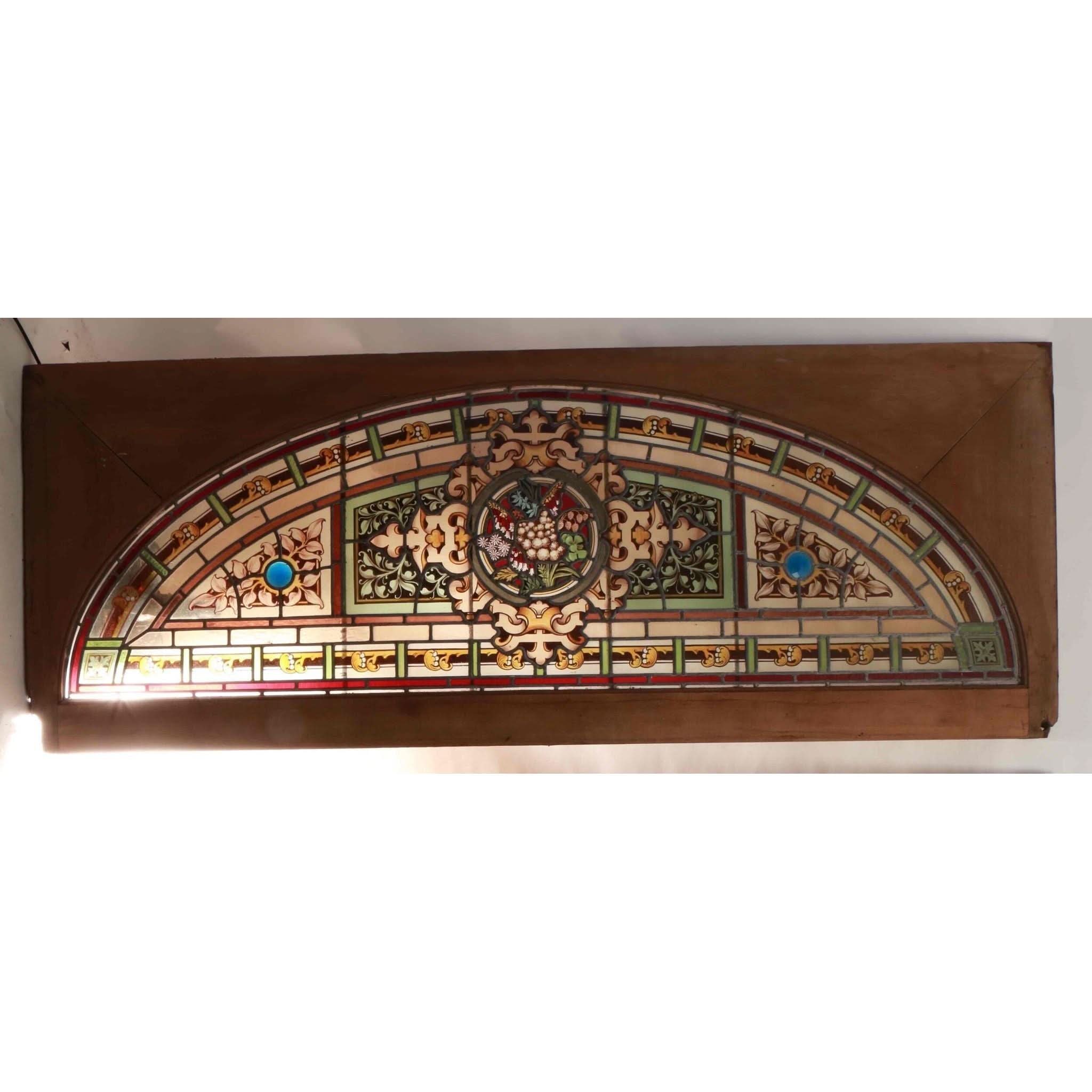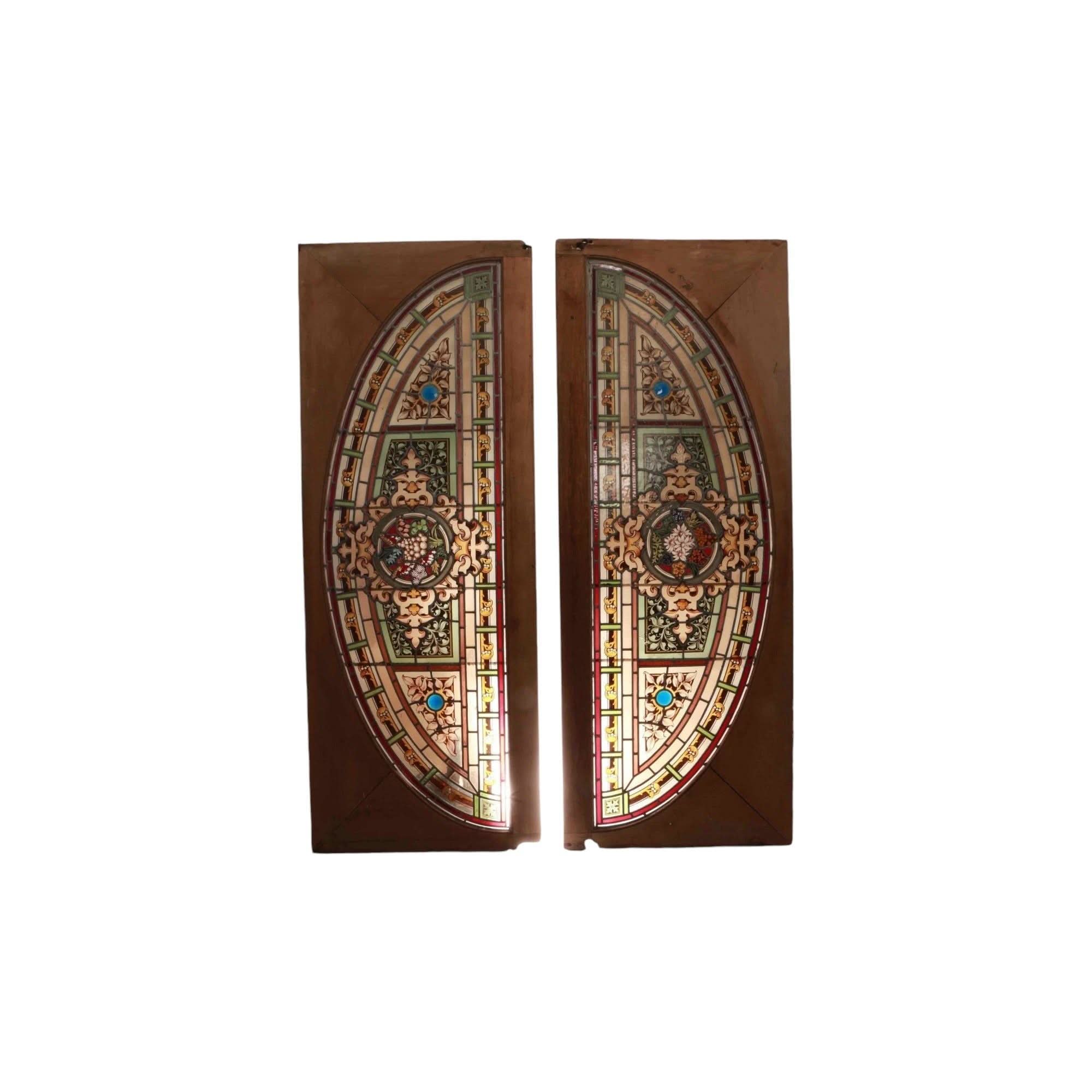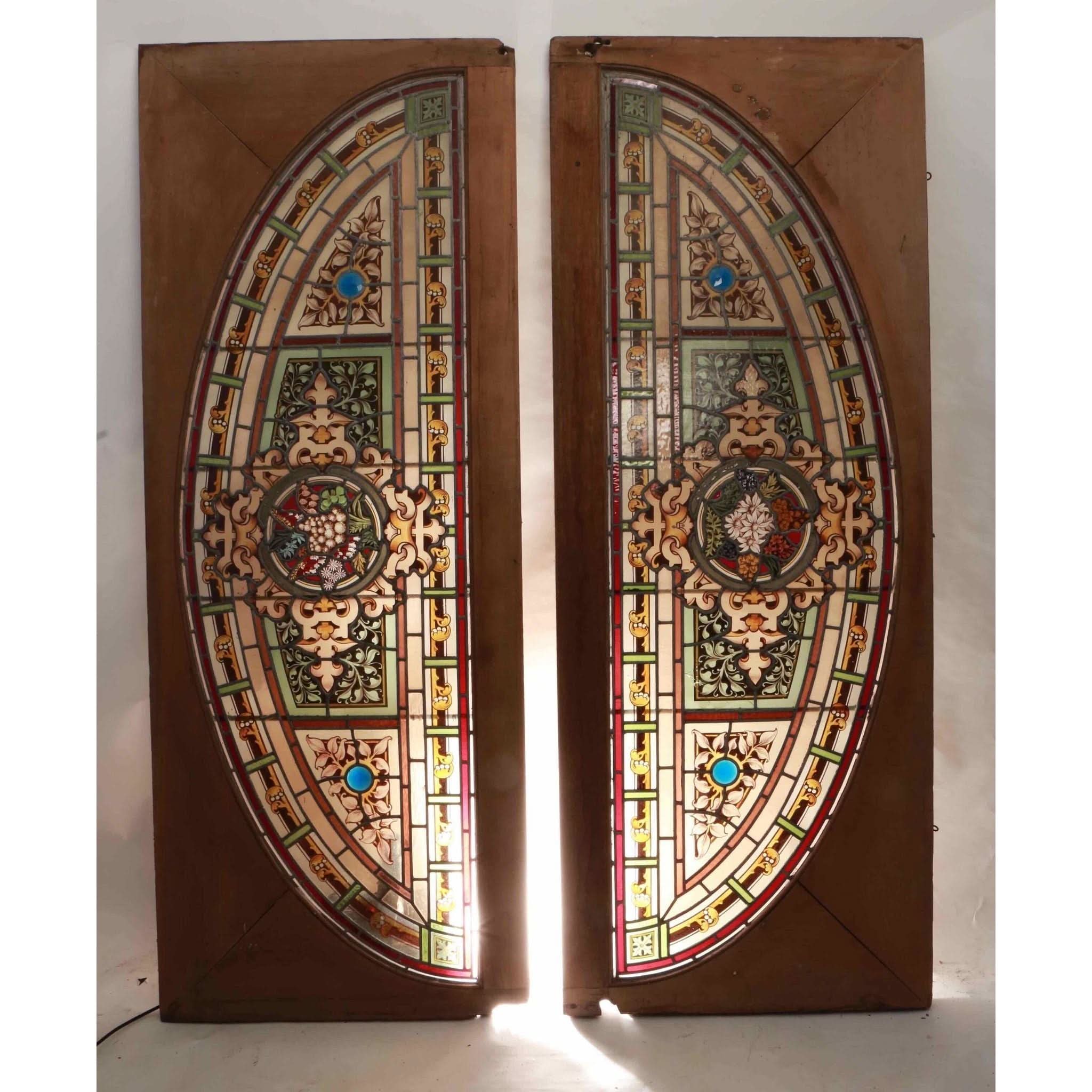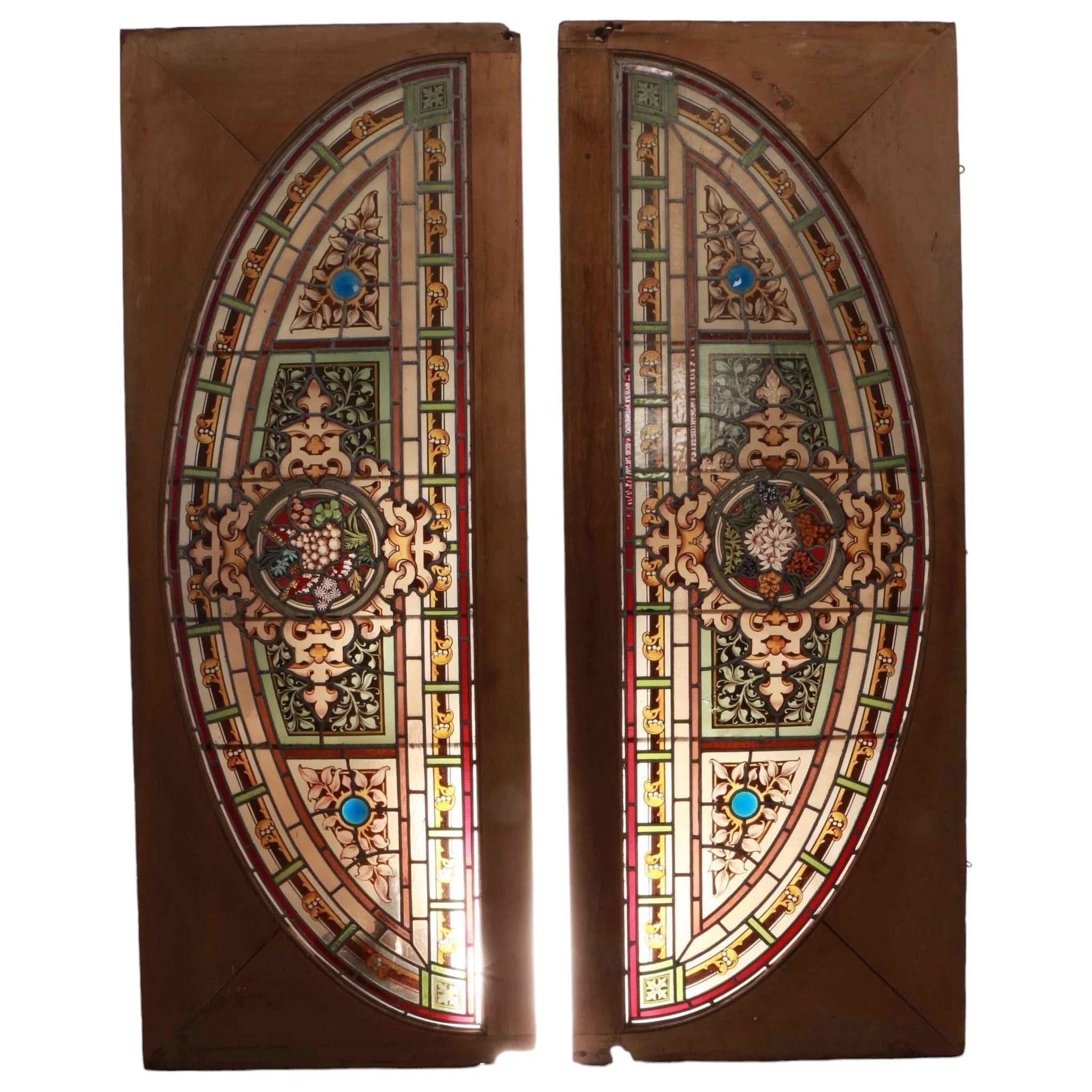 These are a rare Pair of very ‘high quality’ genuine Antique English Victorian arched Stained Glass and Lead Light Fanlights in their original Timber Frames. The panels are identical except for individual floral and leaf subjects in the centre of each panel.