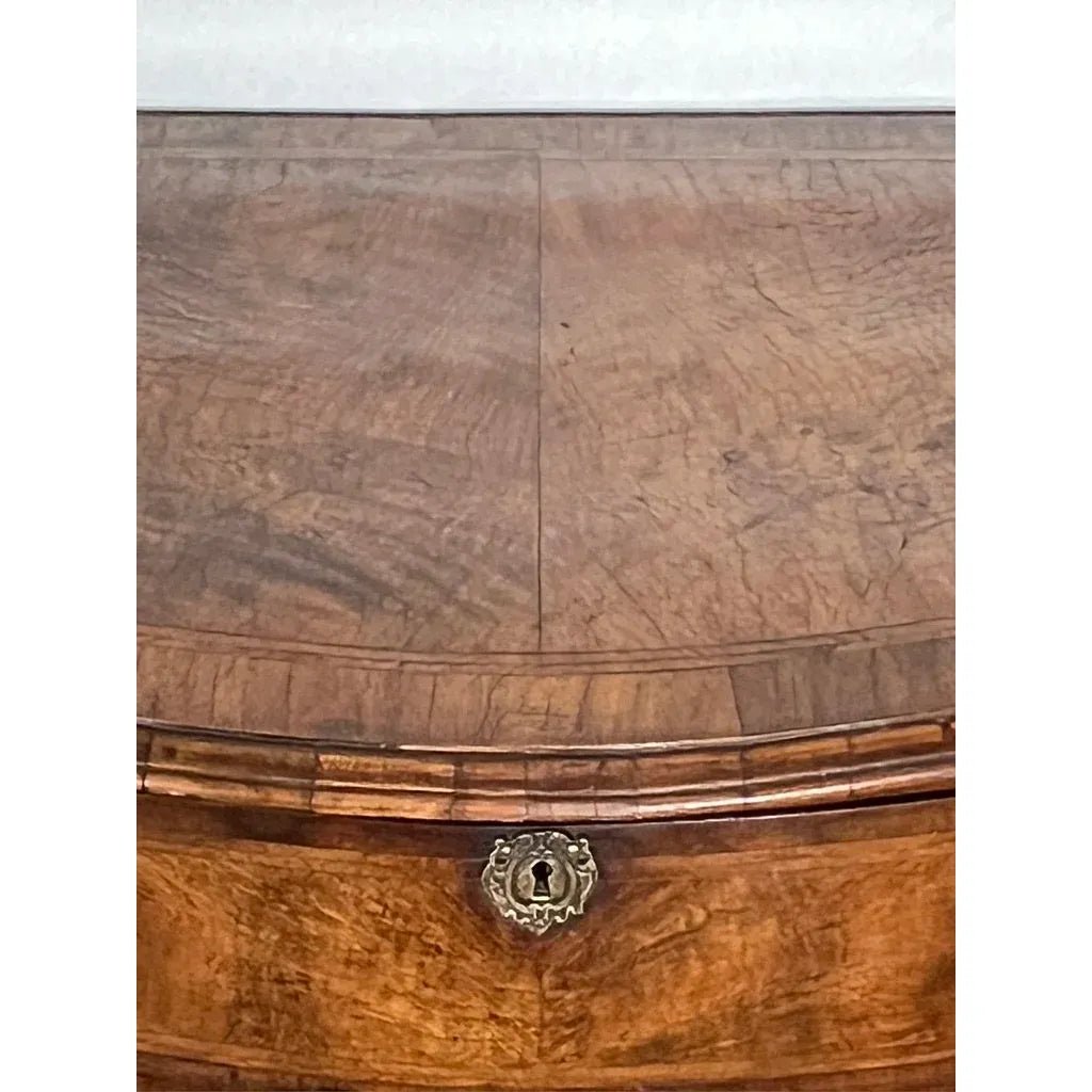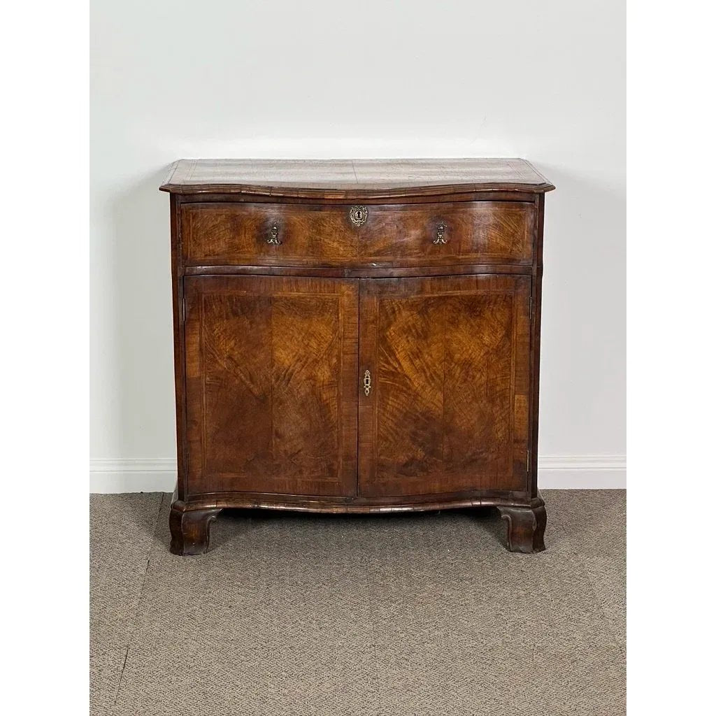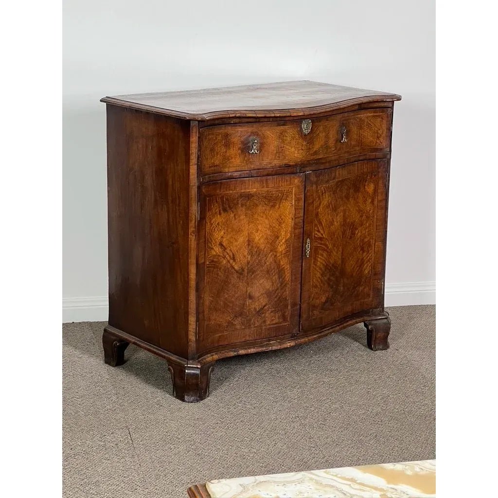All sections of the front are of serpentine form including the overhanging top, top full width flush fitting drawer, the pair of cupboard doors and the base with its shaped ‘ogee’ bracket feet.