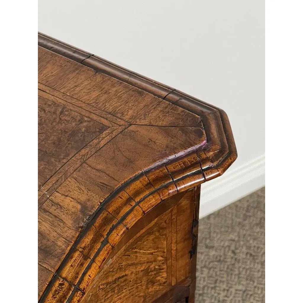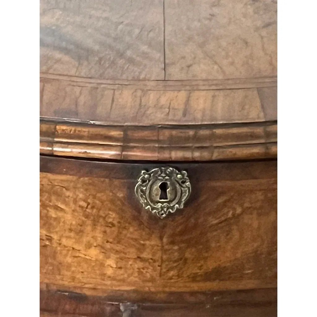The top has a decorative complex edge molding and an outer four sided cross banding with two inner lines of ‘herring bone’ line inlays. The main inner panel is ‘book leaf’ matched figured Walnut. This theme is continued throughout the full Oak lined full width flush fitting drawer ( complete with its lock and brass drawer pull handles ) and the pair of flush fitting doors with their brass key hole escutcheon. Within the cupboard is a full width shelf.