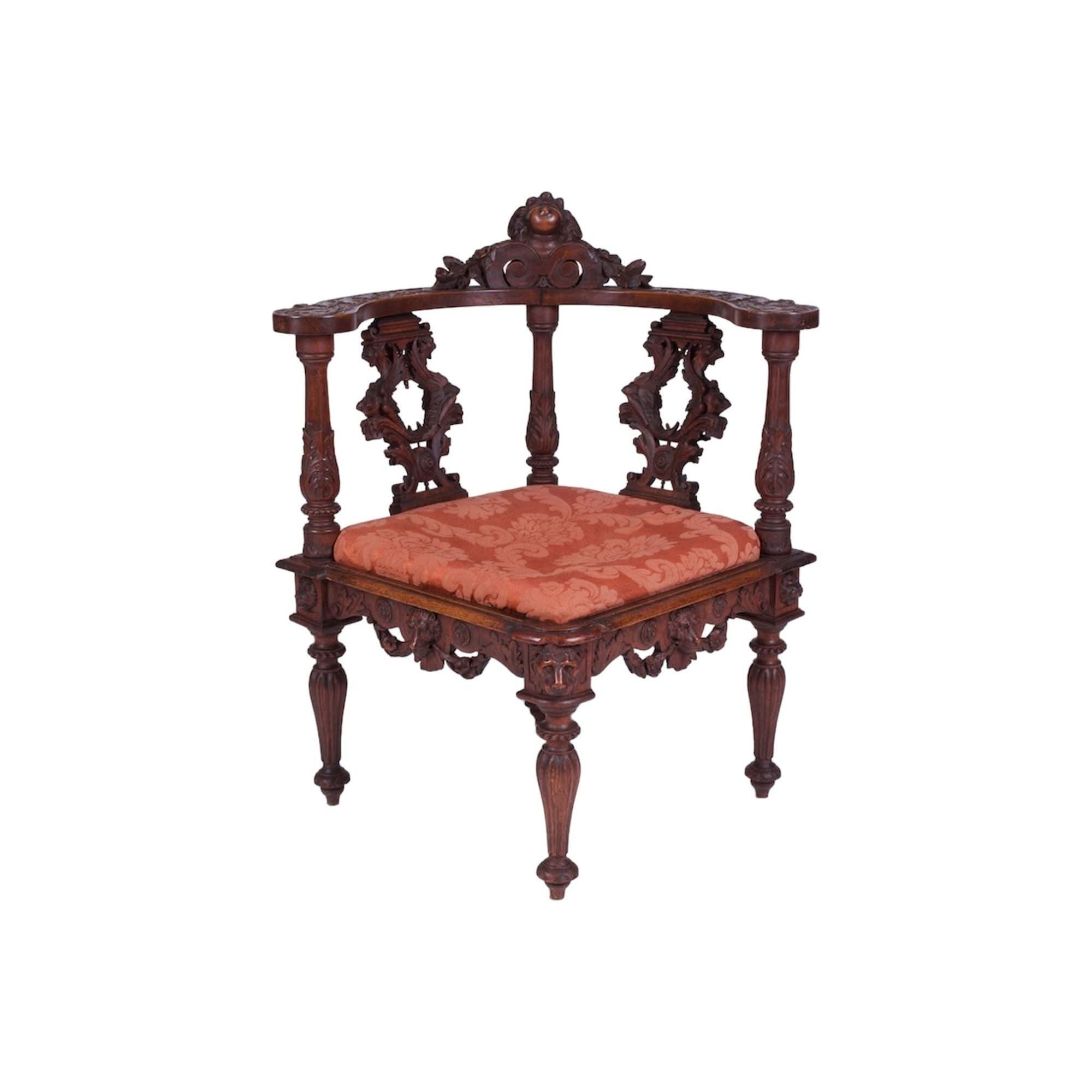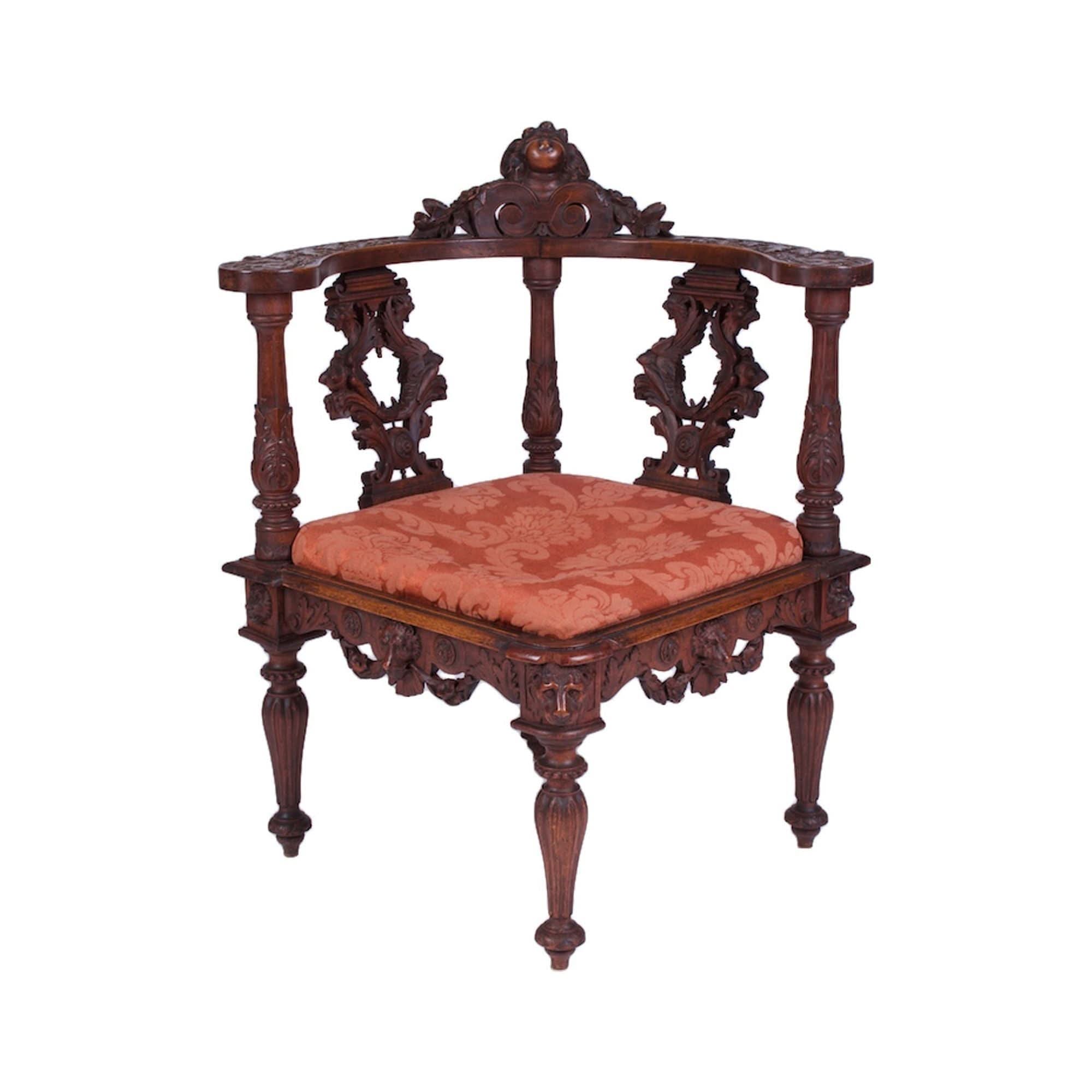 This is a most interesting and very good example of a genuine 19th century Italian carved, solid Walnut CORNER CHAIR in the baroque manner.