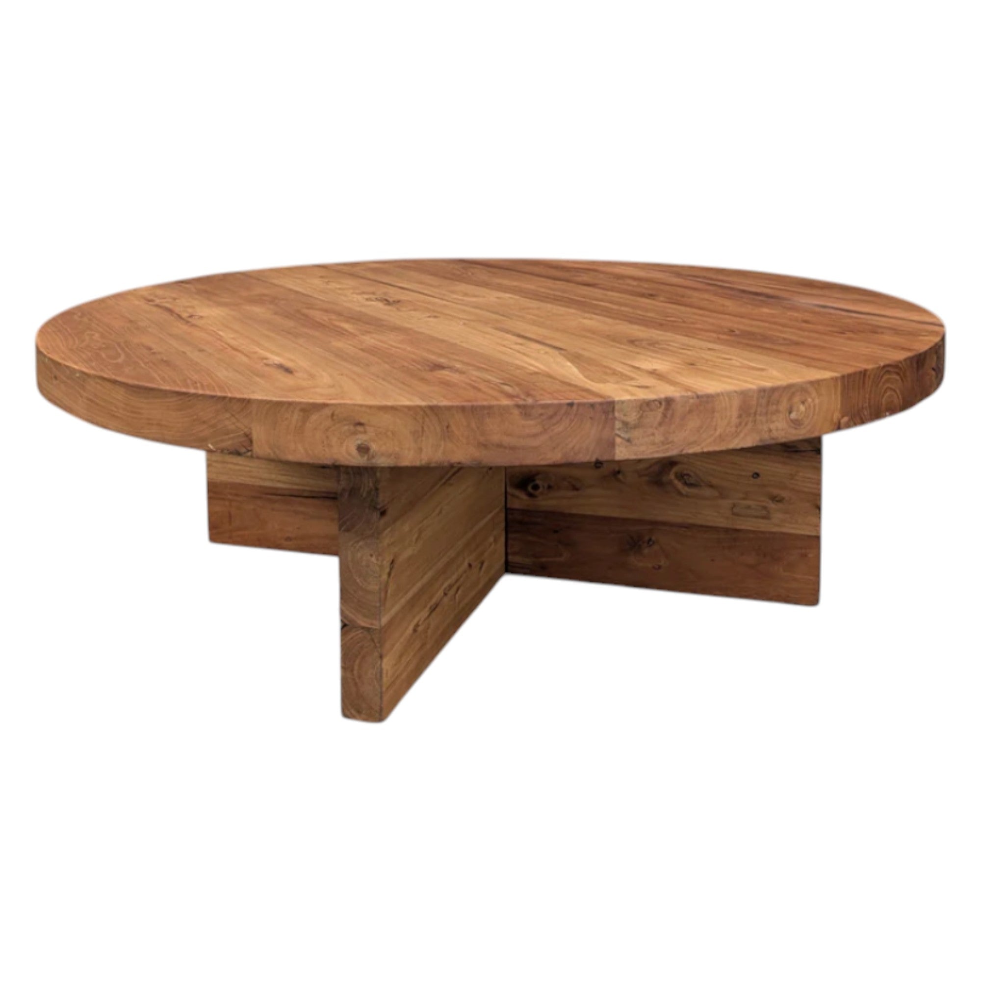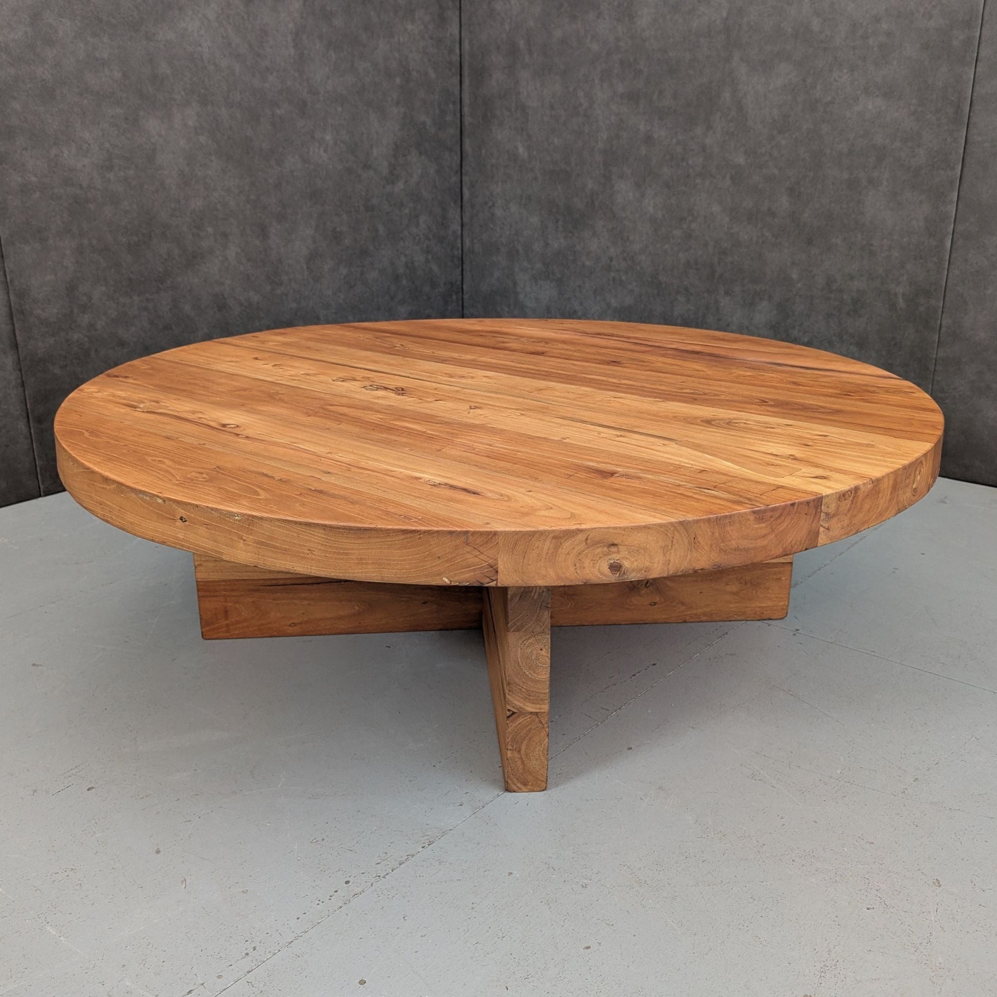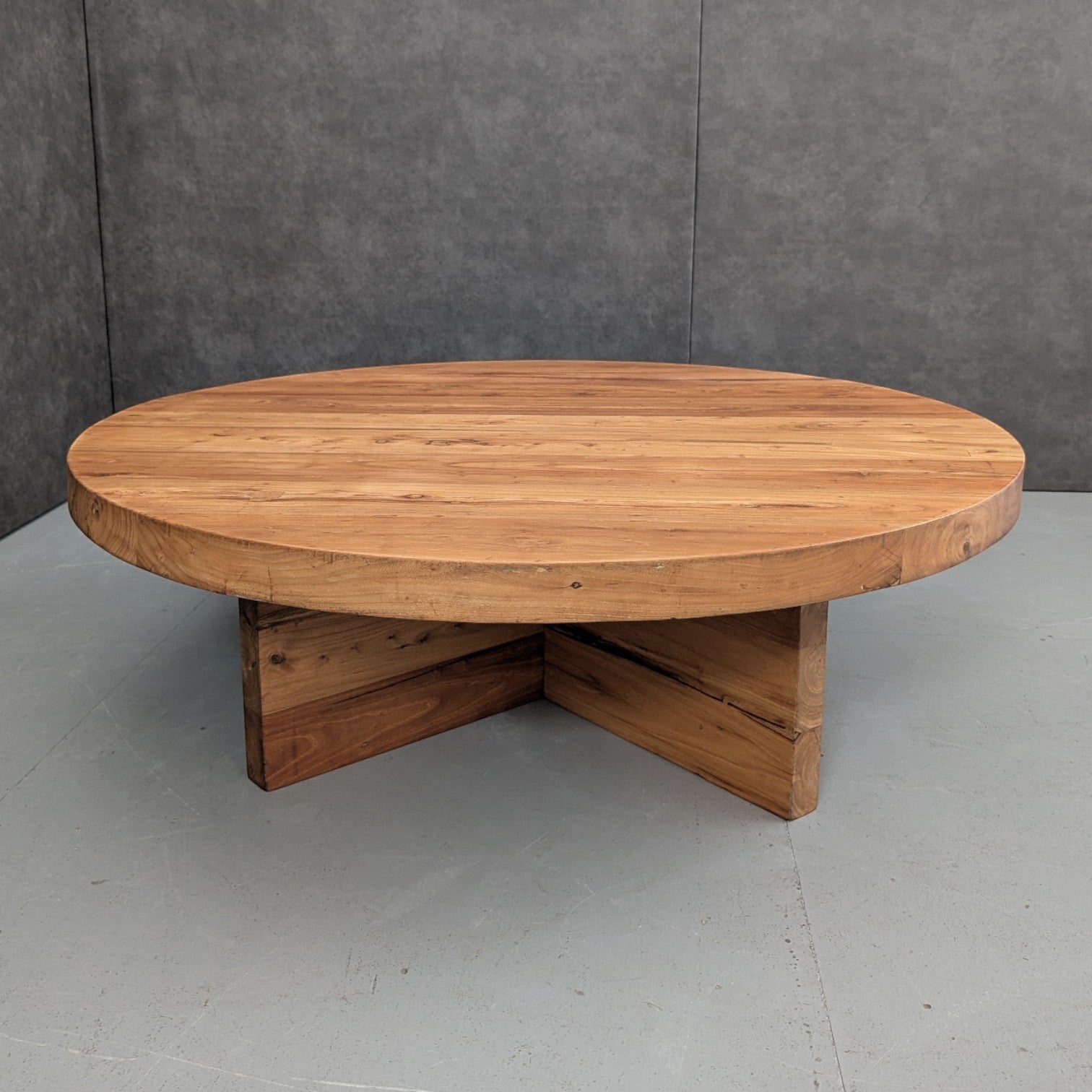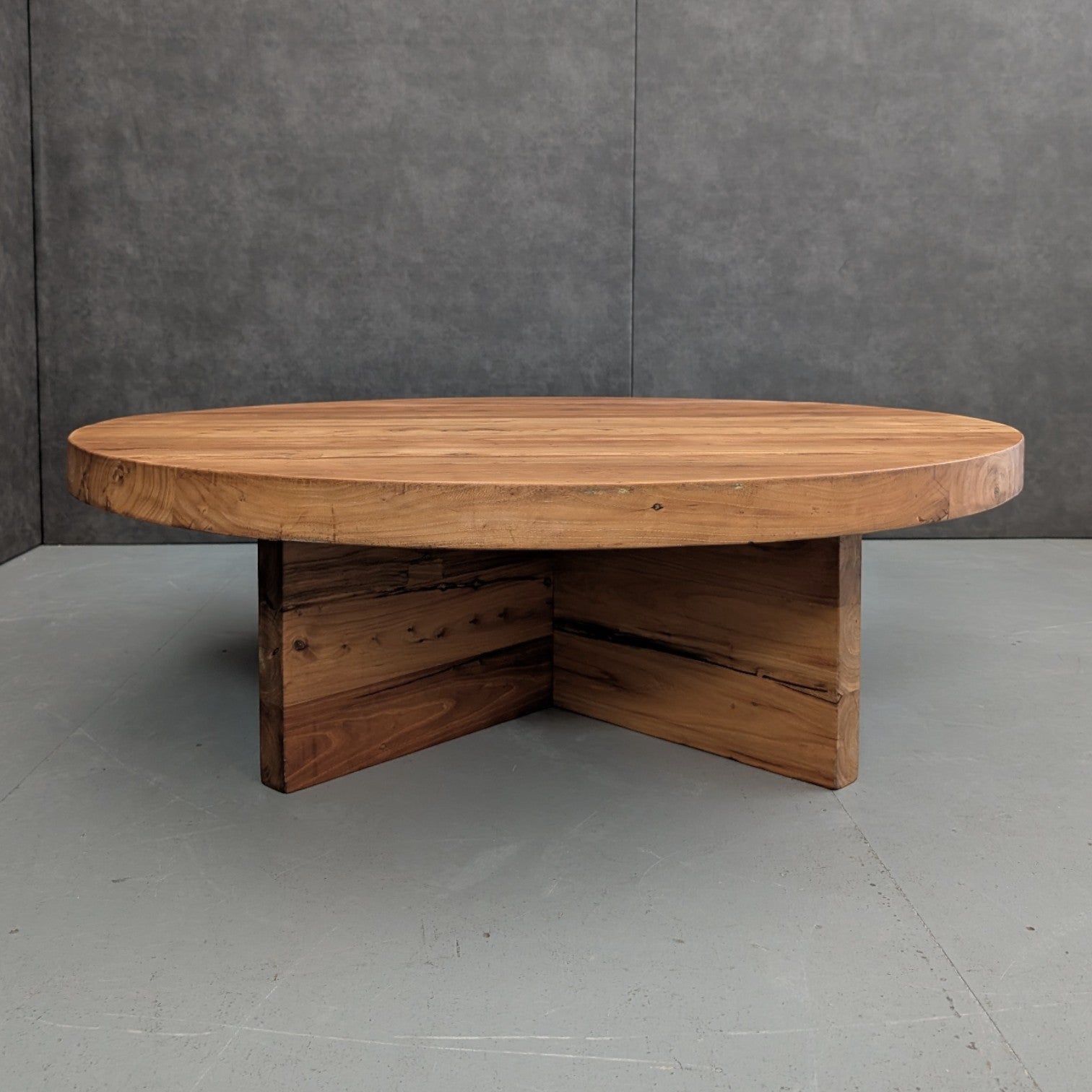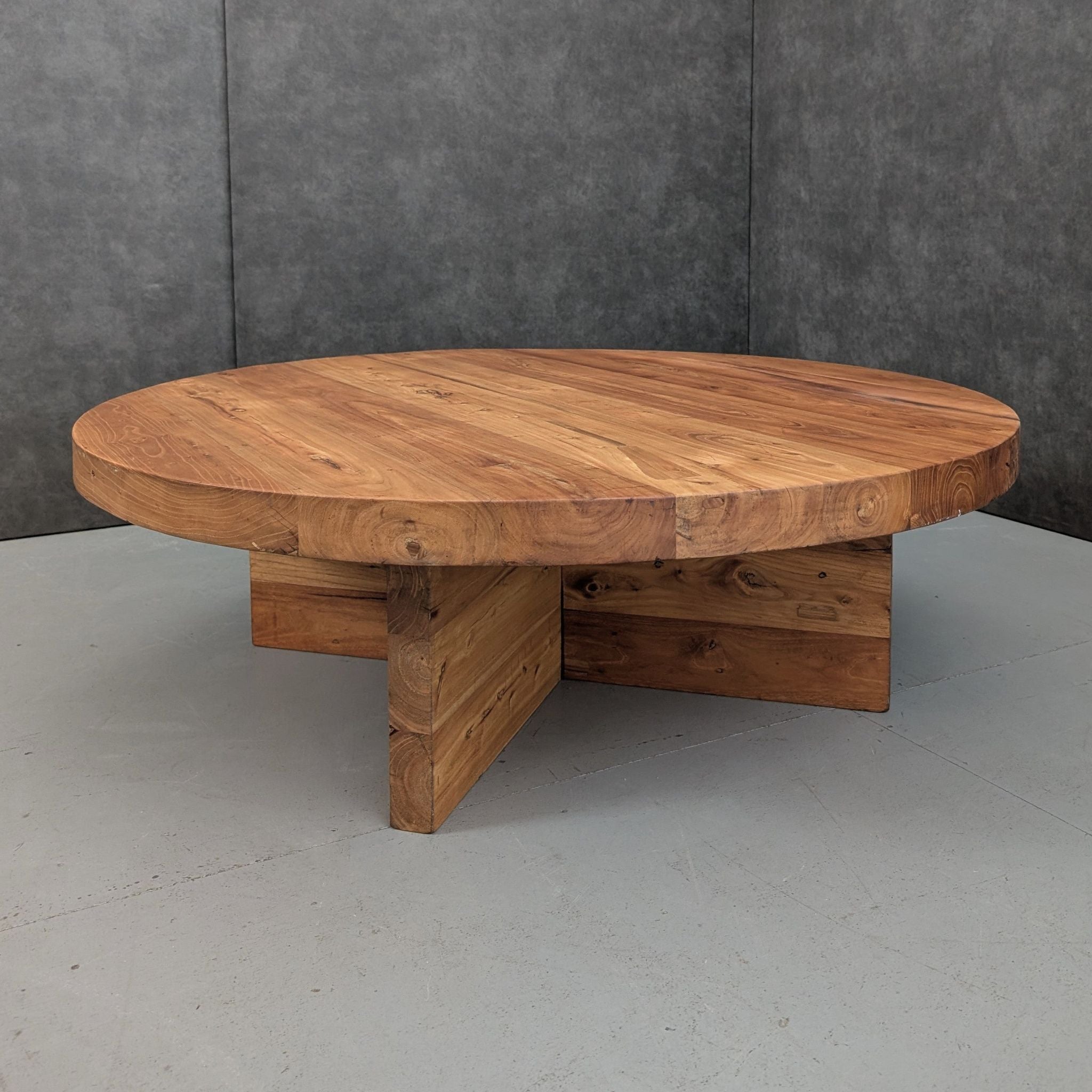 A low, grounded table that holds space through weight, proportion, and material presence rather than ornament.Constructed from wide solid elm boards, this large round coffee table is defined by mass and structural clarity, with a thick top and cross base pedestal formed from continuous elm panels. The surface retains natural variation through knots and grain movement, allowing the timber to remain legible rather than refined away. Recently oiled, the finish deepens contrast and brings warmth to the grain, temporarily shifting the tone toward a richer hue while preserving the table’s underlying restraint.