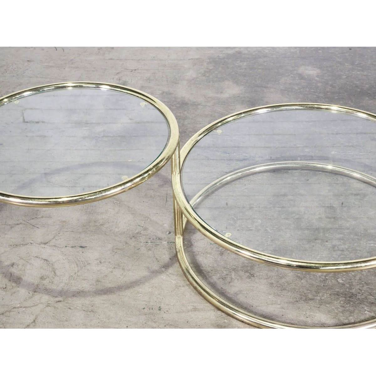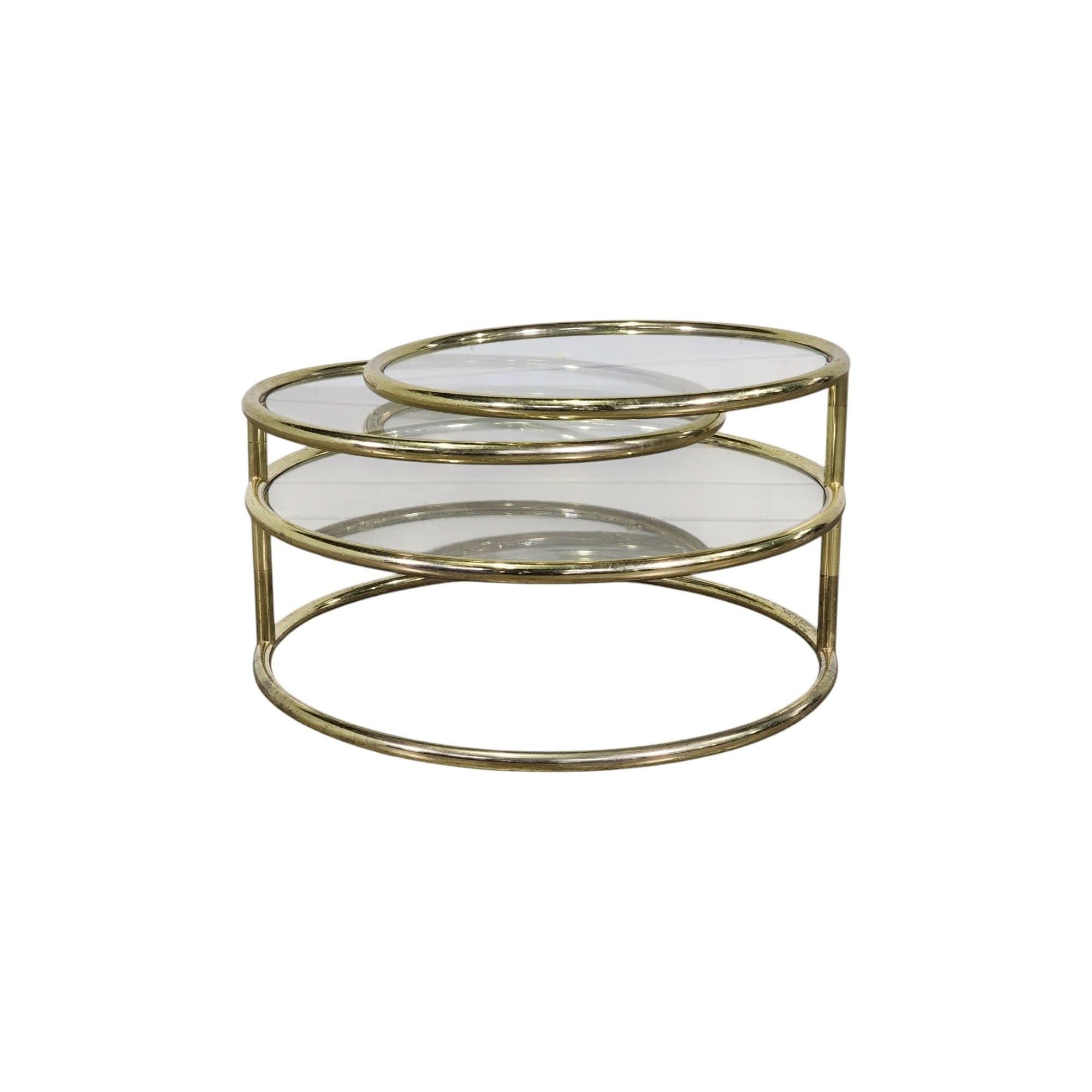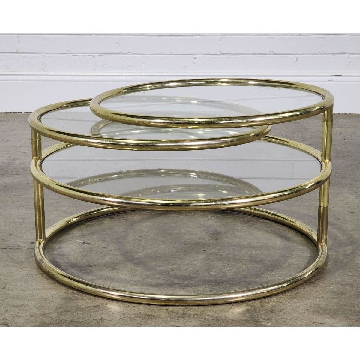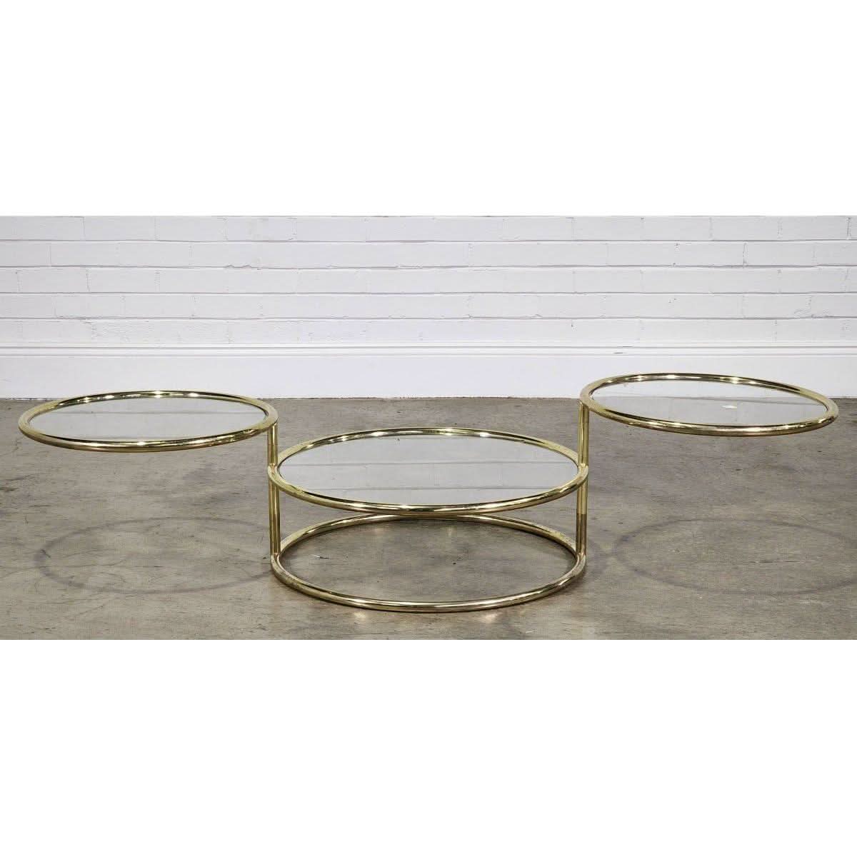 This beautiful, swivel coffee table was designed by Baughman in the 1970's. It consists of a brass frame with three trays that can be pulled out from the central body by two lateral joints. Each tray is topped with glass that fits snug into place.