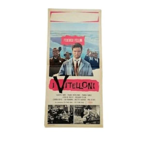 Authentic Locandina sized (70L x 33W cm) movie poster for Federico Fellini's iconic film "I Vitelloni". Directly translated to "the calves". The film was known as the "Young and the Passionate" in the English speaking countries. Fellini's third film as director & writer, I Vitelloni is frequently regarded as one of his best movies and the first of his classics. The movie's plot focusses on a group of young men living in a small seaside town, who struggle with immaturity and boredom as the excitement of summer passes. They are the Vitelloni, a bunch of layabouts living off the hard work of their parents and doing a whole lot of nothing.