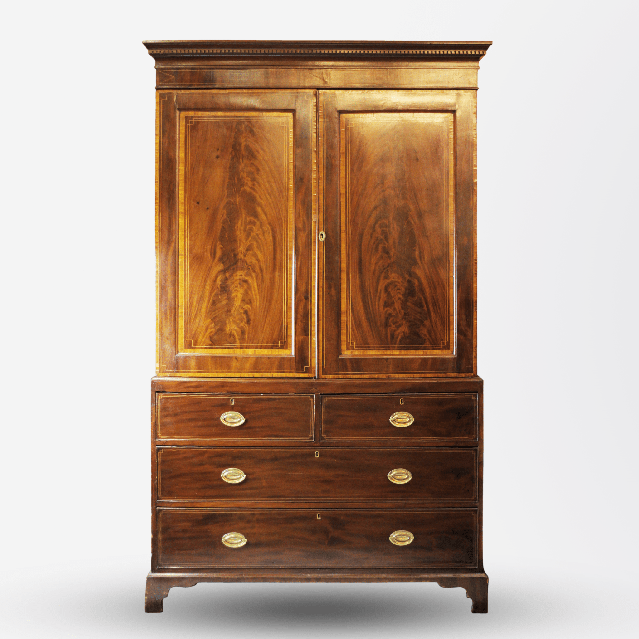 A George III mahogany linen press with inlaid stringing from late 18th century, England. An elegant solution for storing your bed sheets and towels.