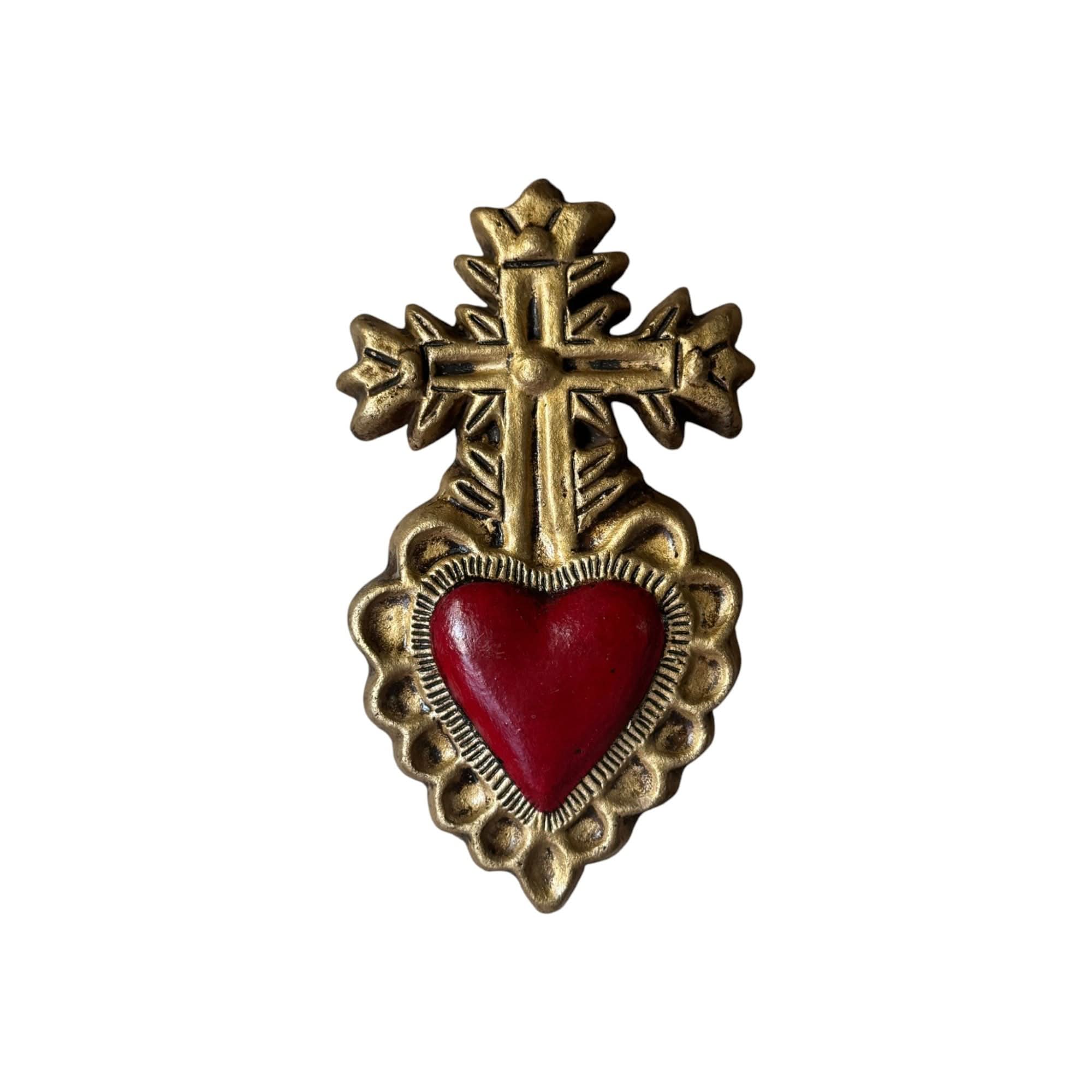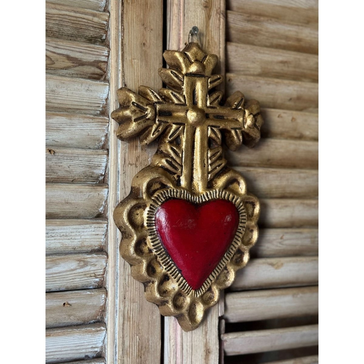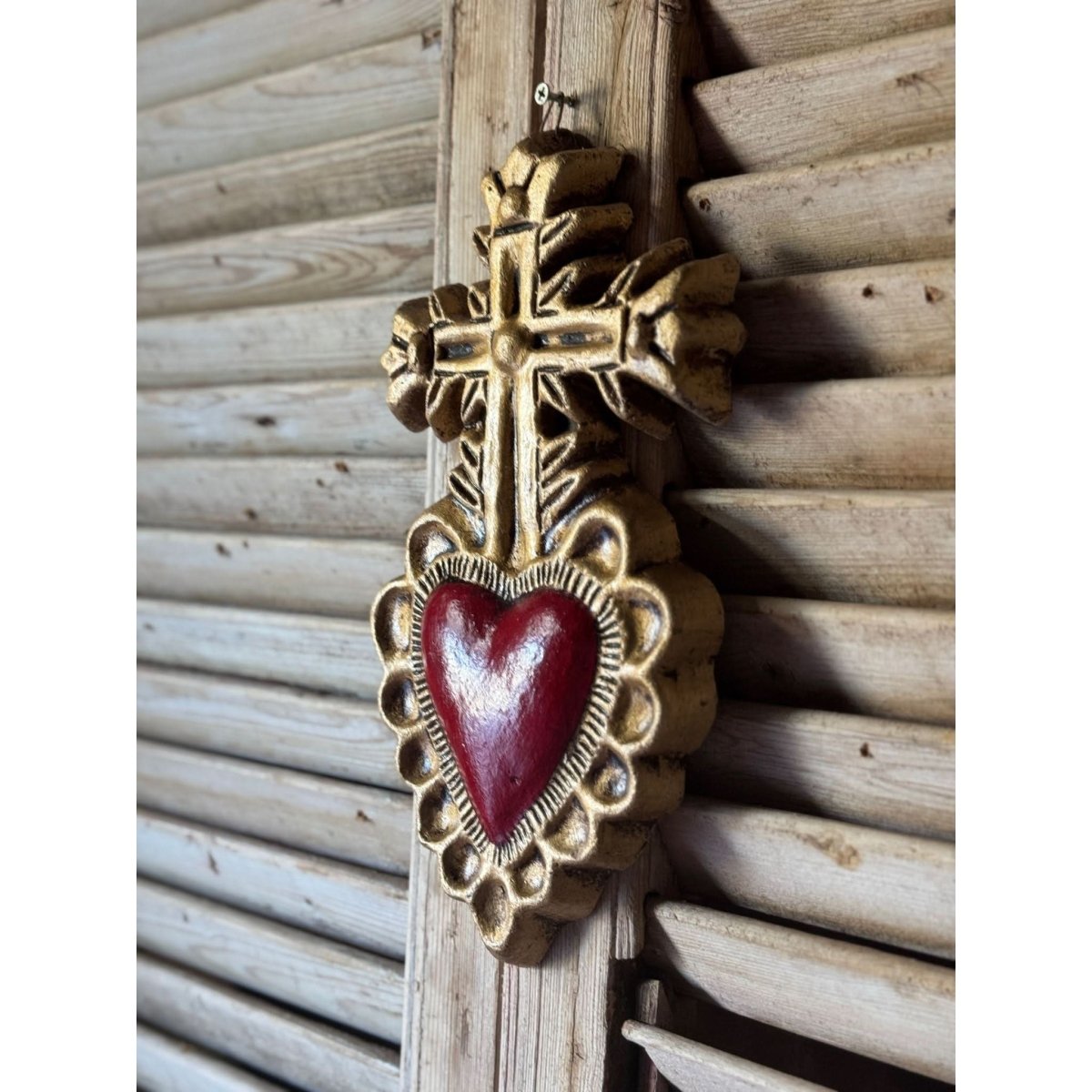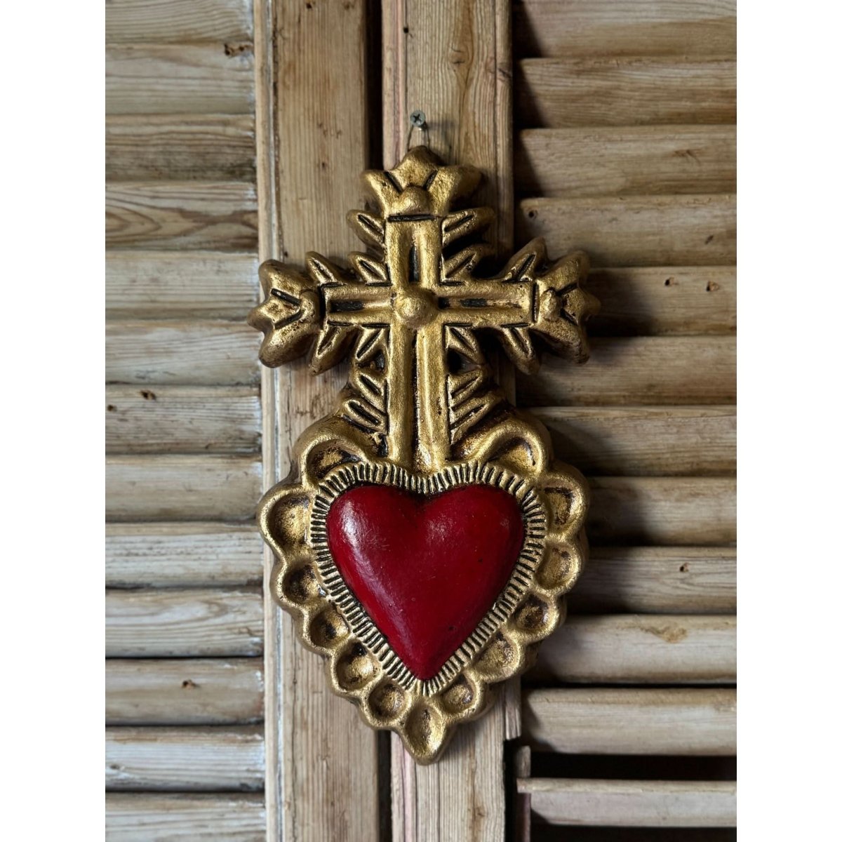 A lovely large sacred heart and cross wall hanging. Hand made and hand painted Made from patinated terracotta.