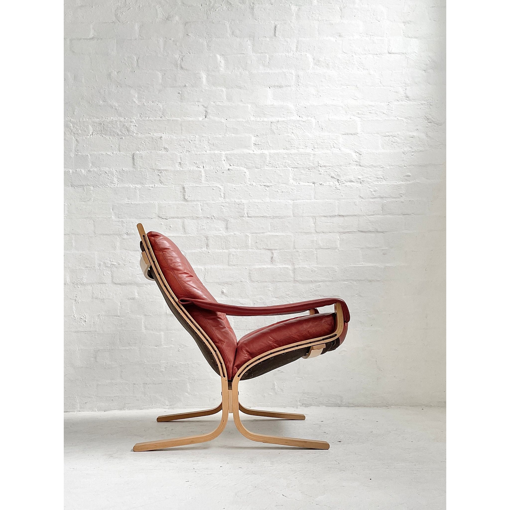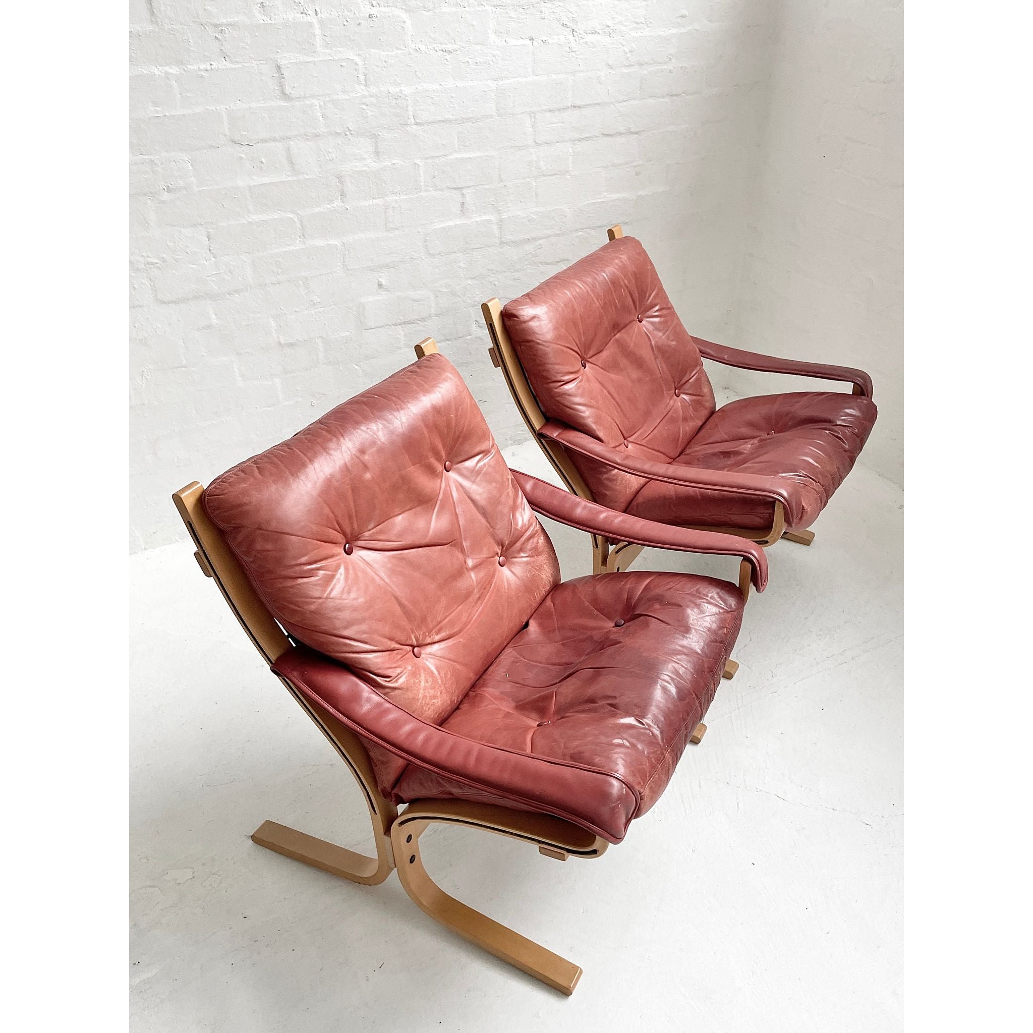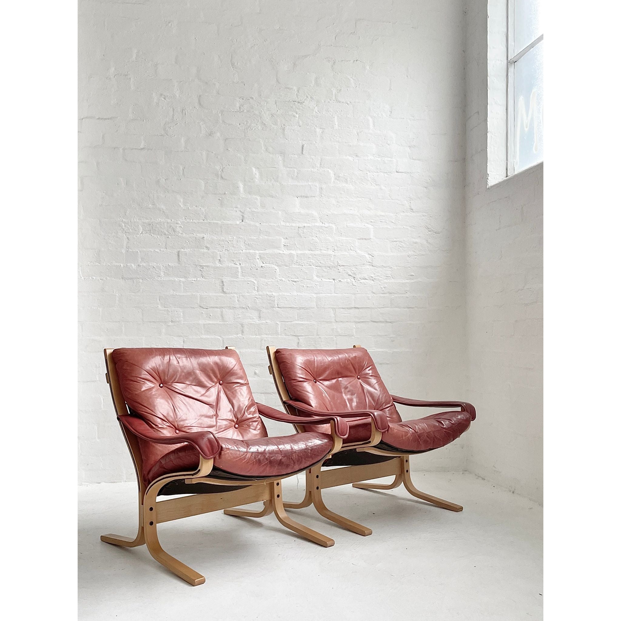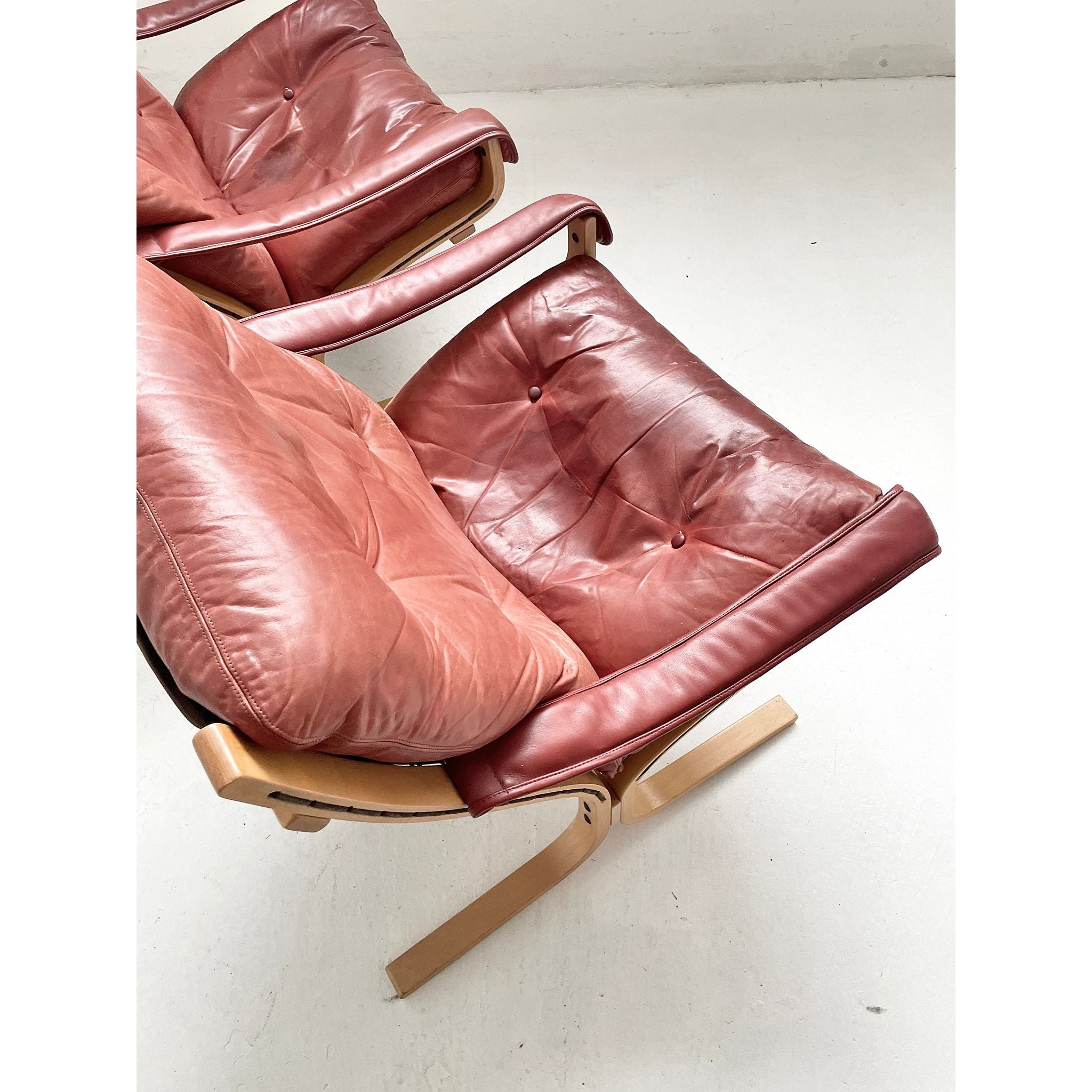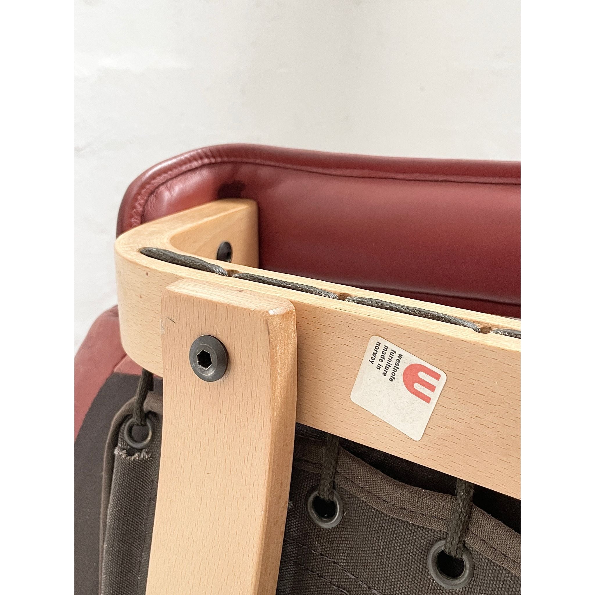 In pale beech and red leather. Produced by Westnofa, Norway. In original vintage condition. Pair available, price per chair.