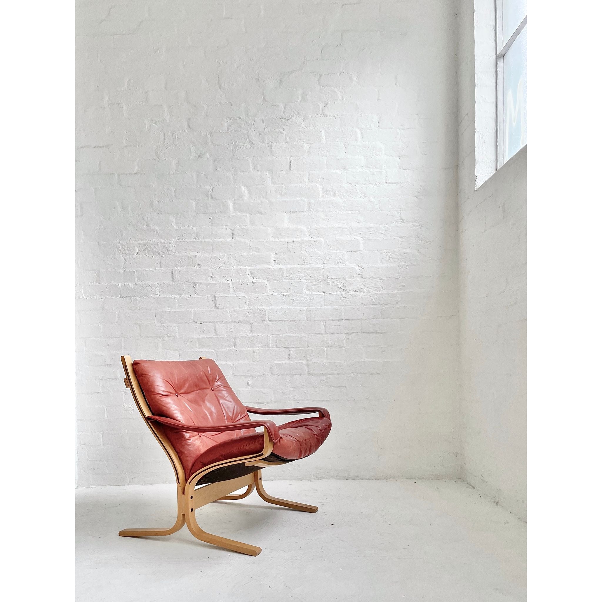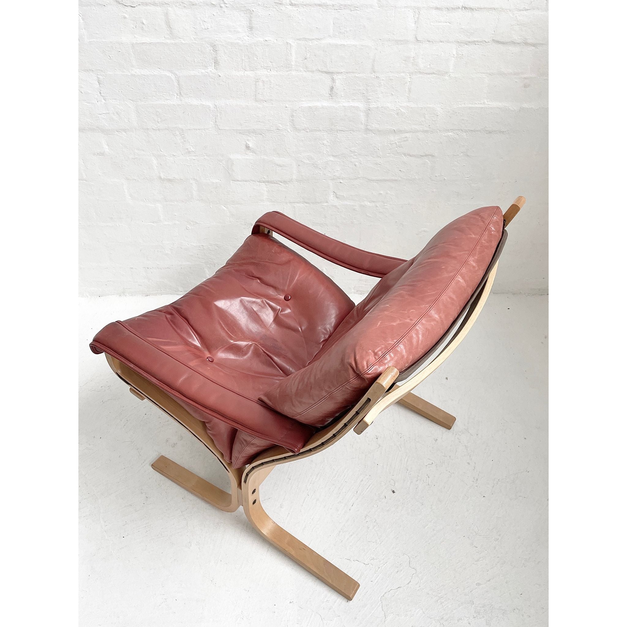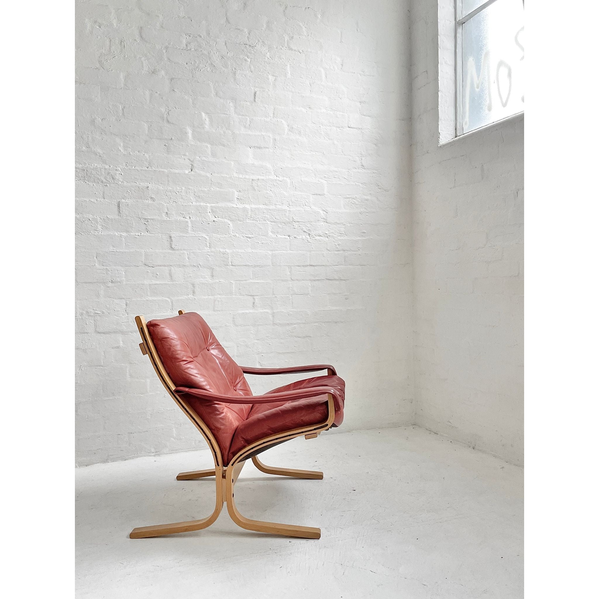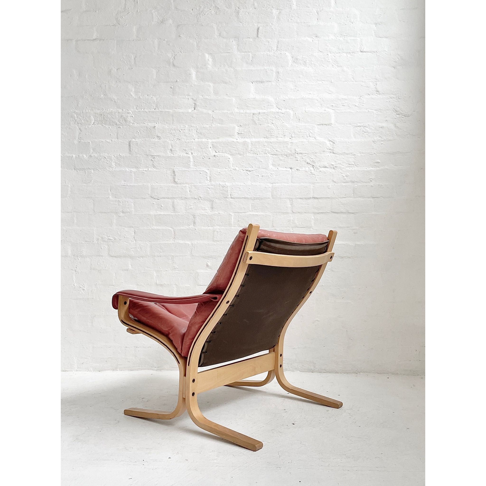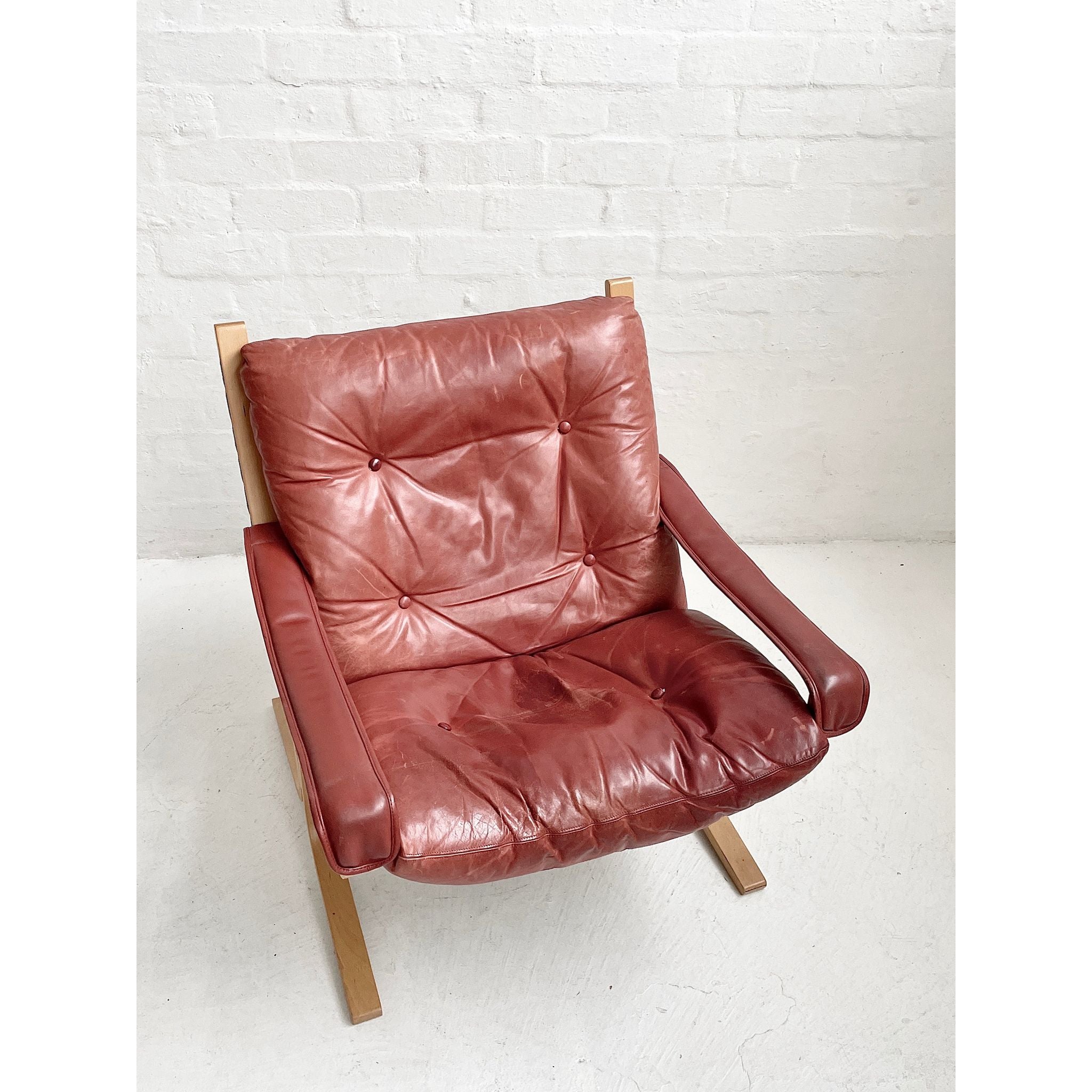 In pale beech and red leather. Produced by Westnofa, Norway. In original vintage condition. Pair available, price per chair.