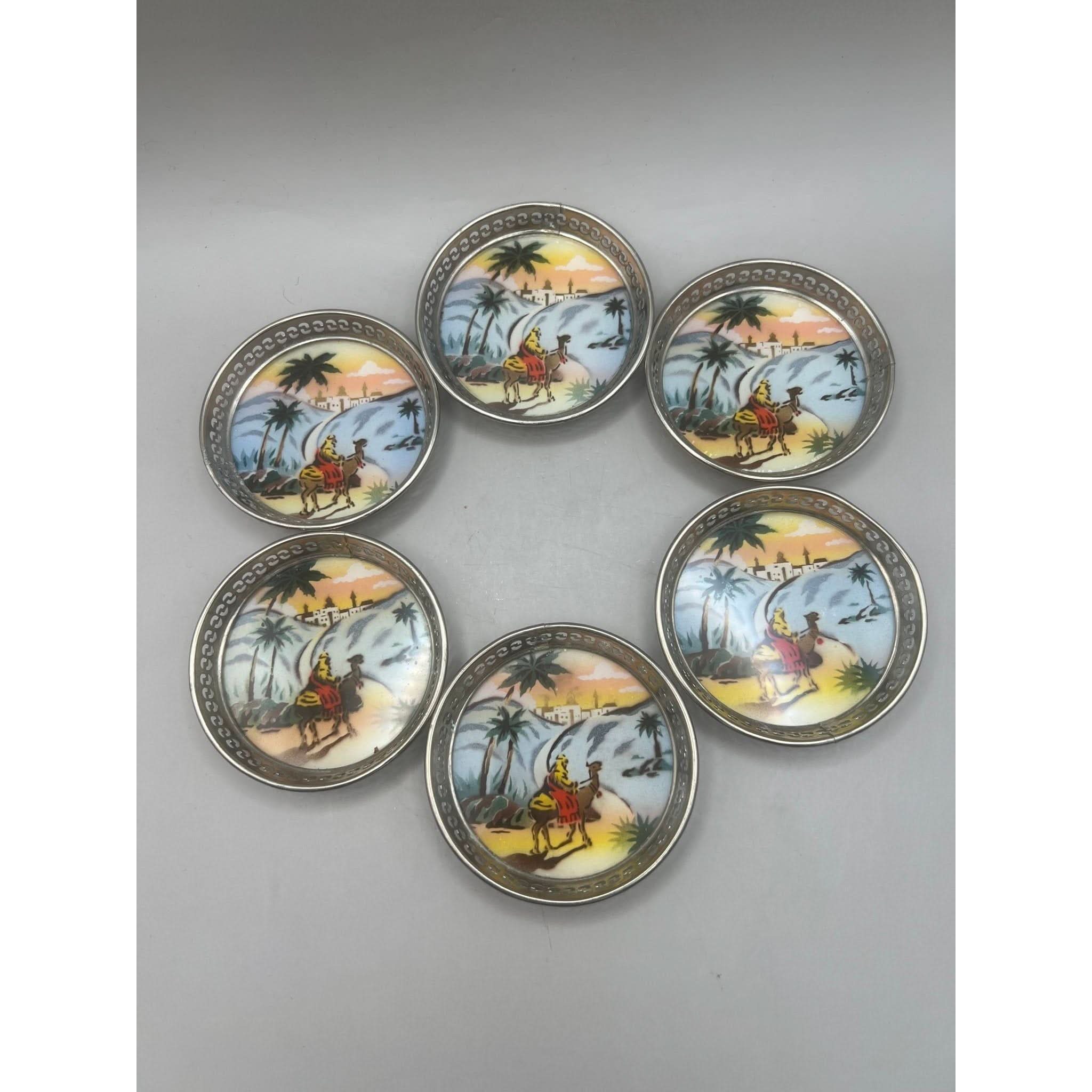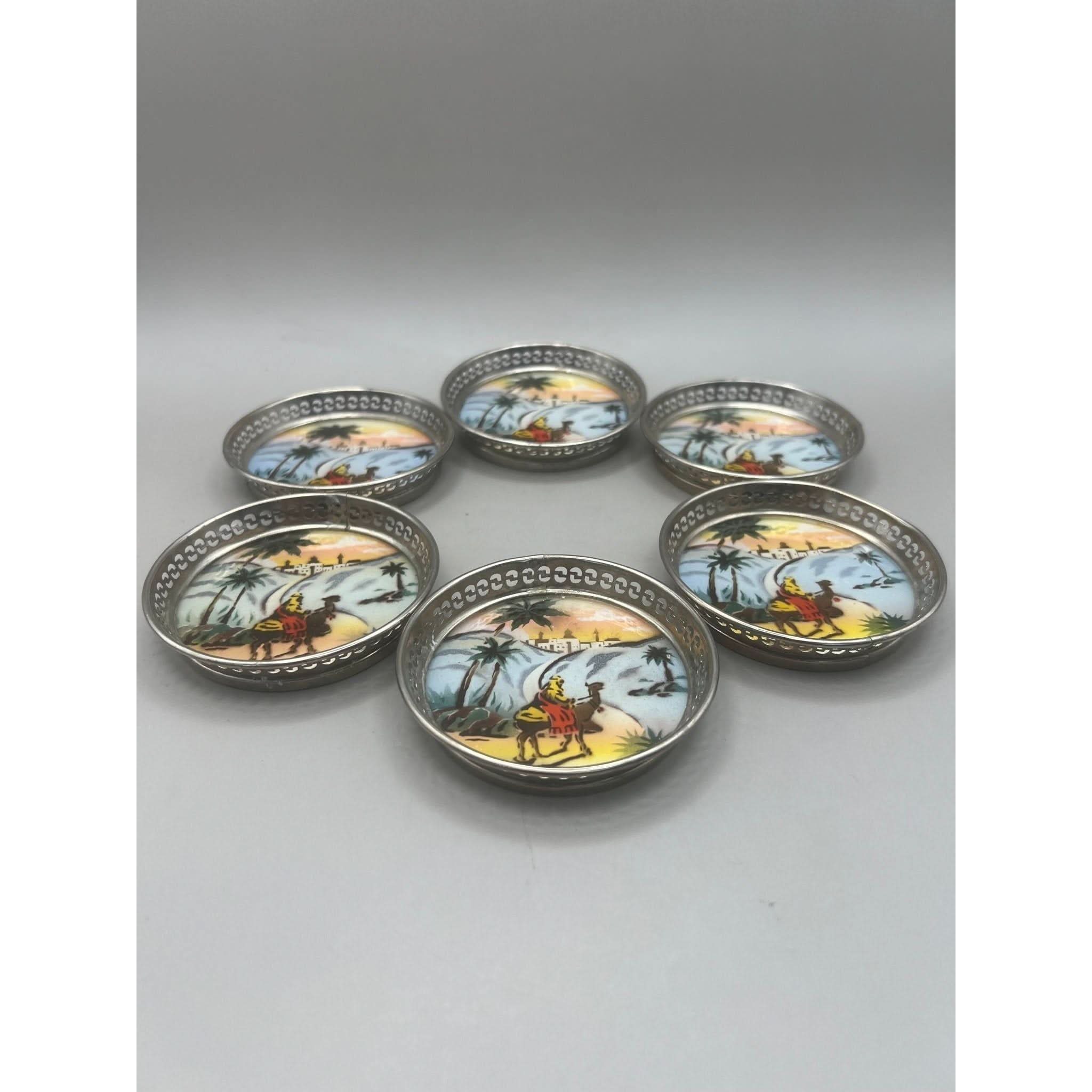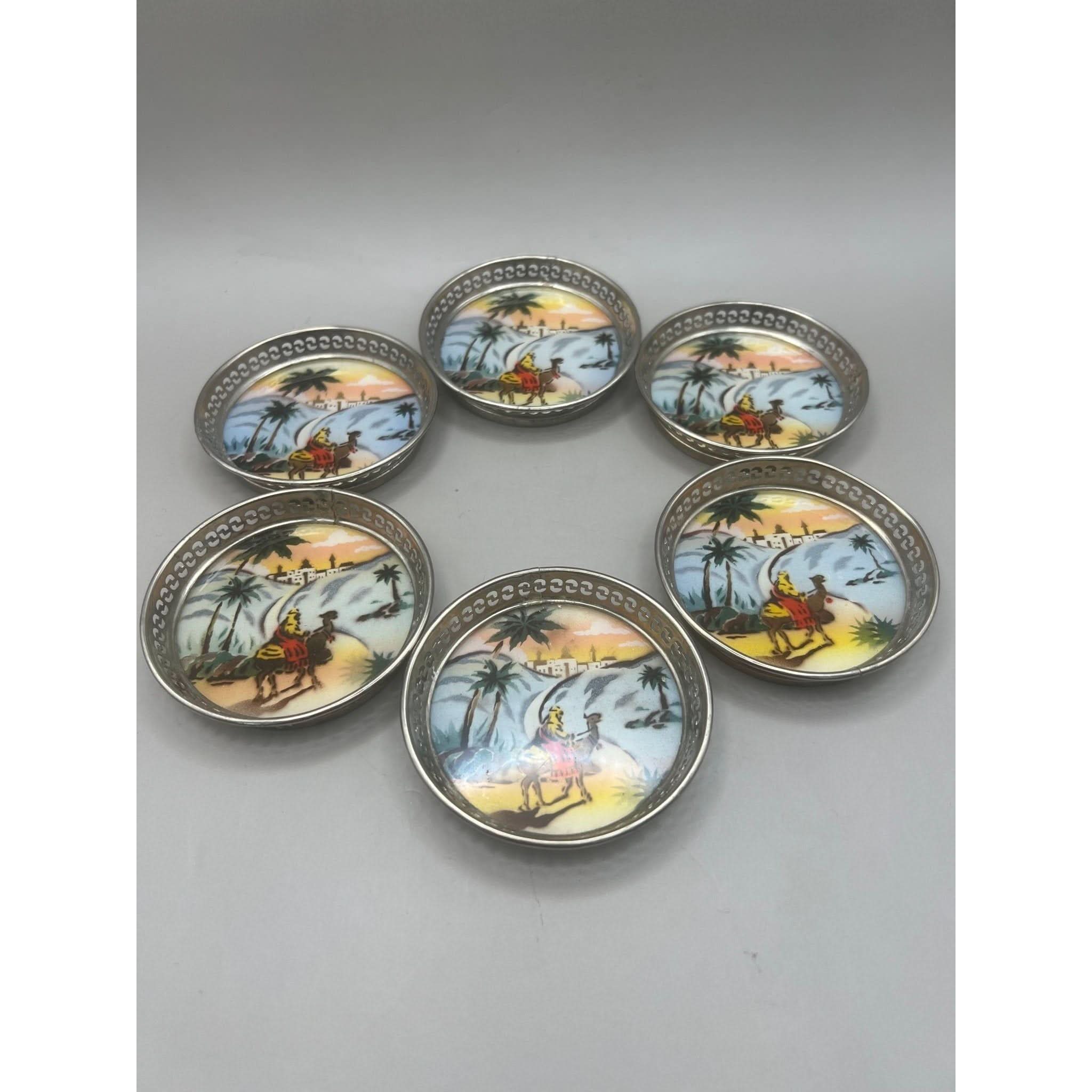 Made in the 1960s in Japan, these coasters have a hand painted glass base and metal edges which have stamped cutouts.