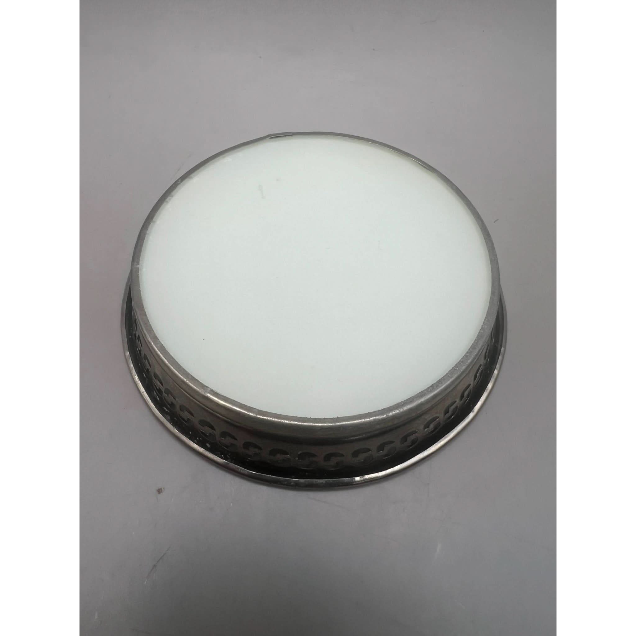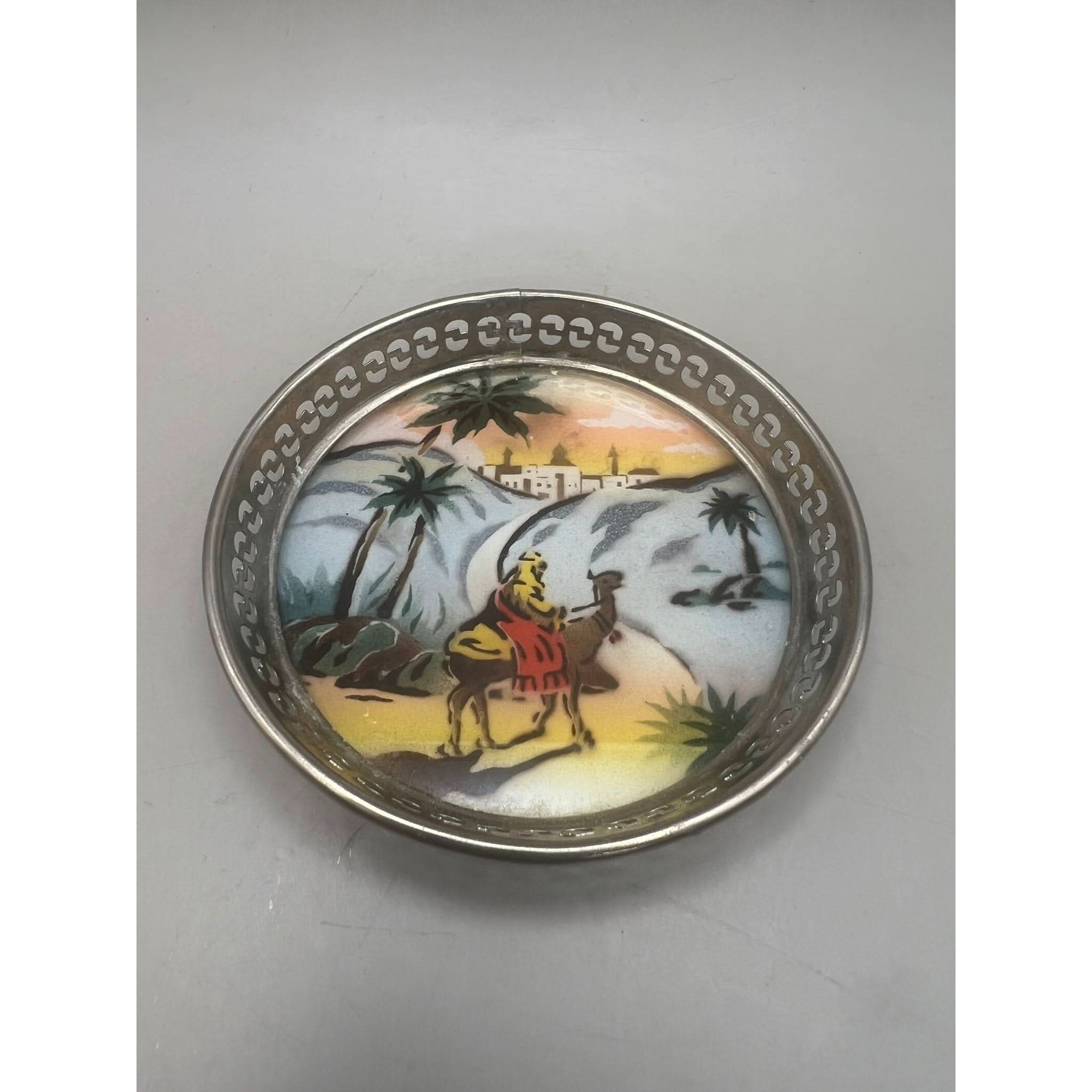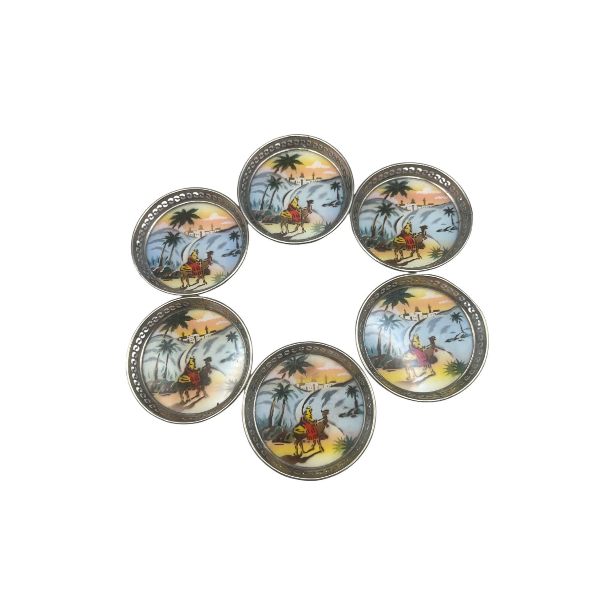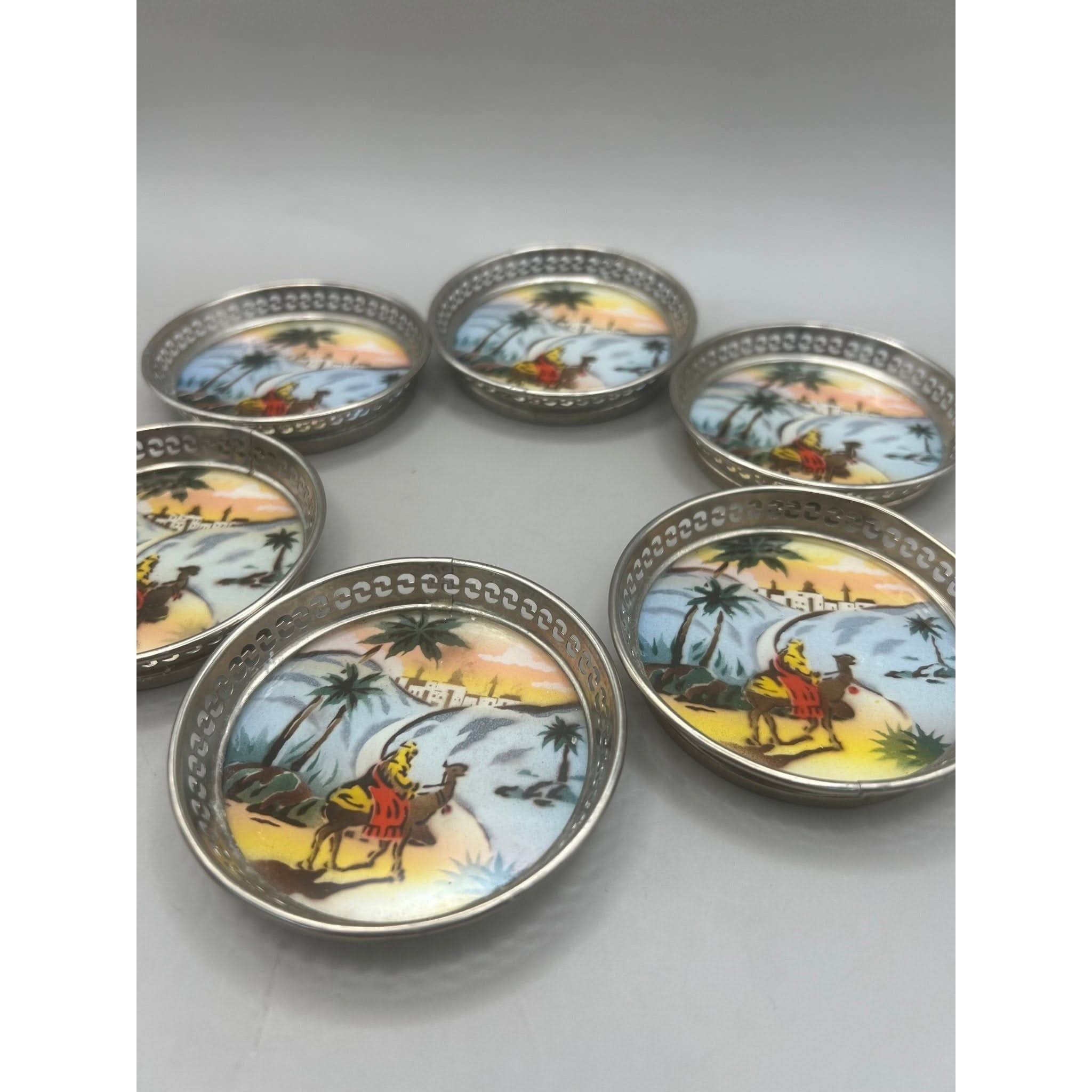 Made in the 1960s in Japan, these coasters have a hand painted glass base and metal edges which have stamped cutouts.