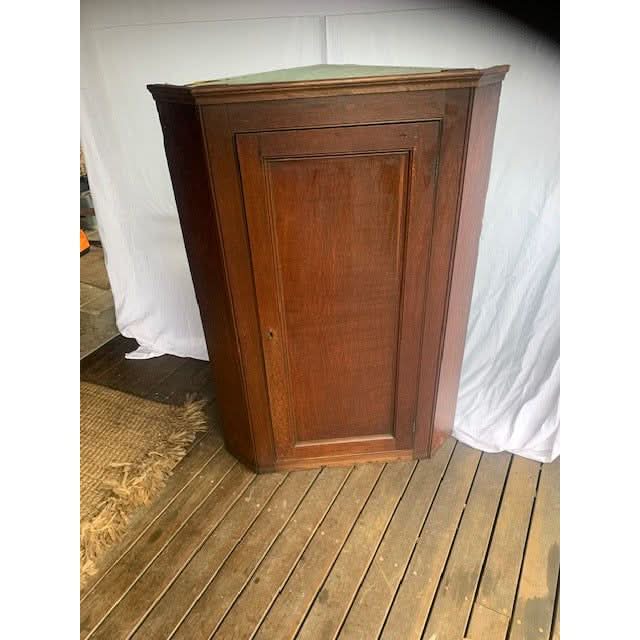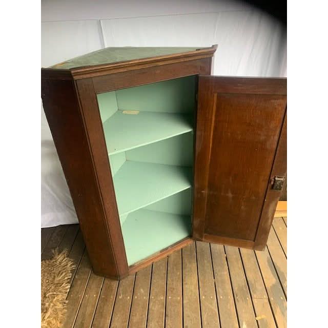 A English pollard Oak wall mounted cottage corner cupboard from late 19thC with replaced backboard, good colour and original finish. Circa 1880.