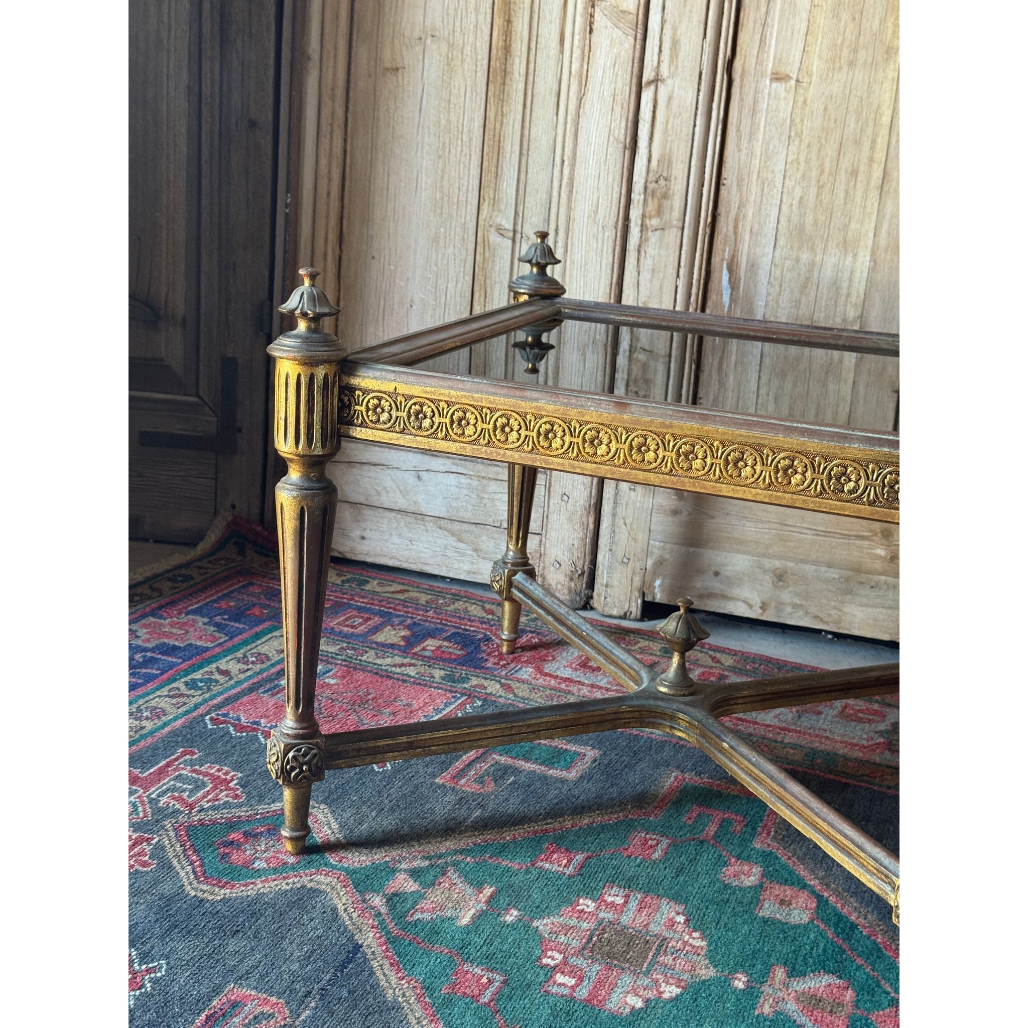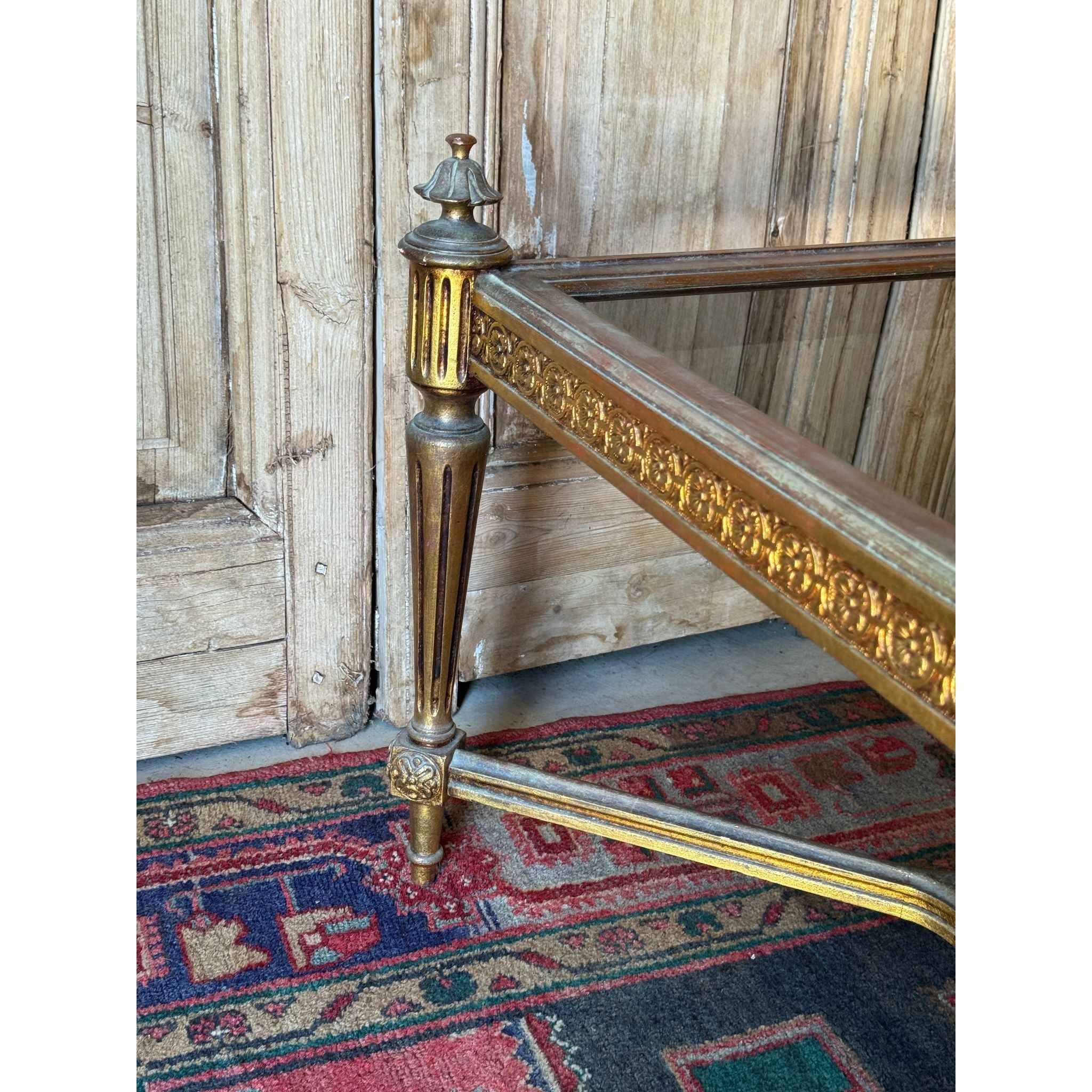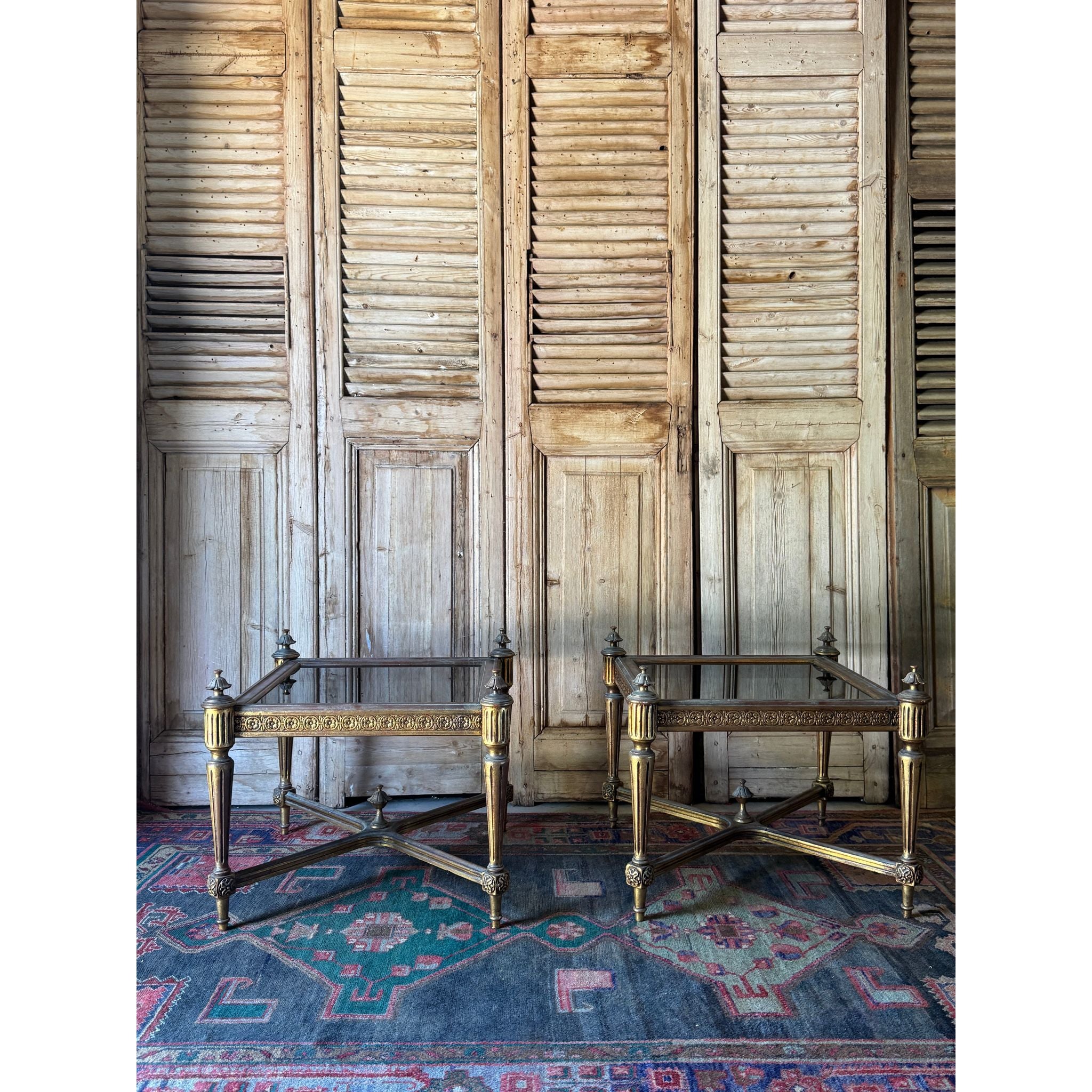 A refined pair of Louis XVI style side tables featuring gilt framed bases with classic fluted legs, decorative rosette detailing and a stretcher base for added structure and balance. Each table is topped with a smoky glass insert that sits neatly within the frame. Elegant and architectural, these tables work beautifully flanking a sofa, bed or fireplace, or used together in a formal sitting room setting. With generous proportions, these tables make a versatile pair that suit both traditional and layered contemporary interiors. The gilt finish shows gentle age related wear / patina, consistent with age and use. The smoky glass tops are in good vintage condition with light surface marks typical of glass. Structurally sound and ready for use. Sold as a matching pair.