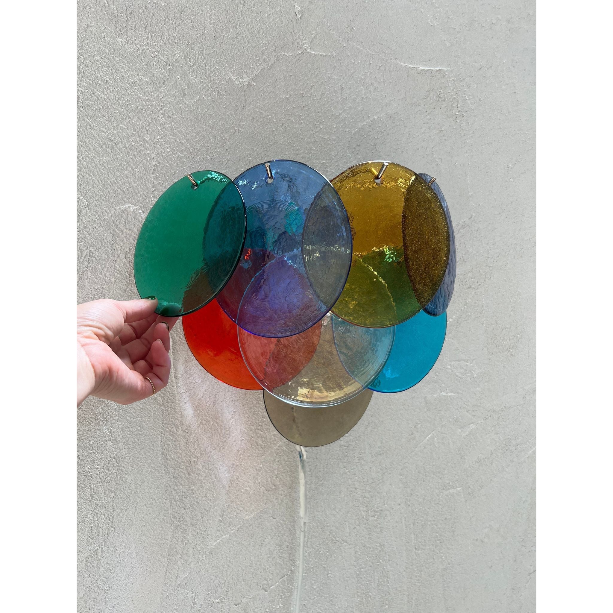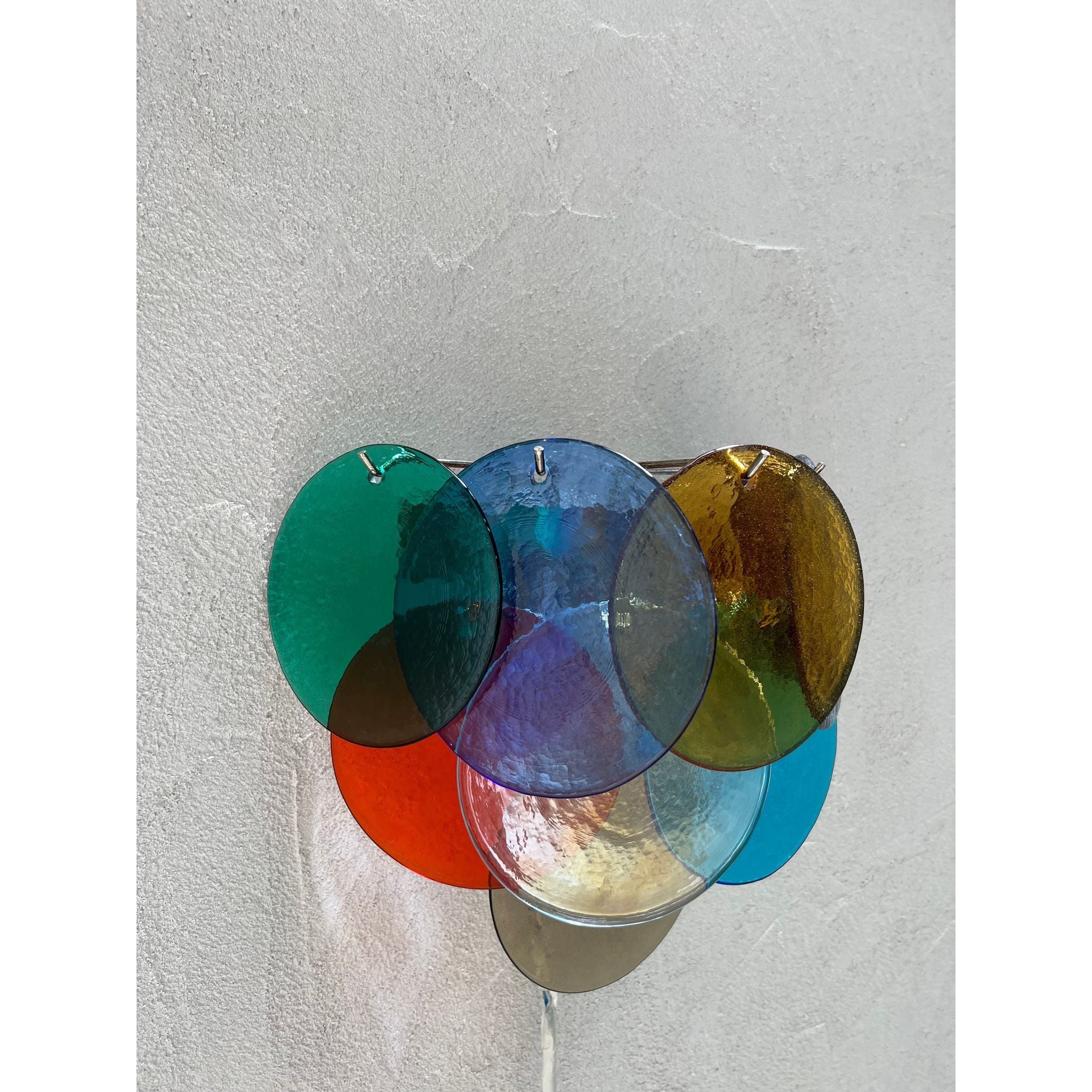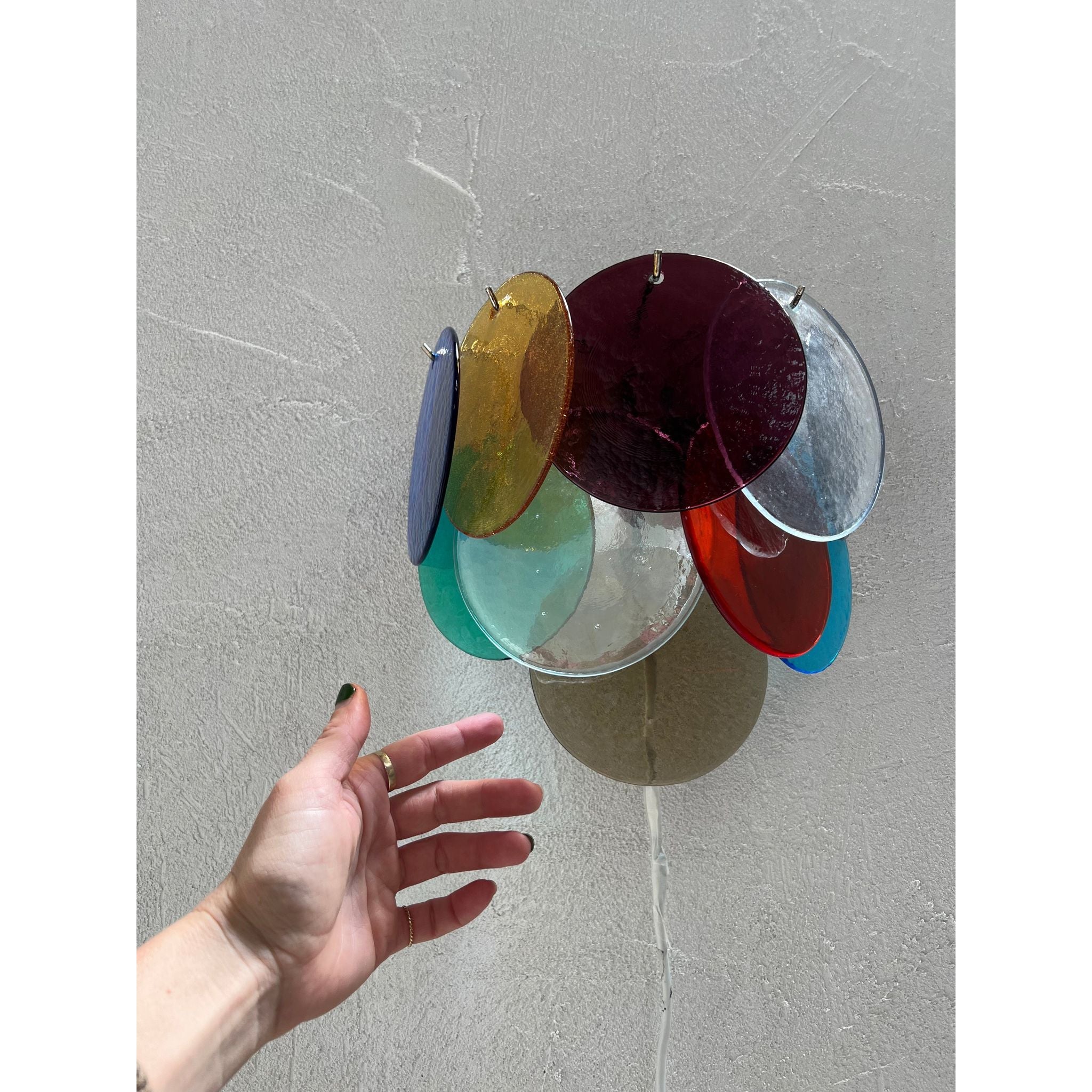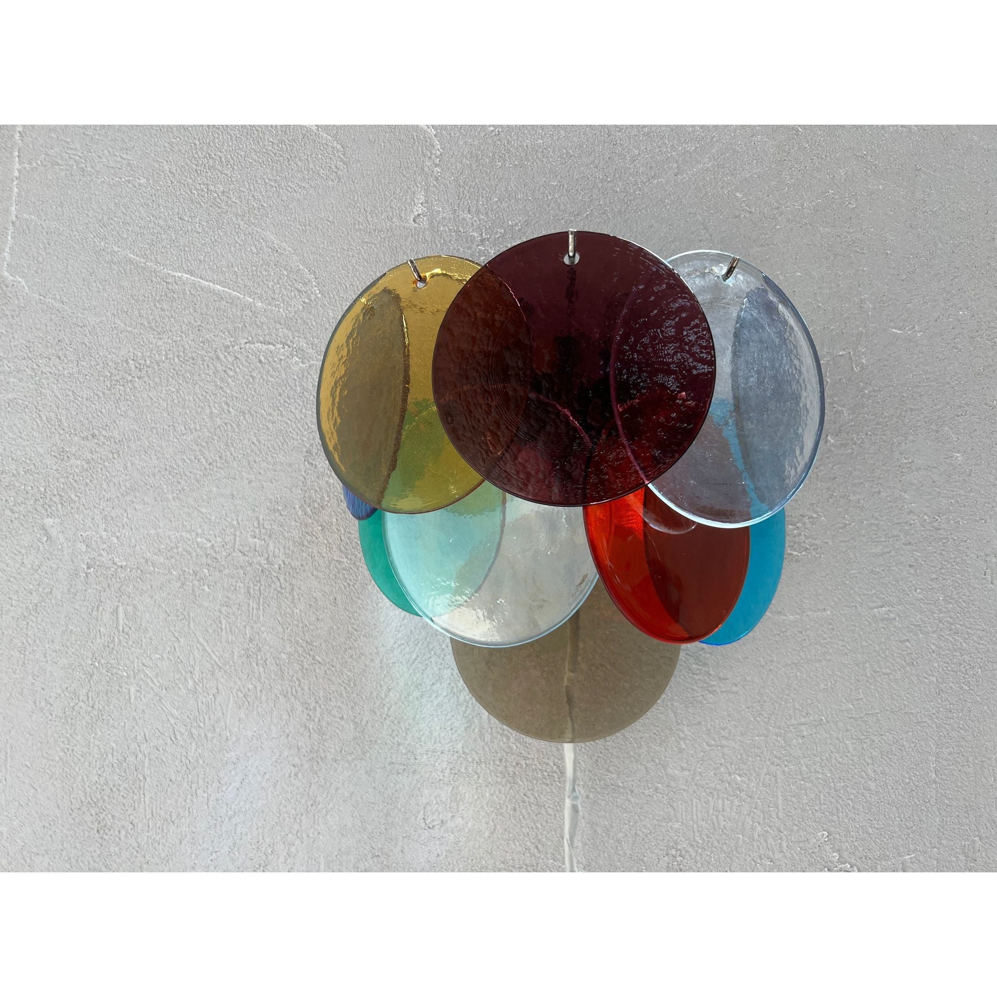 Stunning vintage Italian Murano Vistosi sconce, with 10 multi coloured Murano glass discs hanging on a metal frame.