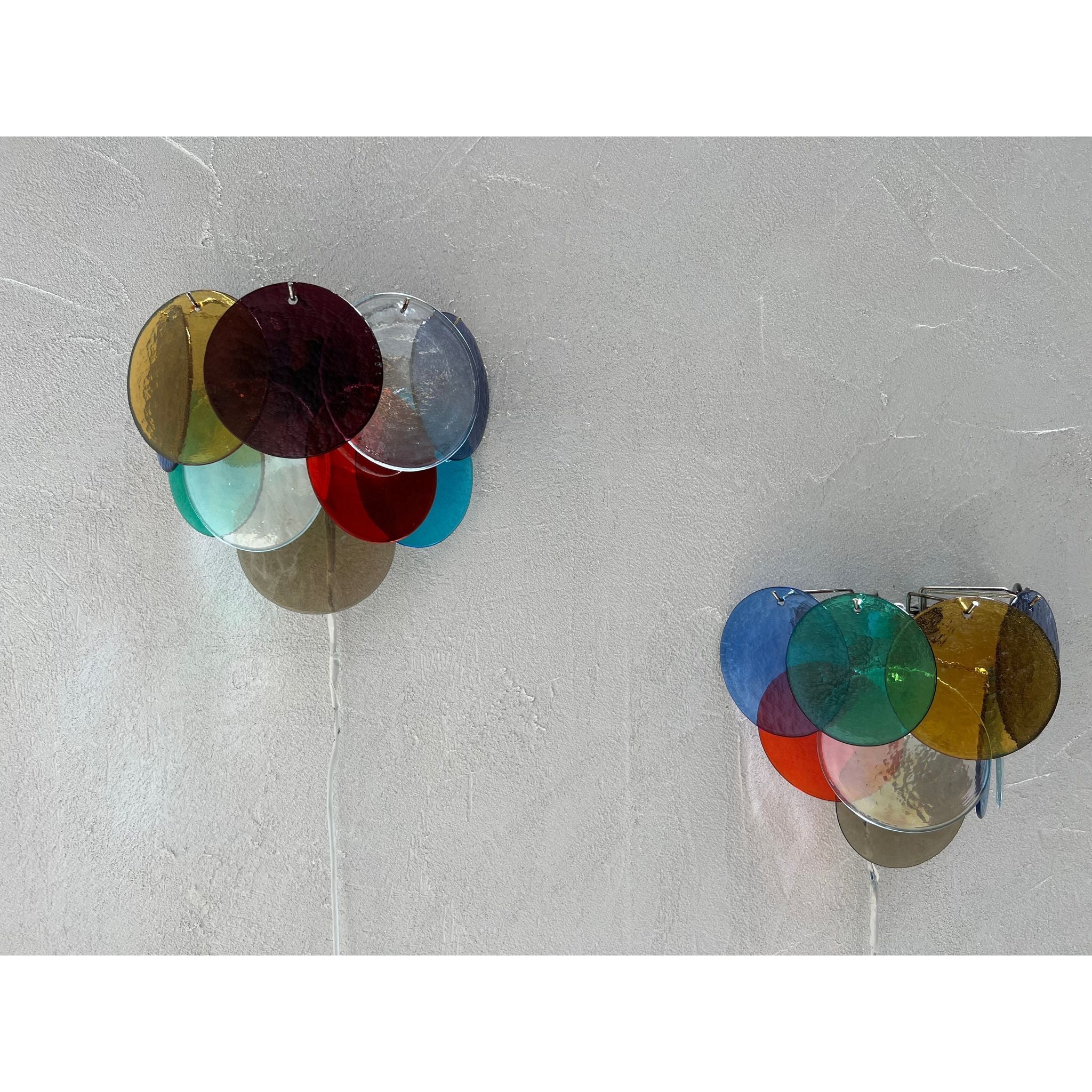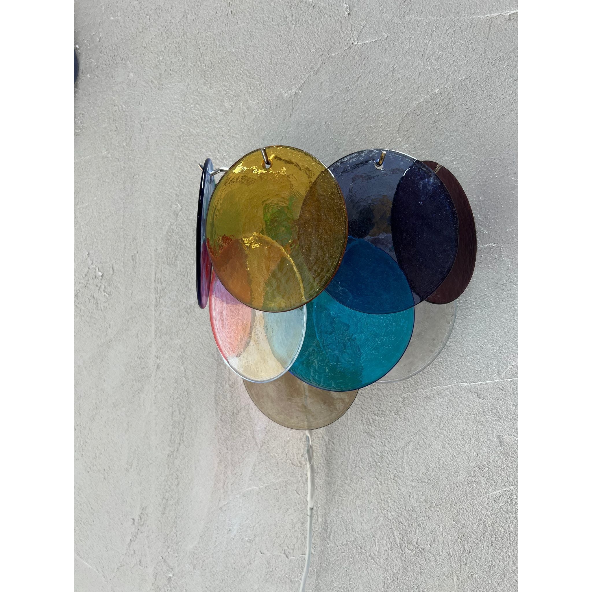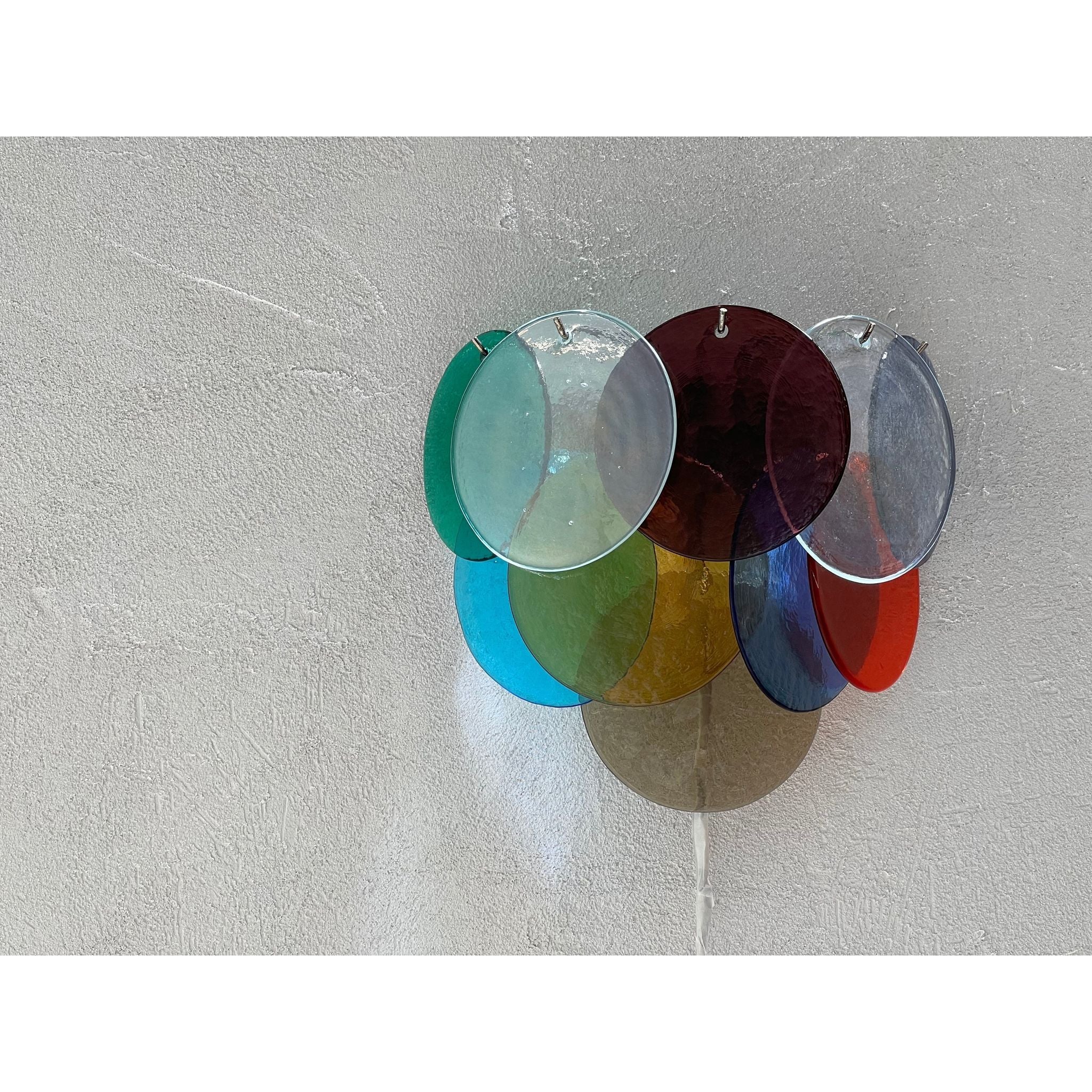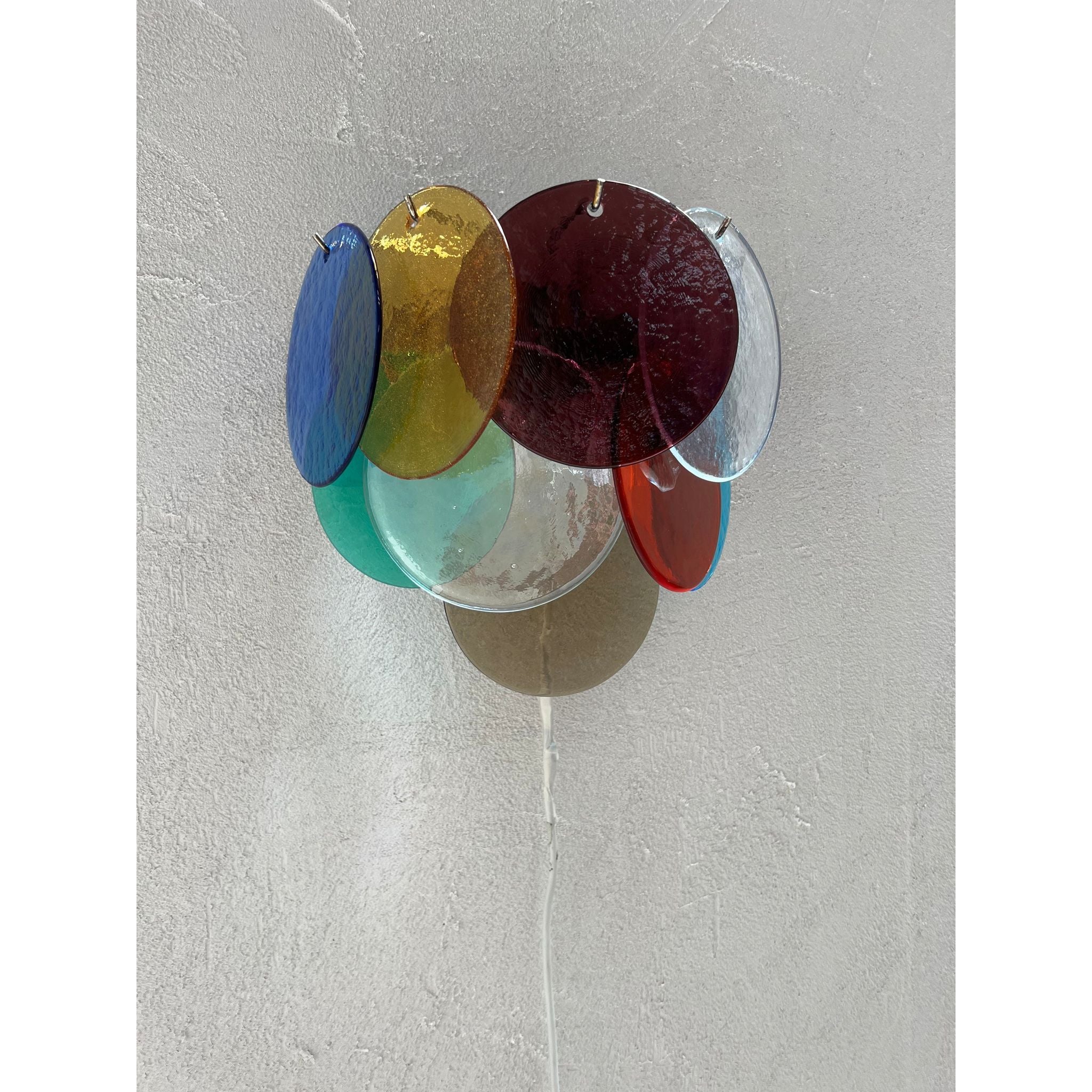 Stunning vintage Italian Murano Vistosi sconce, with 10 multi coloured Murano glass discs hanging on a metal frame.