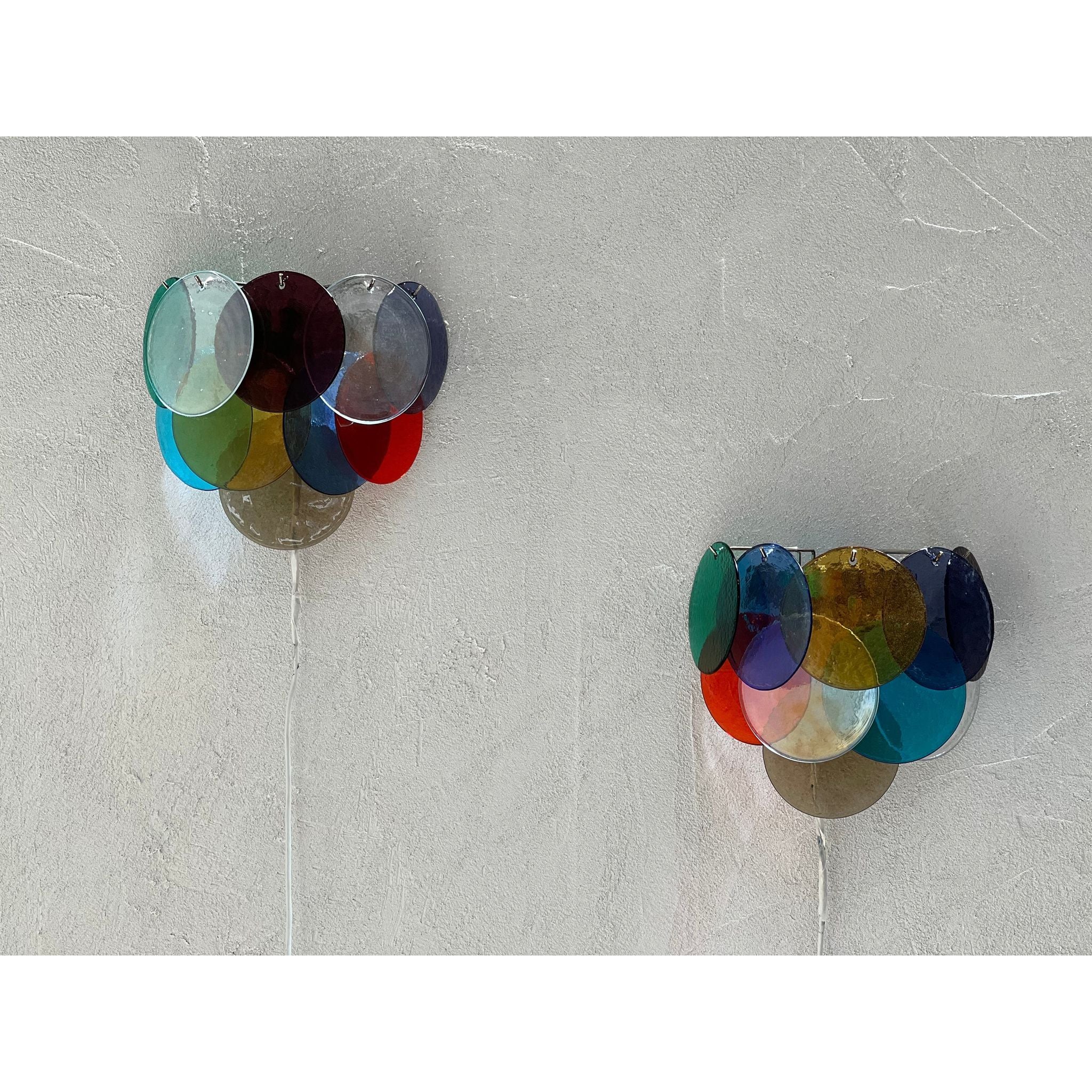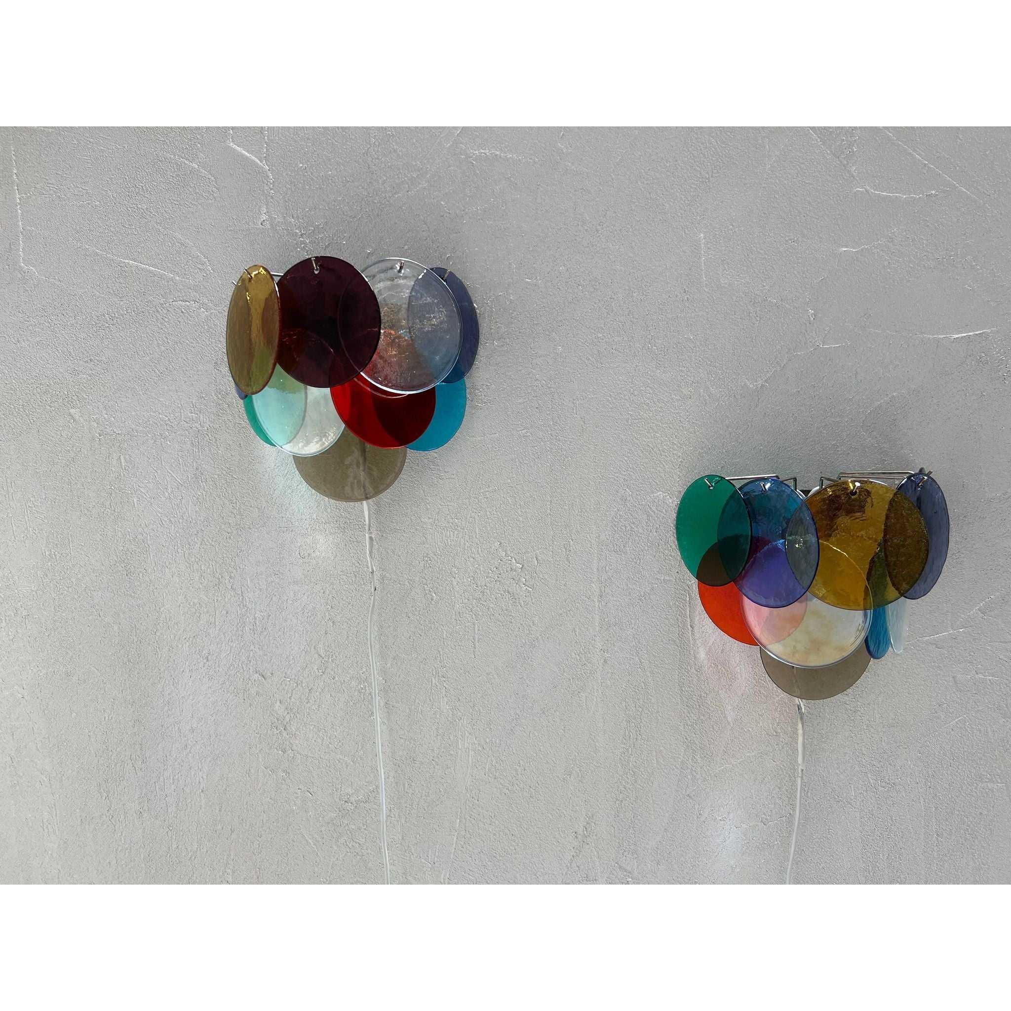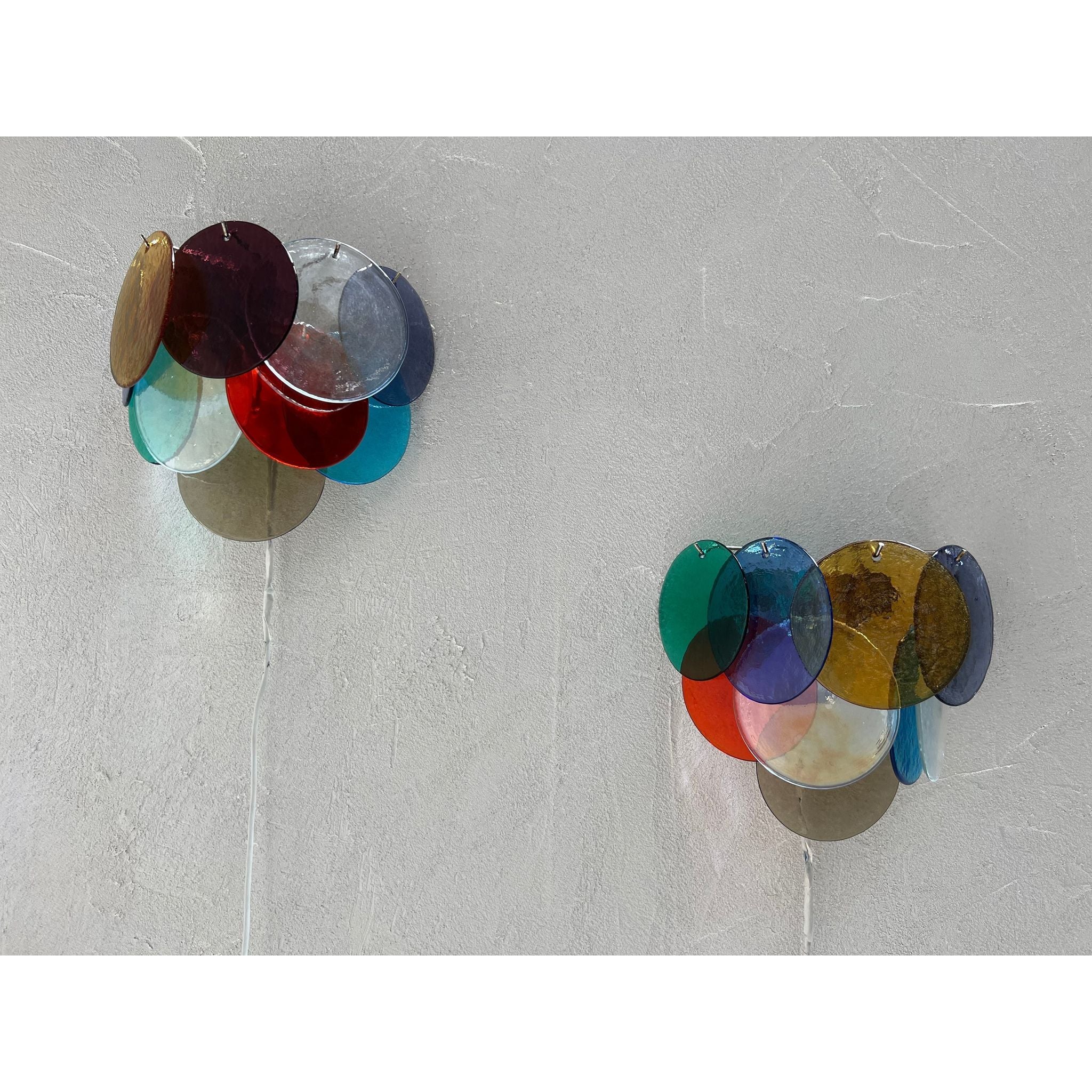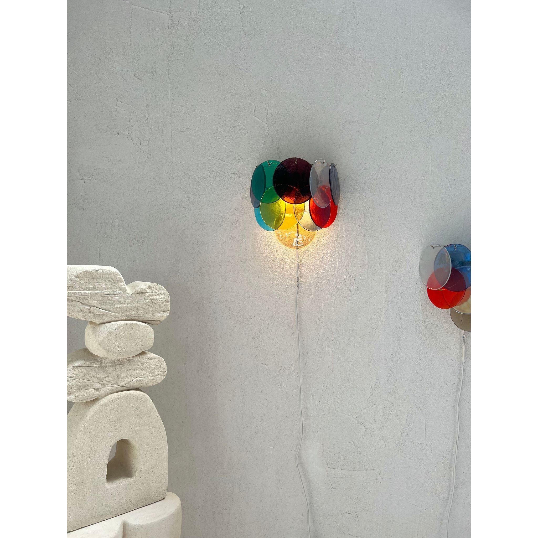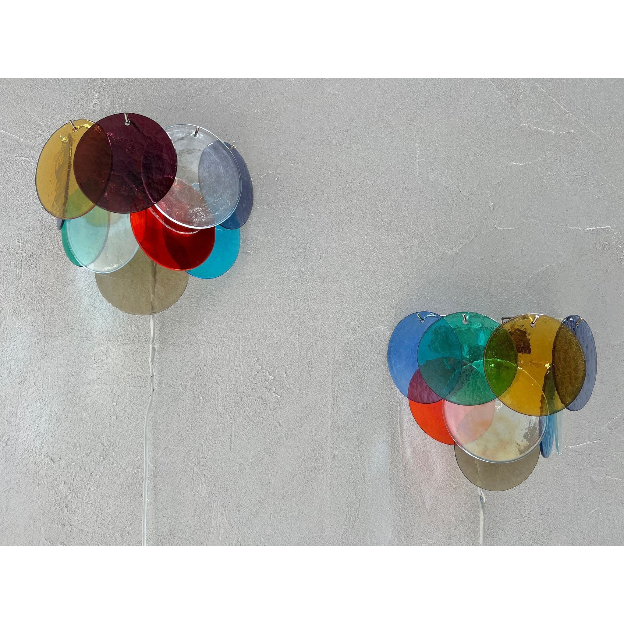 Stunning vintage Italian Murano Vistosi sconce, with 10 multi coloured Murano glass discs hanging on a metal frame.