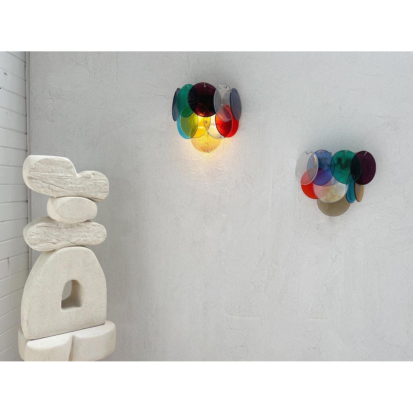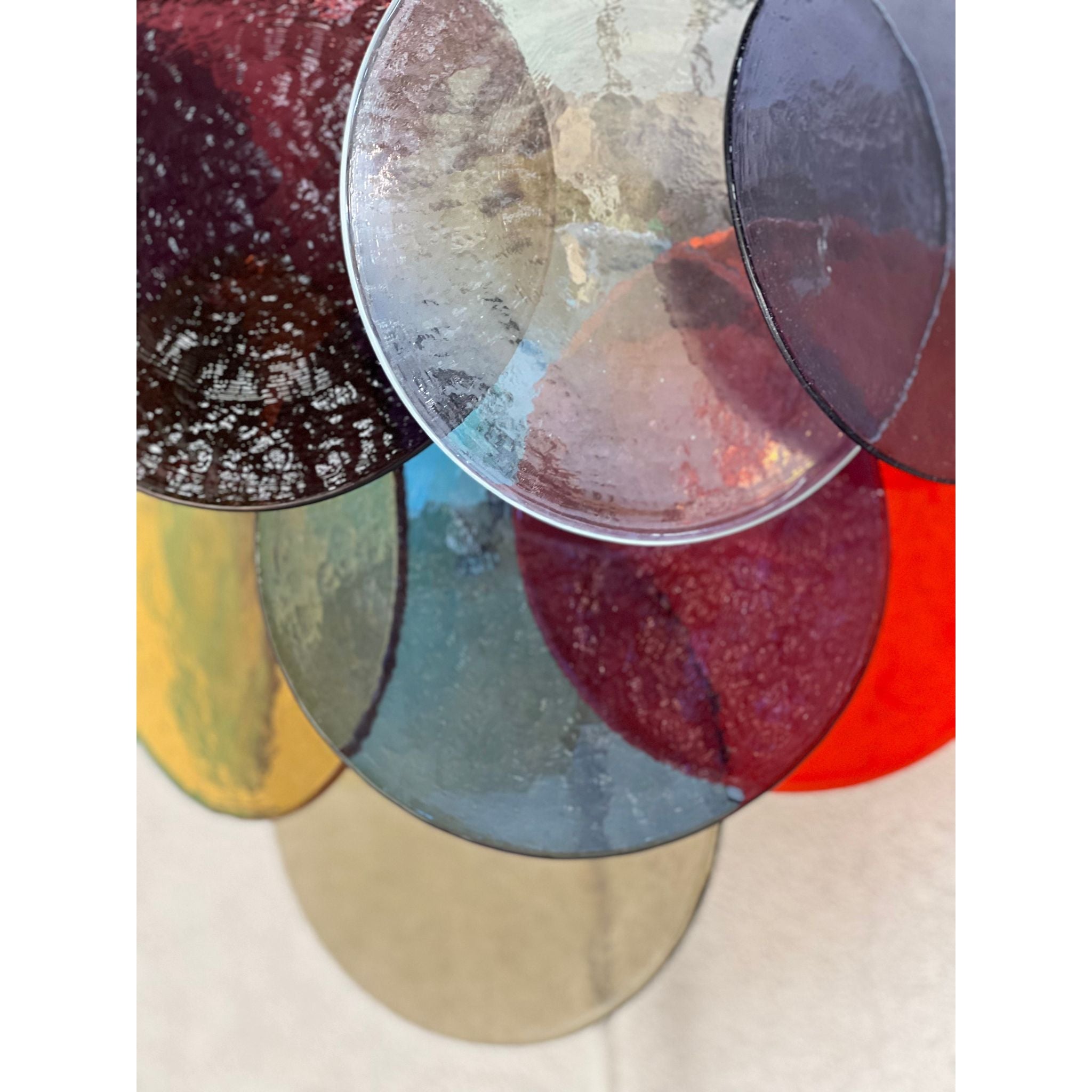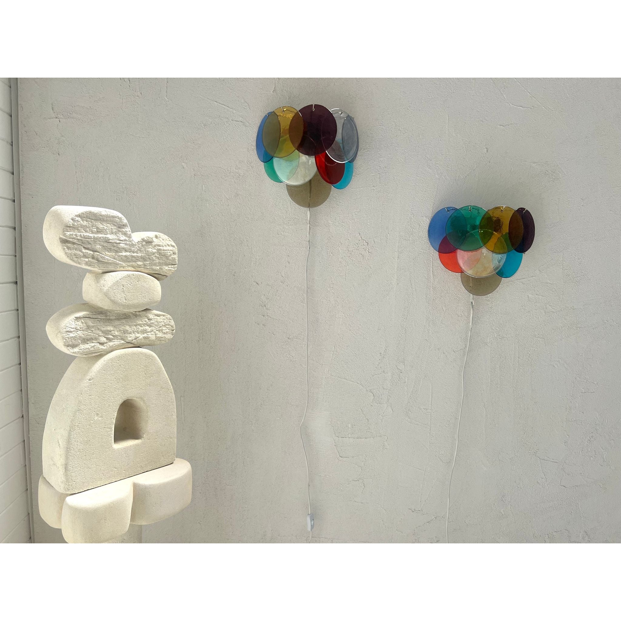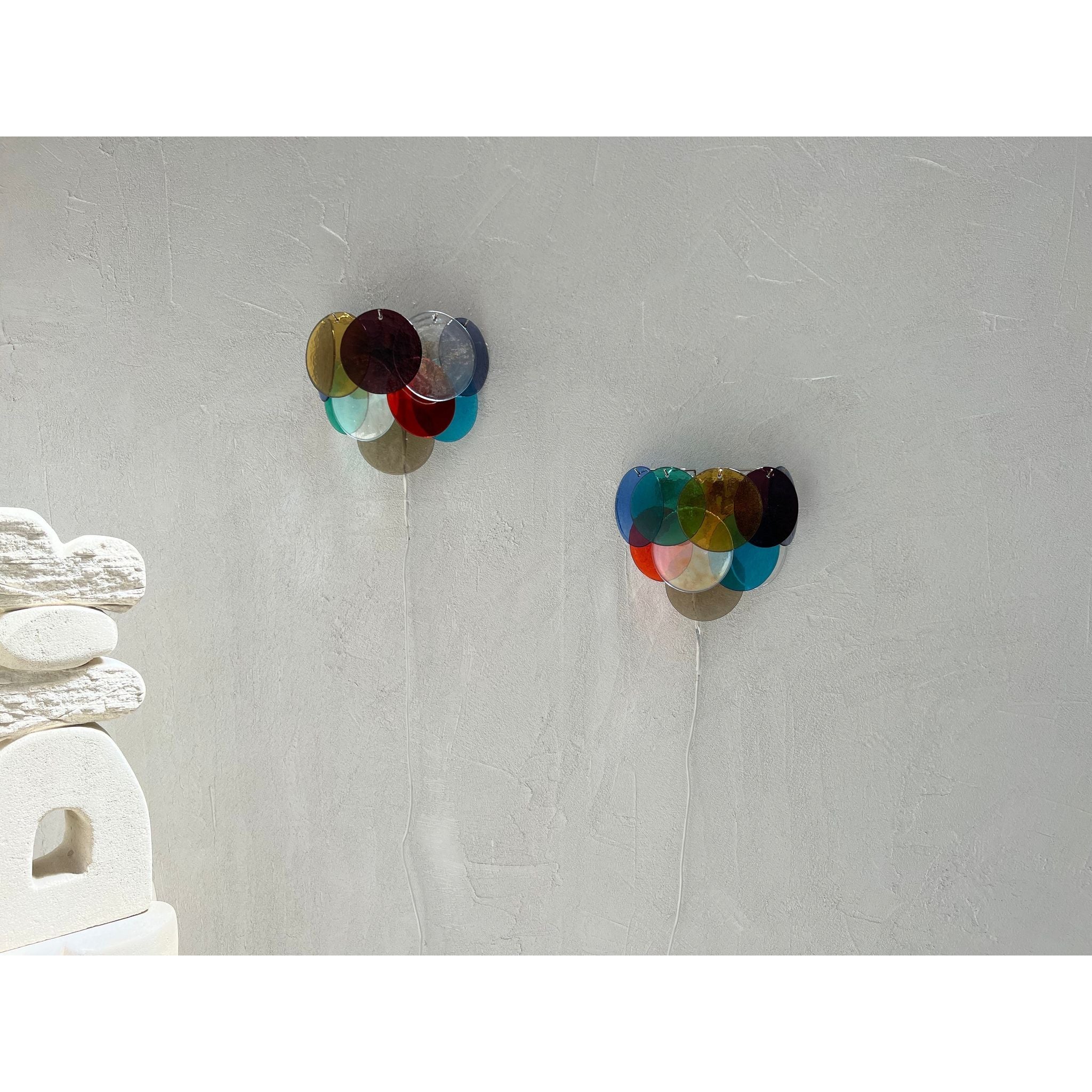 Stunning vintage Italian Murano Vistosi sconce, with 10 multi coloured Murano glass discs hanging on a metal frame.