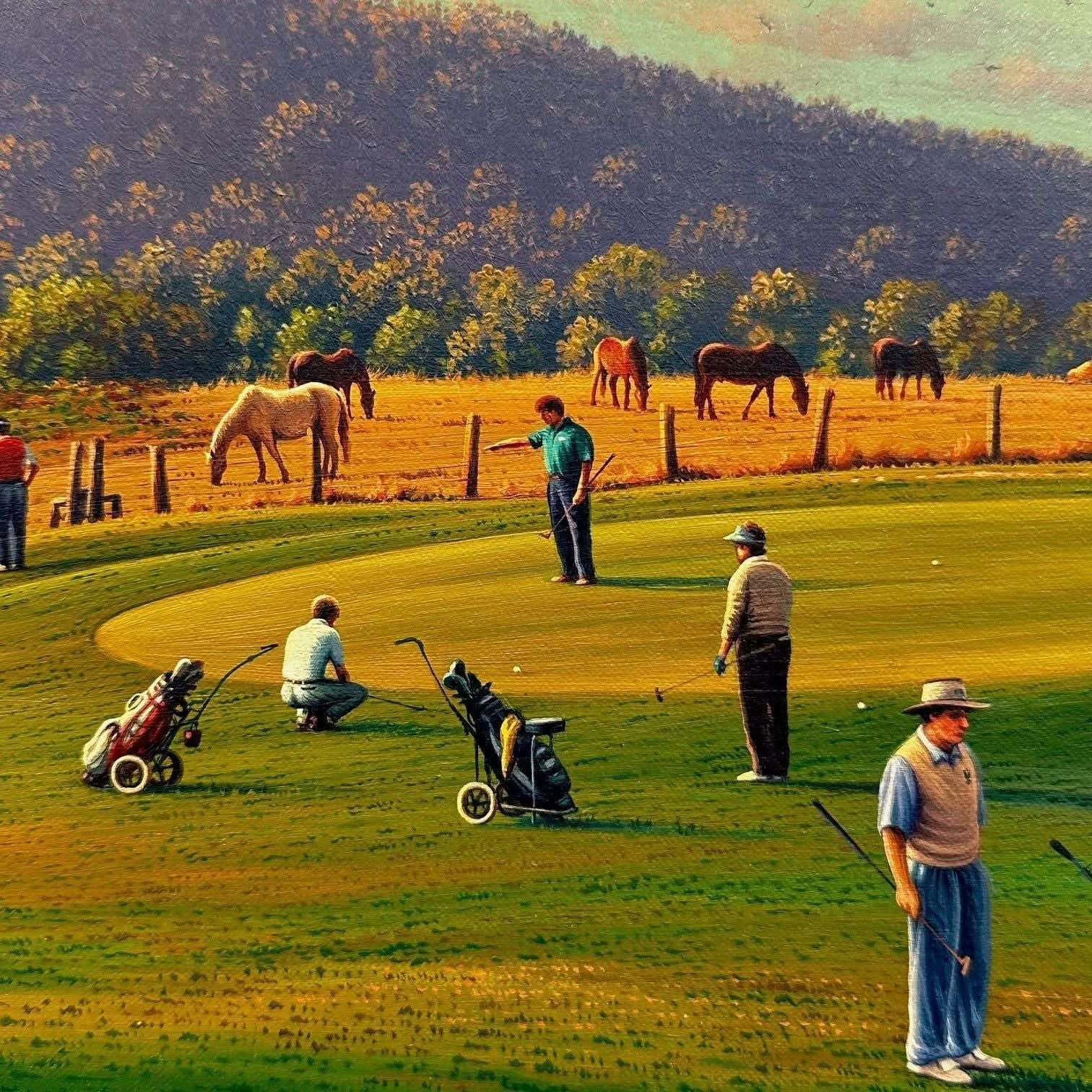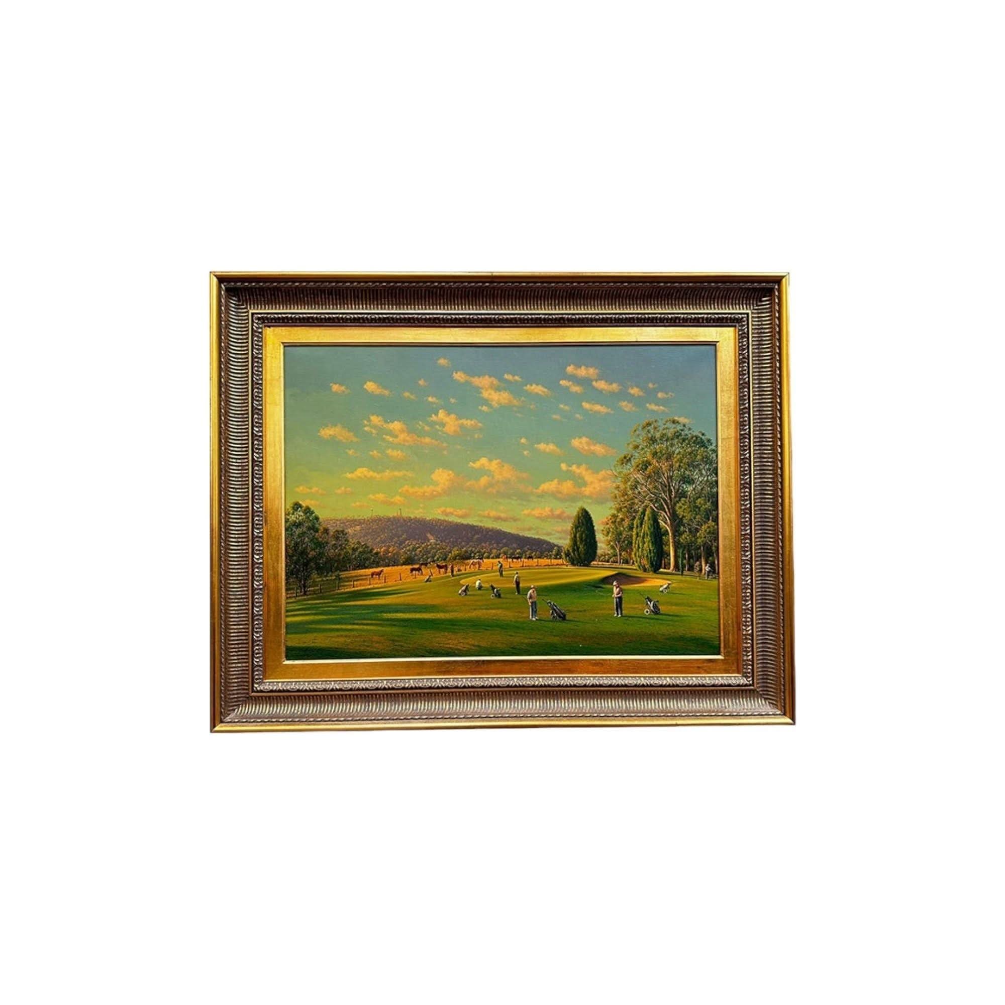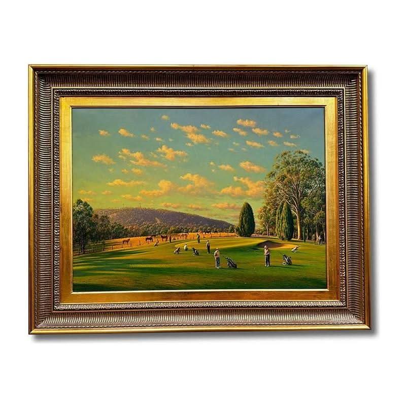 This painting depicts golfers at the Bowral Golf Club and is entitled “Out of Bounds”.