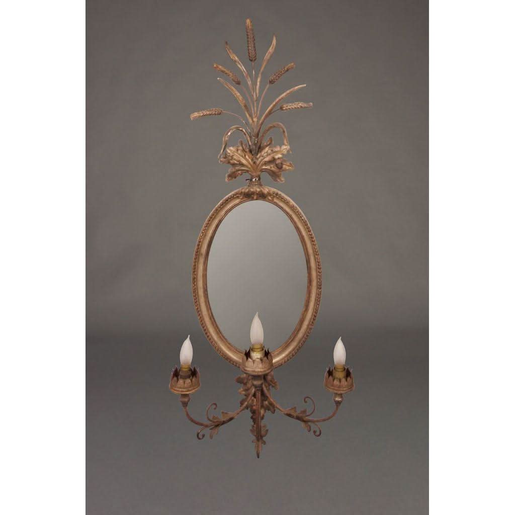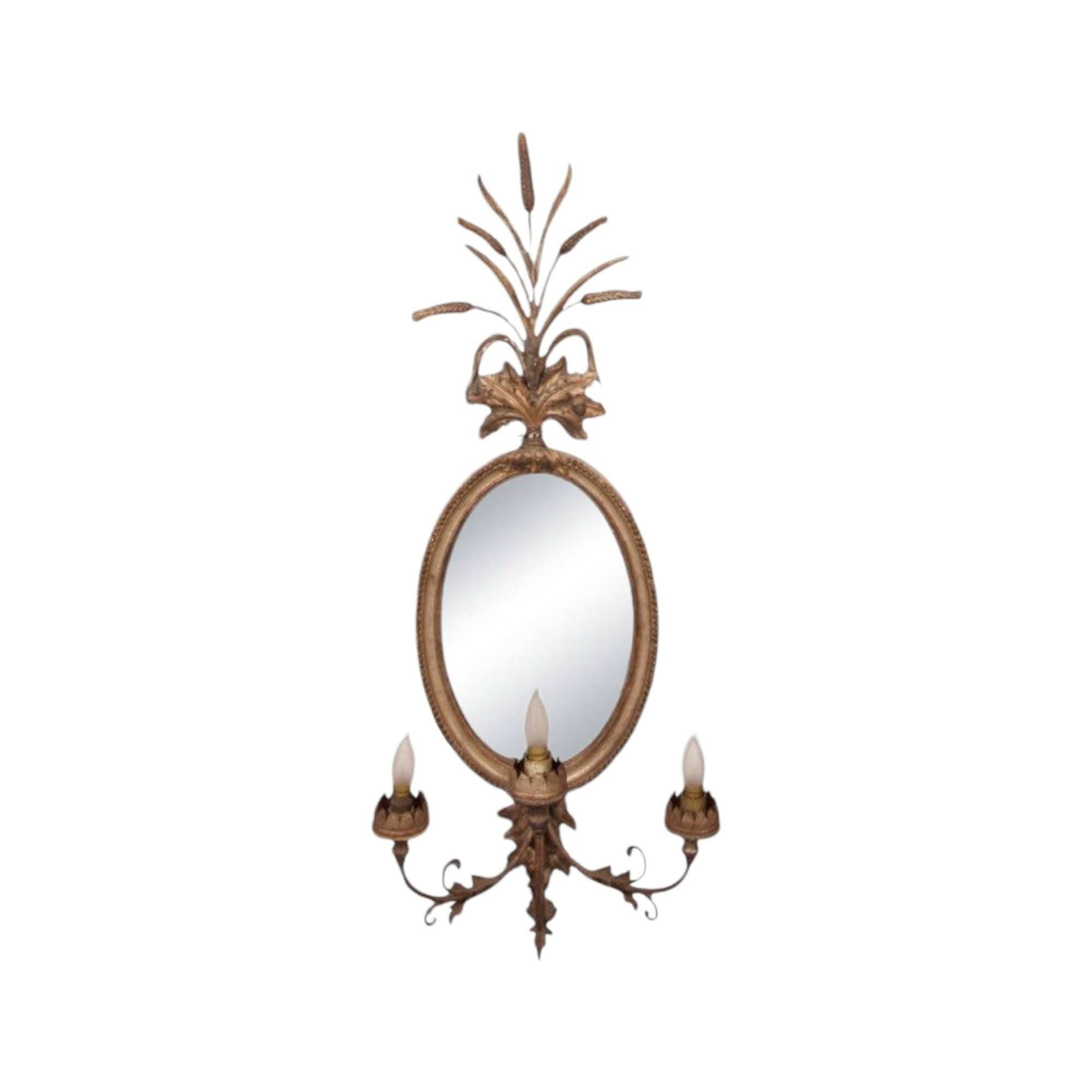 These are a lovely and rare Pair of 19th century Antique Italian Girandoles with their original oval mercury glass mirror plates and carved timber and silver gilt frames. They have later been converted to electricity. Timber framed with silver gilt over gesso and further embellished with foliate crest carvings and sheaths of wheat.. Sold as a pair only.